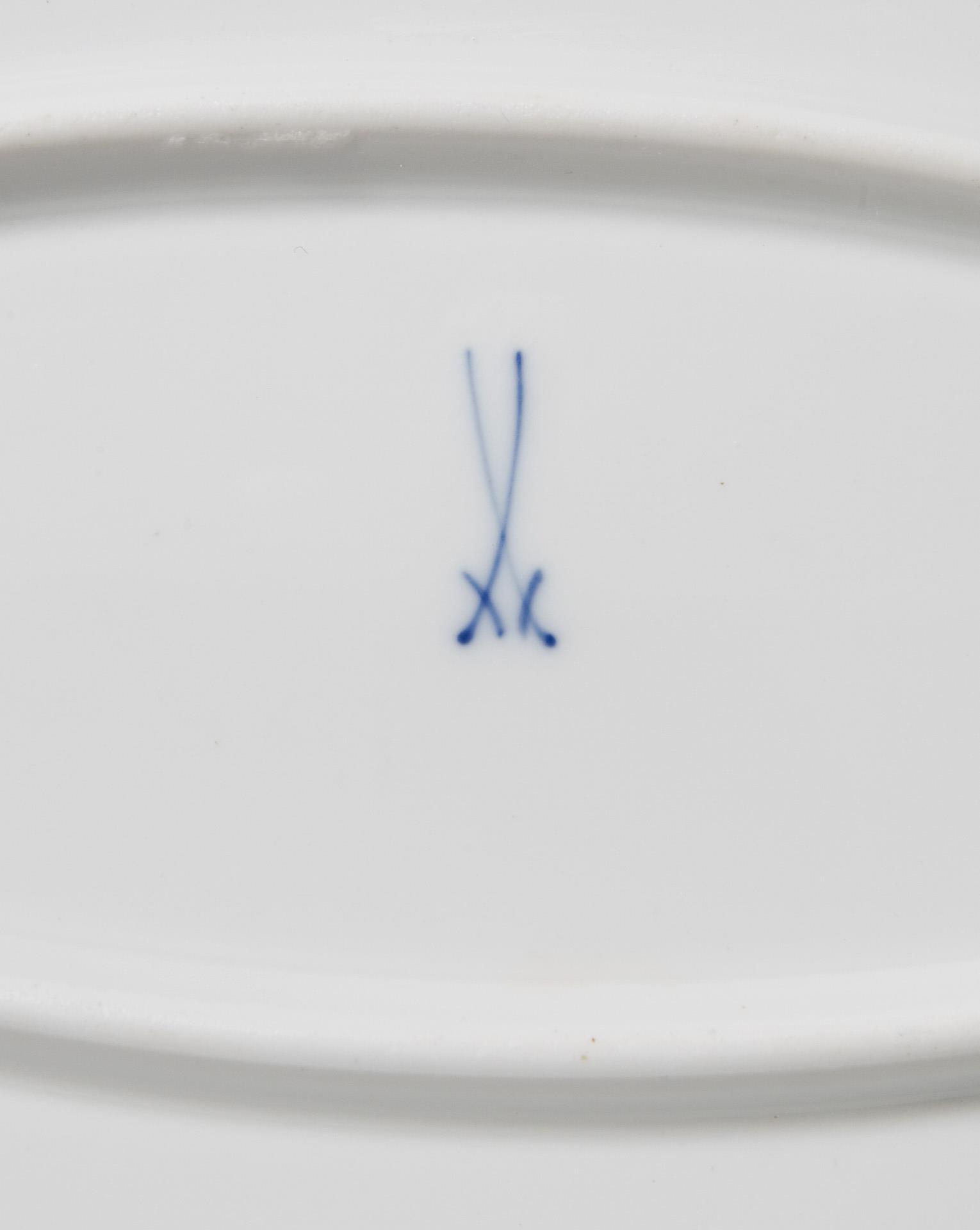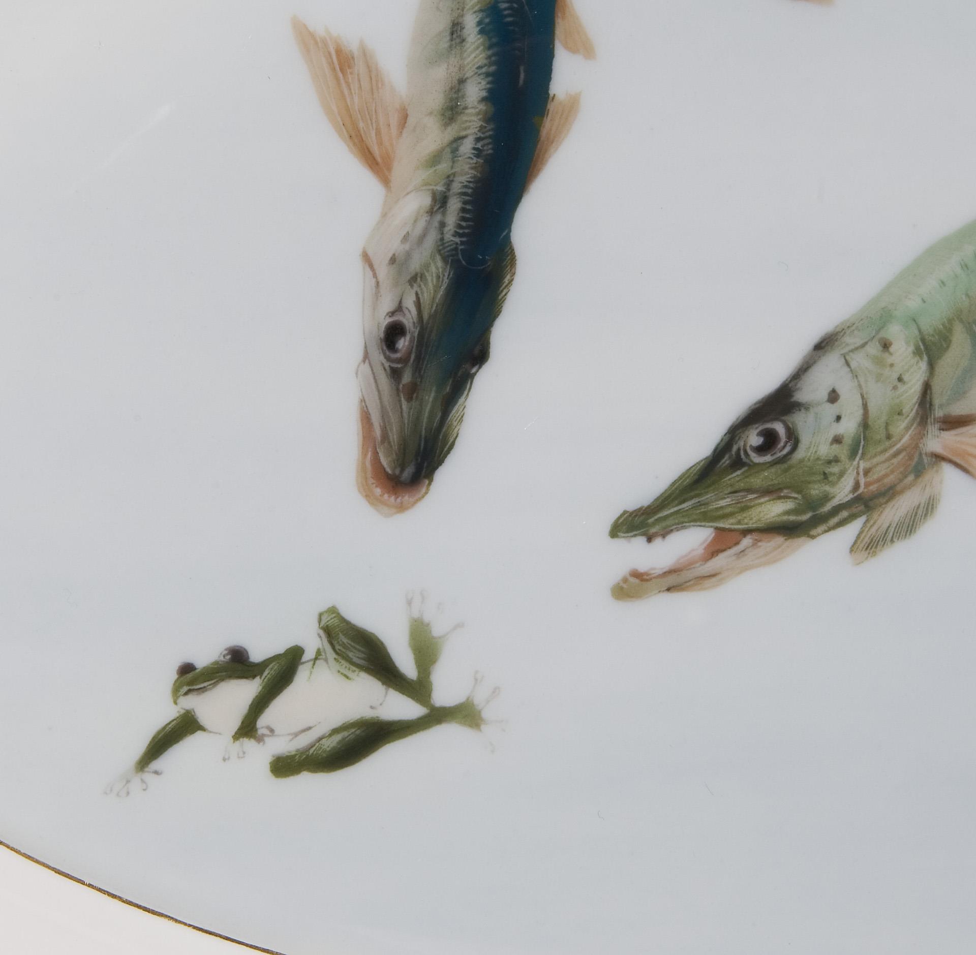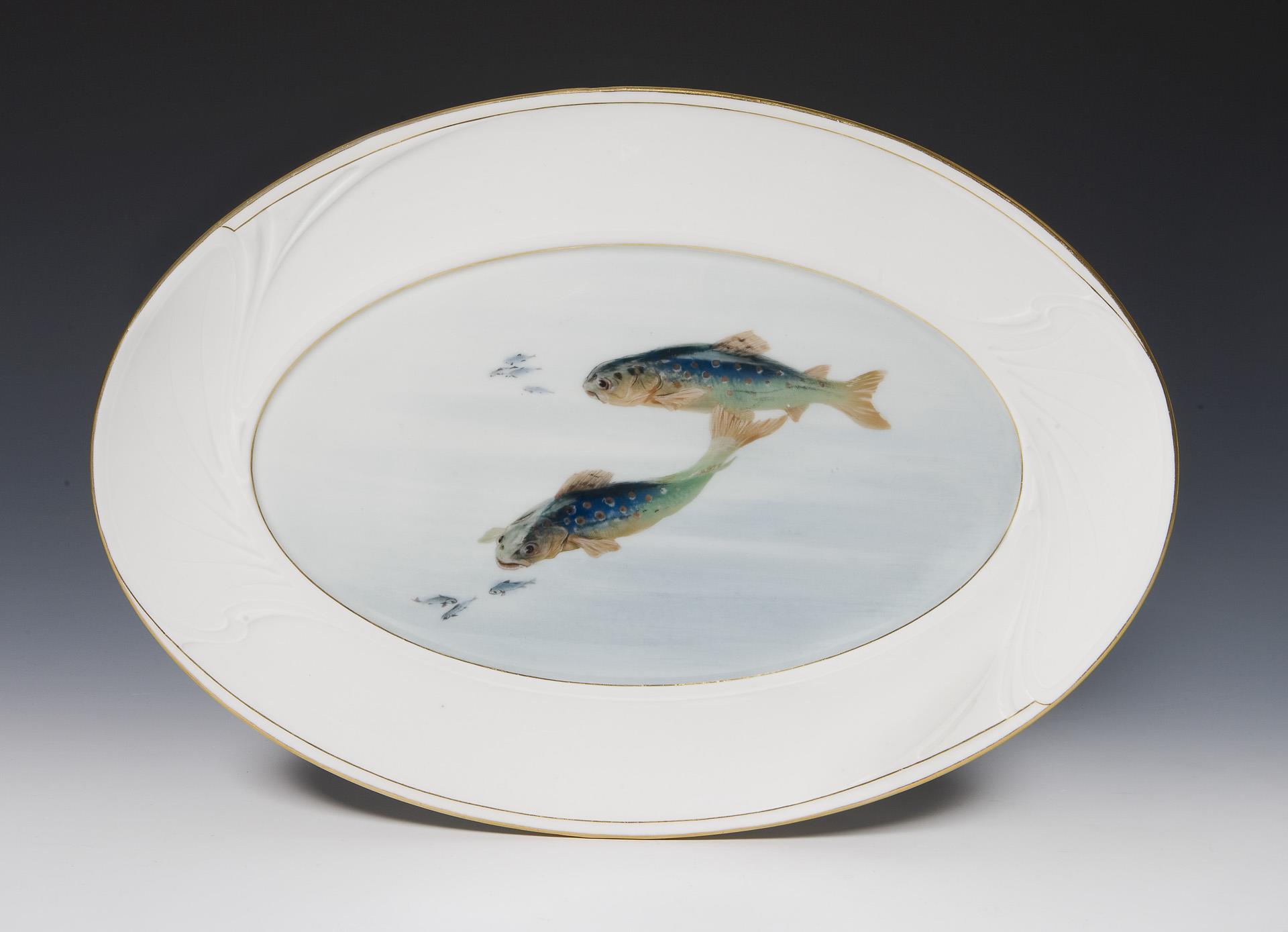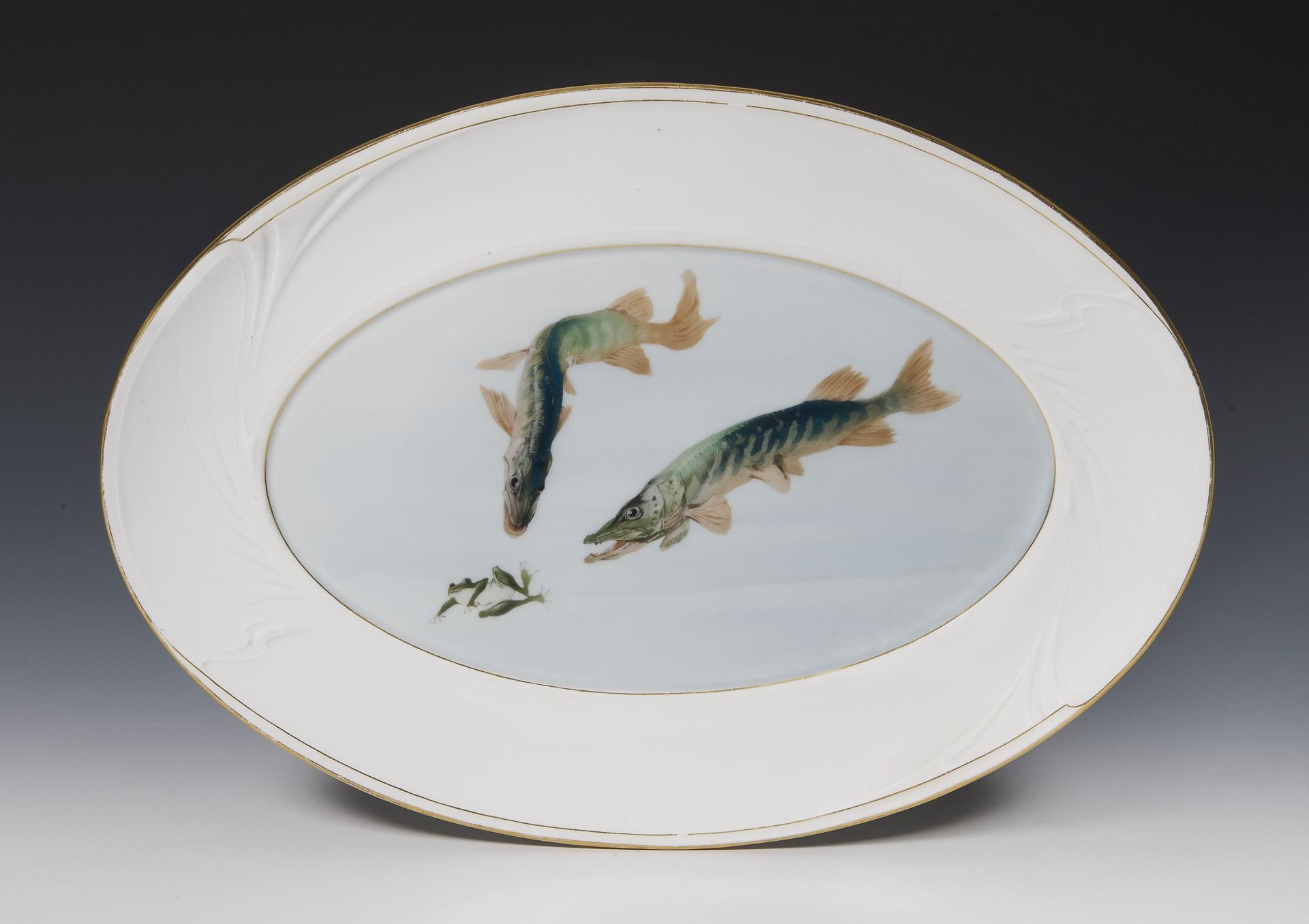 Modell-Jahr: 1904, farbige Unterglasurmalerei, "Fisch-Dekor" mit drei verschiedenen Motiven, reliefiert, gold staffiert. Pressmarken, Schwertermarken. Ein Goldfaden minimal berieben.
