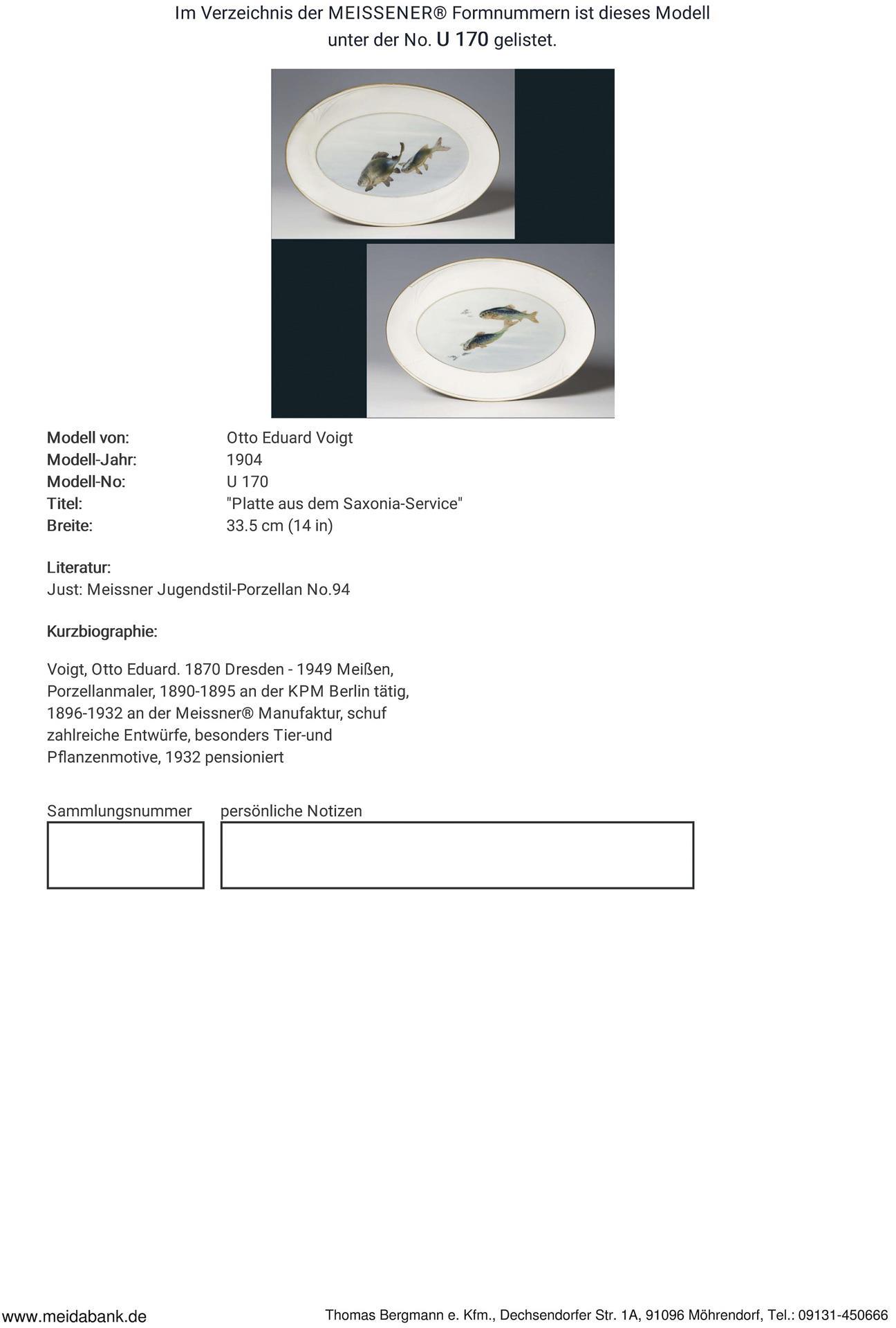 Voigt, Porzellanmaler, 1890-1895 an der KPM Berlin tätig, 1896-1932 an der Manufaktur Meissen, schuf zahlreiche Entwürfe, besonders Tier- und Pflanzenmotive, * Partnerauktion Bergmann.