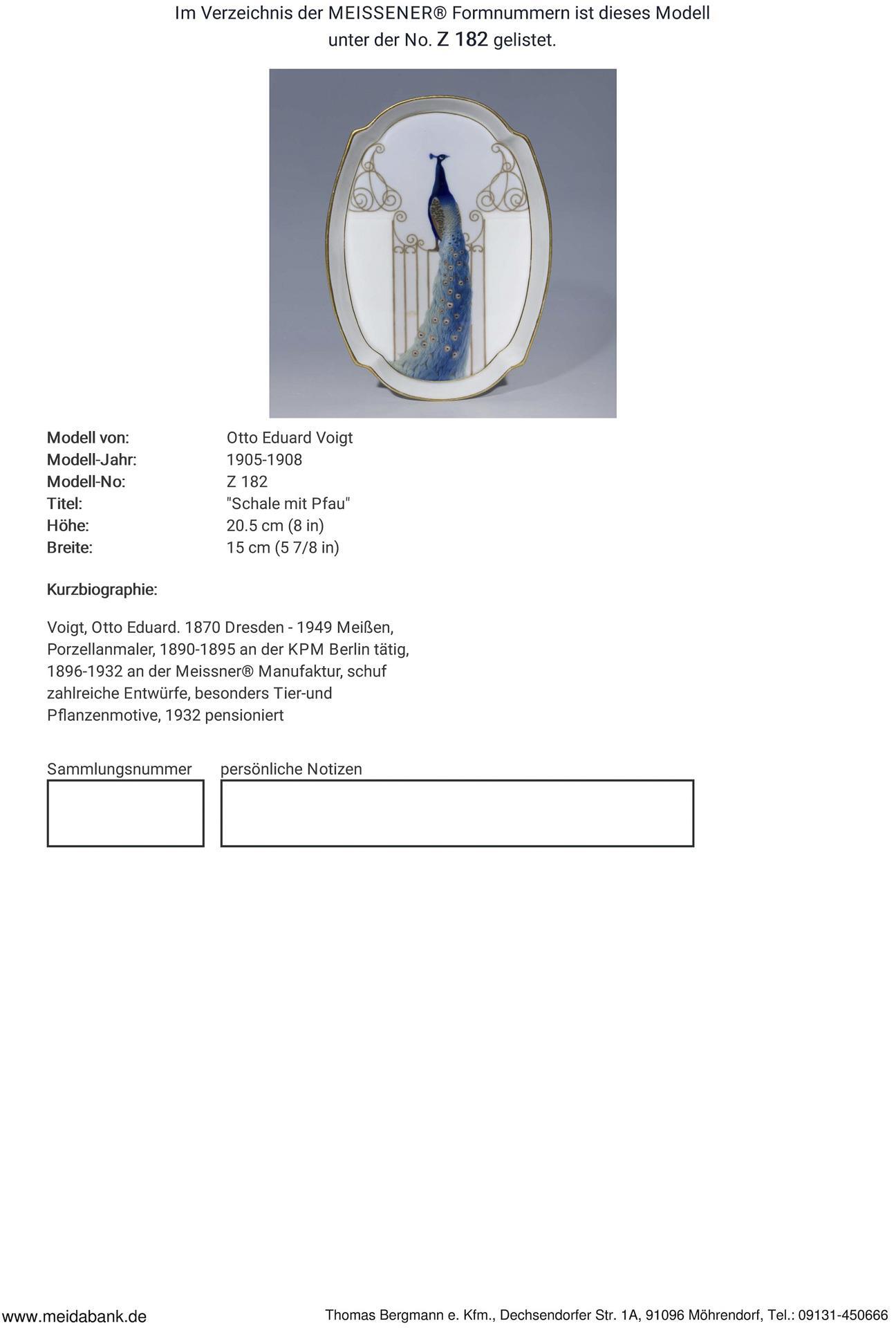 Voigt, Porzellanmaler, 1890-1895 an der KPM Berlin tätig, 1896-1932 an der Manufaktur Meissen, schuf zahlreiche Entwürfe, besonders Tier- und Pflanzenmotive, * Partnerauktion Bergmann.