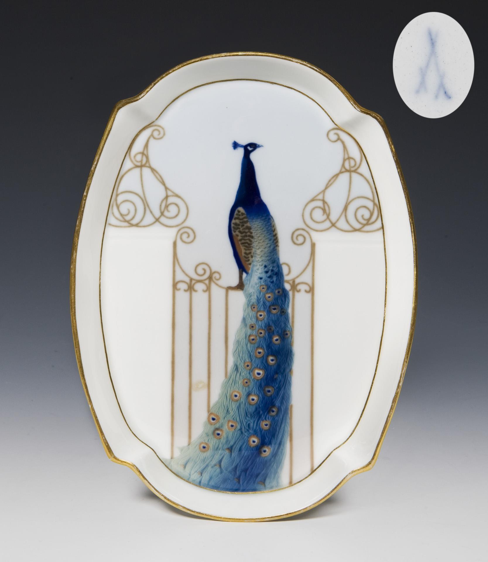 Seltenes Jugendstil-Plateau mit Pfau. Meissen.