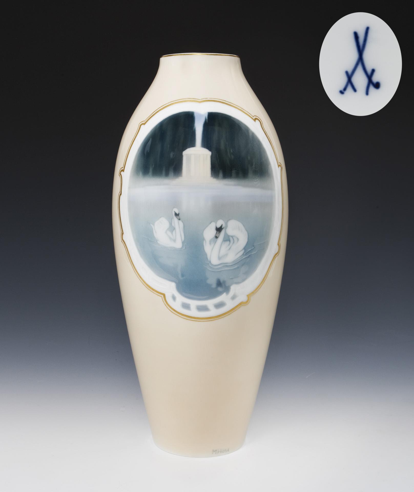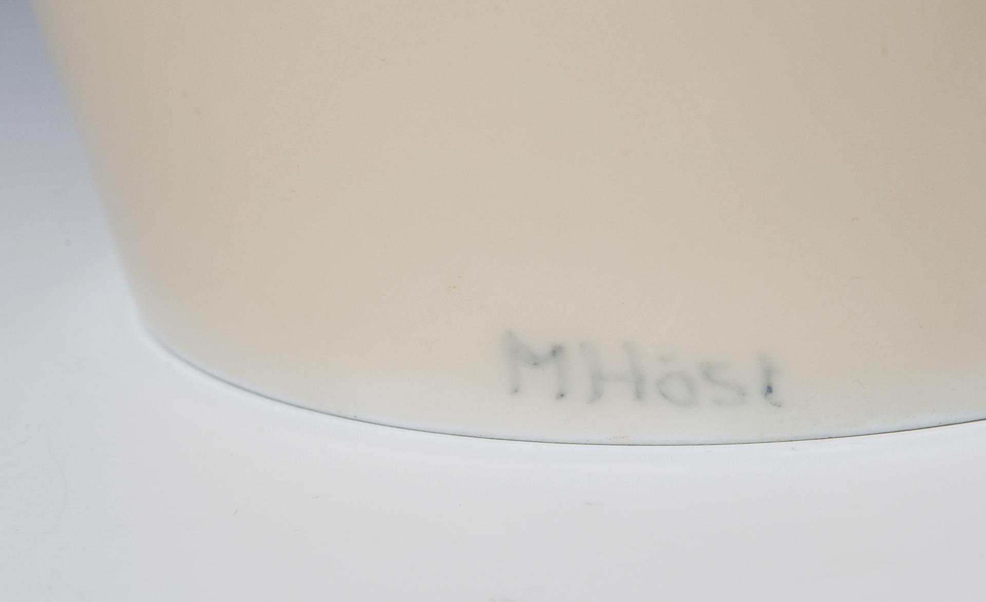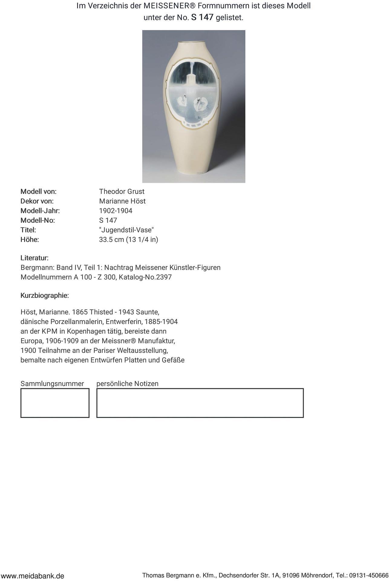 Form-Modell von Theodor Grust. Modell-Jahr: 1902-1904, Dekor von Marianne Höst, signiert. Sandfarbener Fond, frontal farbige, rückseitig kobaltblaue Unterglasurbemalung, Goldstaffage. Ritzmarke, Pressmarke, Schwertermarke, Künstler-Signet. Kleiner Glasurdefekt am Mündungsrand.