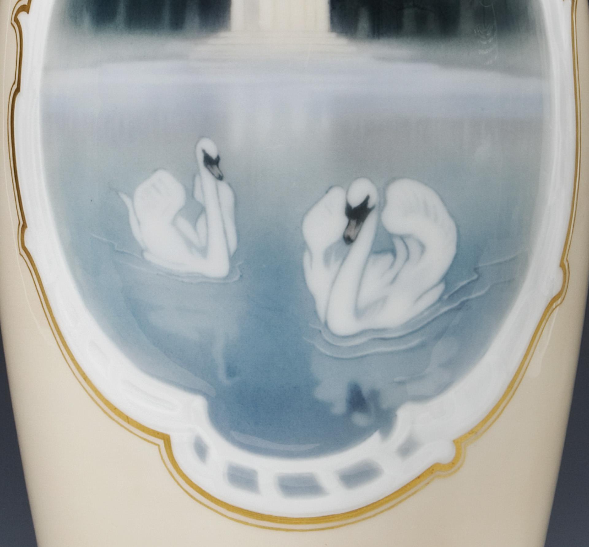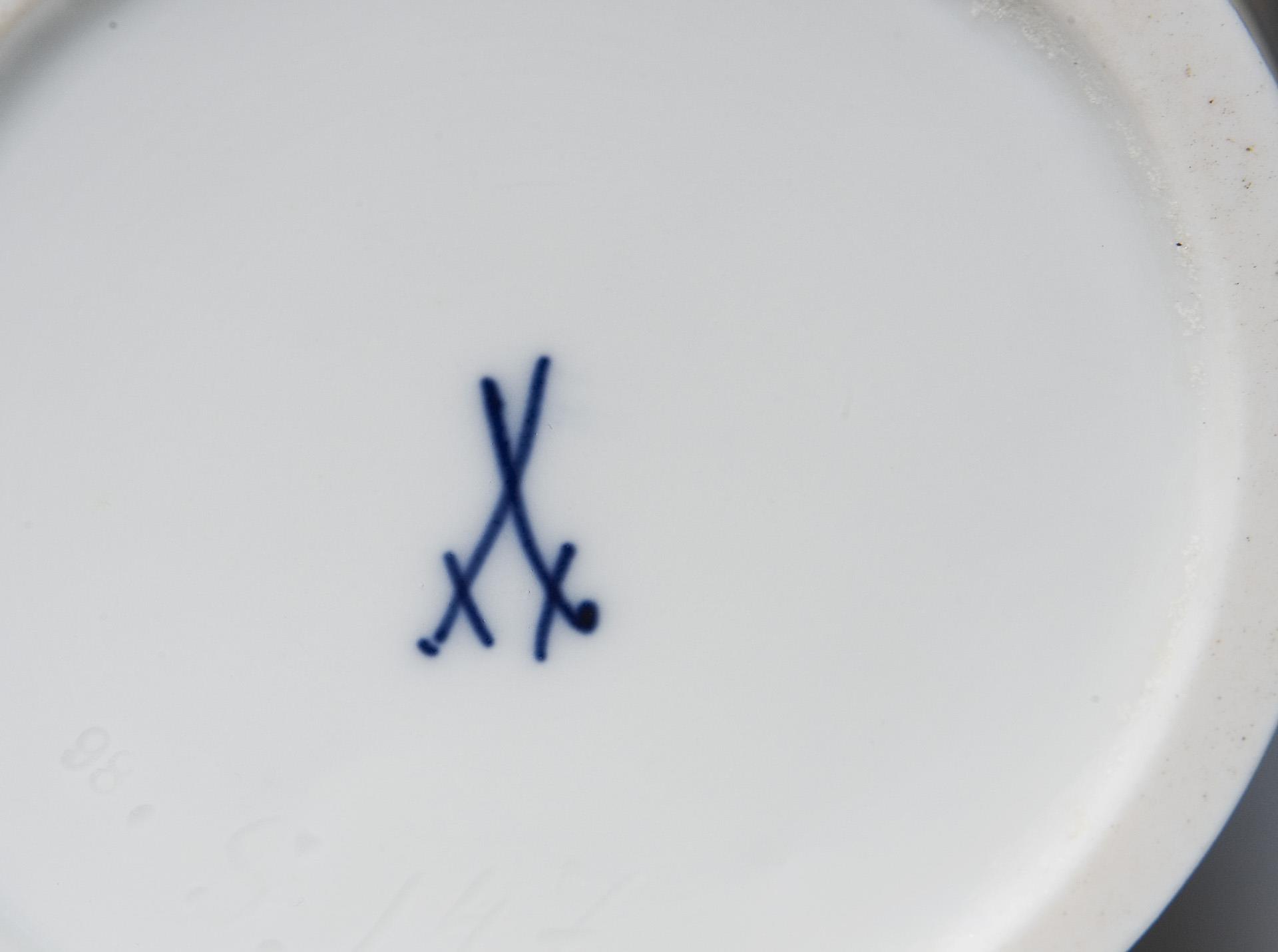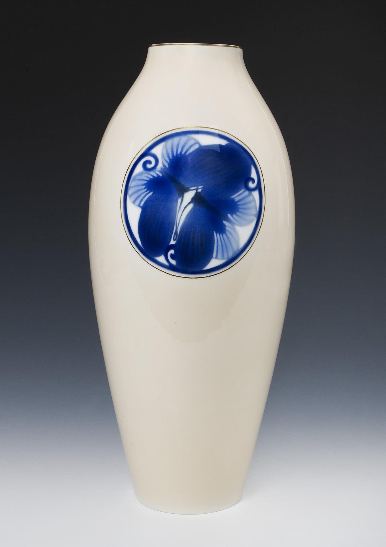 Form-Modell von Theodor Grust. Modell-Jahr: 1902-1904, Dekor von Marianne Höst, signiert. Sandfarbener Fond, frontal farbige, rückseitig kobaltblaue Unterglasurbemalung, Goldstaffage. Ritzmarke, Pressmarke, Schwertermarke, Künstler-Signet. Kleiner Glasurdefekt am Mündungsrand.