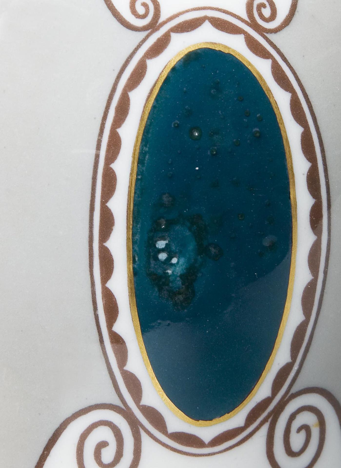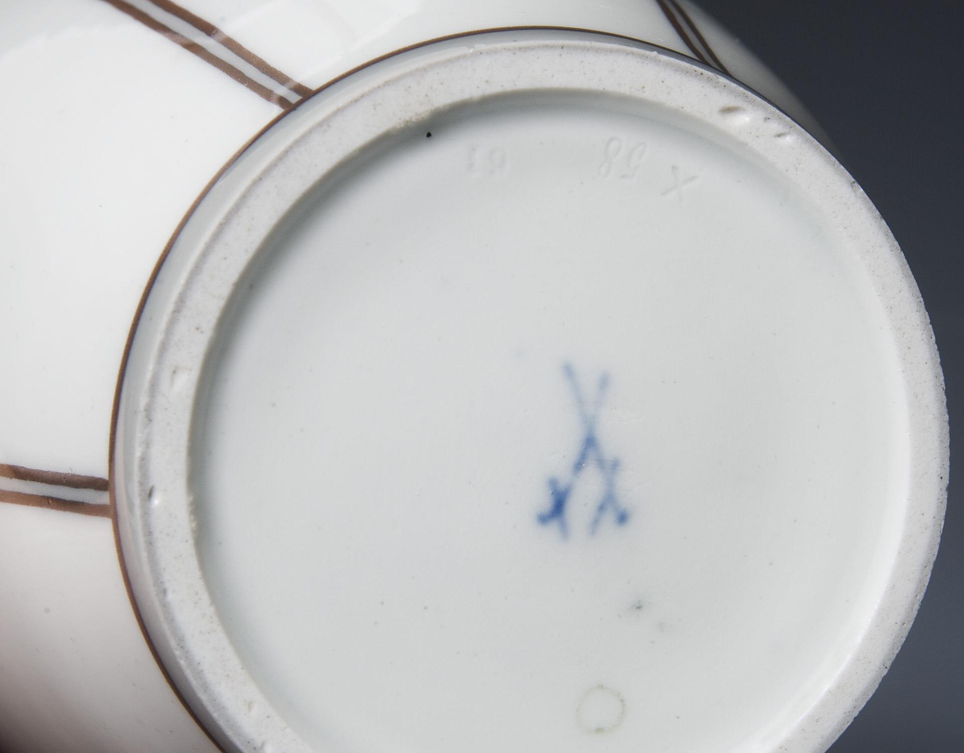 Form-Modell von Carl Gotthelf Habenicht und Mitarbeiter, Modell-Jahr: 1844-1847 (Form). Farbige Unterglasurmalerei, gold schattiert. Pressmarken, Schwertermarke zweimal gestrichen. Glasurdefekt in einem grünen Medaillon.