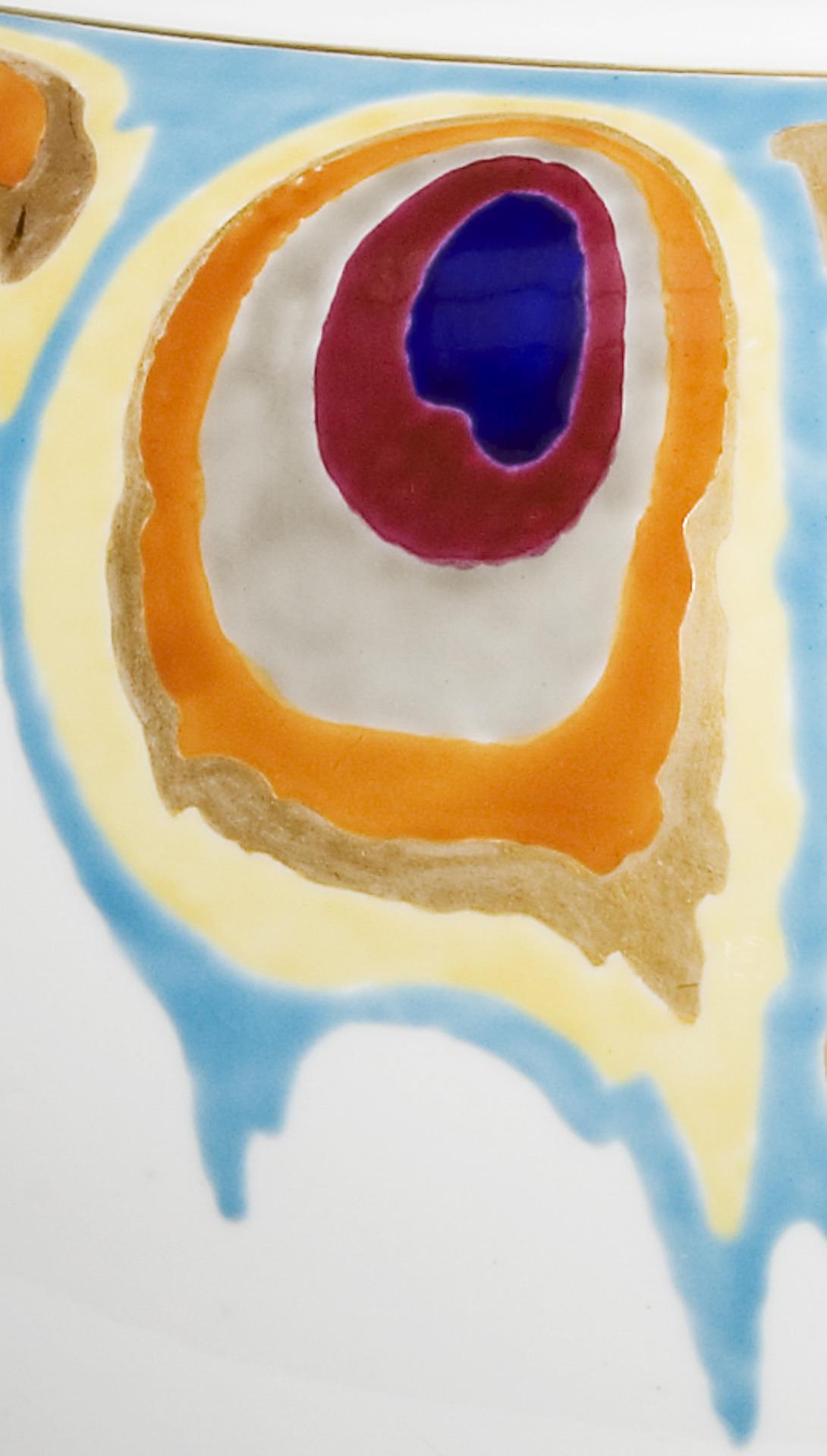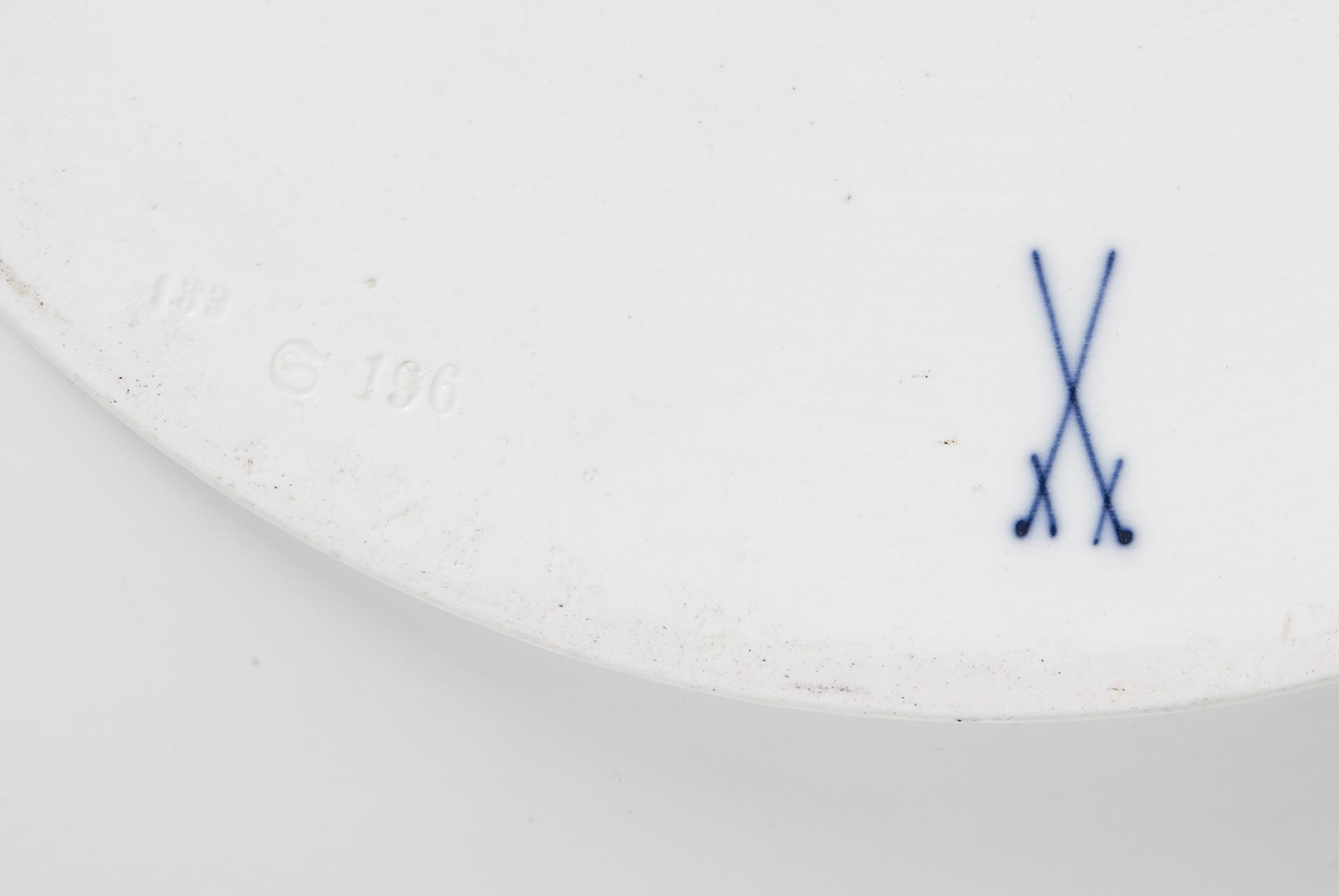 Modell-Jahr: 1902-1904, ornamentale farbige Massemalerei, gold schattiert, gold staffierte Ränder. Unglasierter Boden, Pressmarken, Schwertermarke. Kleiner Kratzer, weinige Glasurpünktchen.