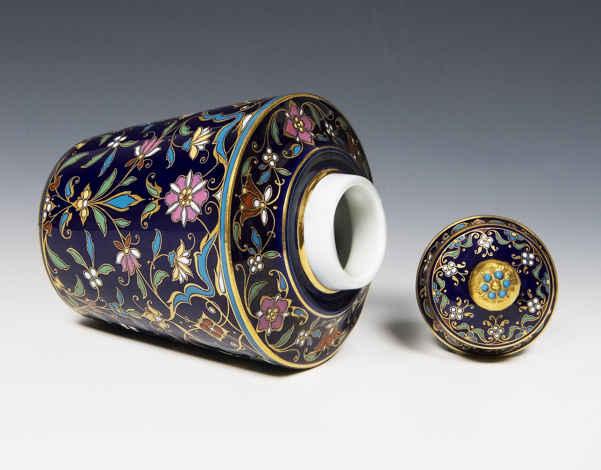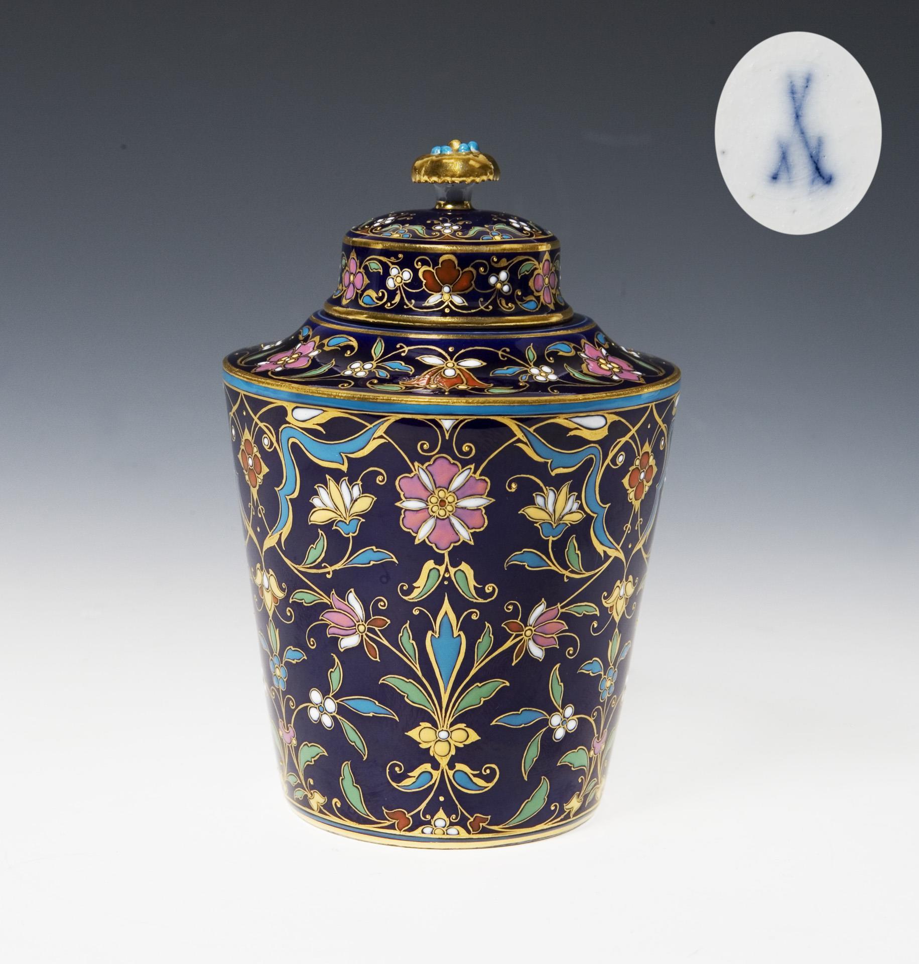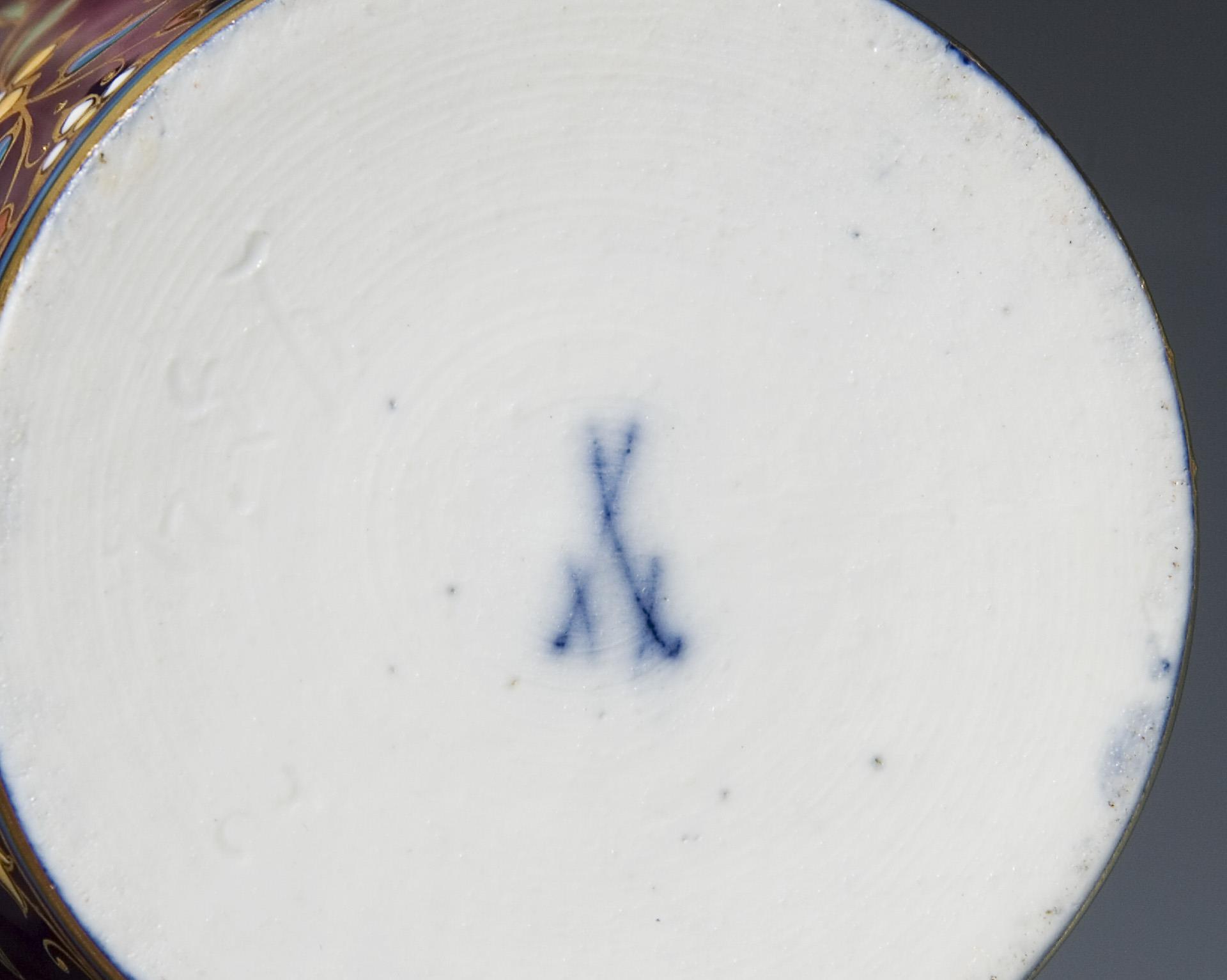 Form-Modell von Christian Gottfried Jüchtzer und Mitarbeiter, Modell-Jahr: 1798-1800 (Form). Sehr feine farbige Bemalung über kobaltblauem Fond, gold konturiert, gold staffiert. Unglasierter Boden, Ritzmarke, Pressmarke, Schwertermarke.