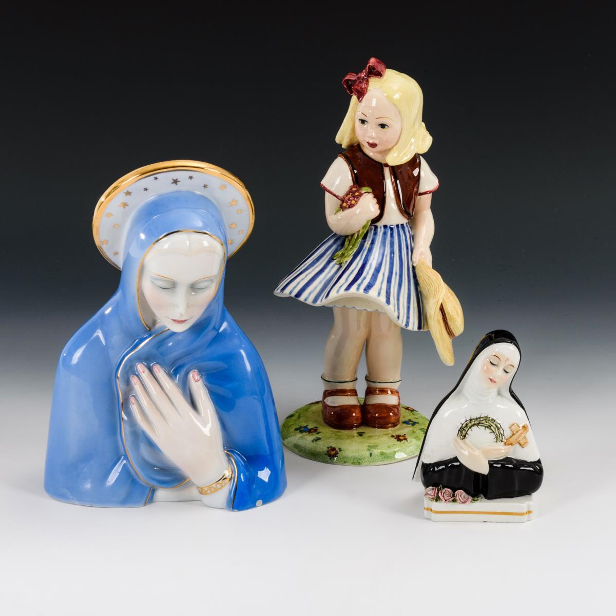 Ronzan: Madonna mit Heiligenschein und blauem Schleier (H 24,5 cm). Nonnenbüste mit Dornenkranz, Kreuz und Rosen (H 12,5 cm). Lenci: Auf einem Blumensockel stehendes Mädchen in volkstümlicher Bekleidung (H 28,5 cm). Partiell gechipped, Nonne am Kopf minimal restauriert.