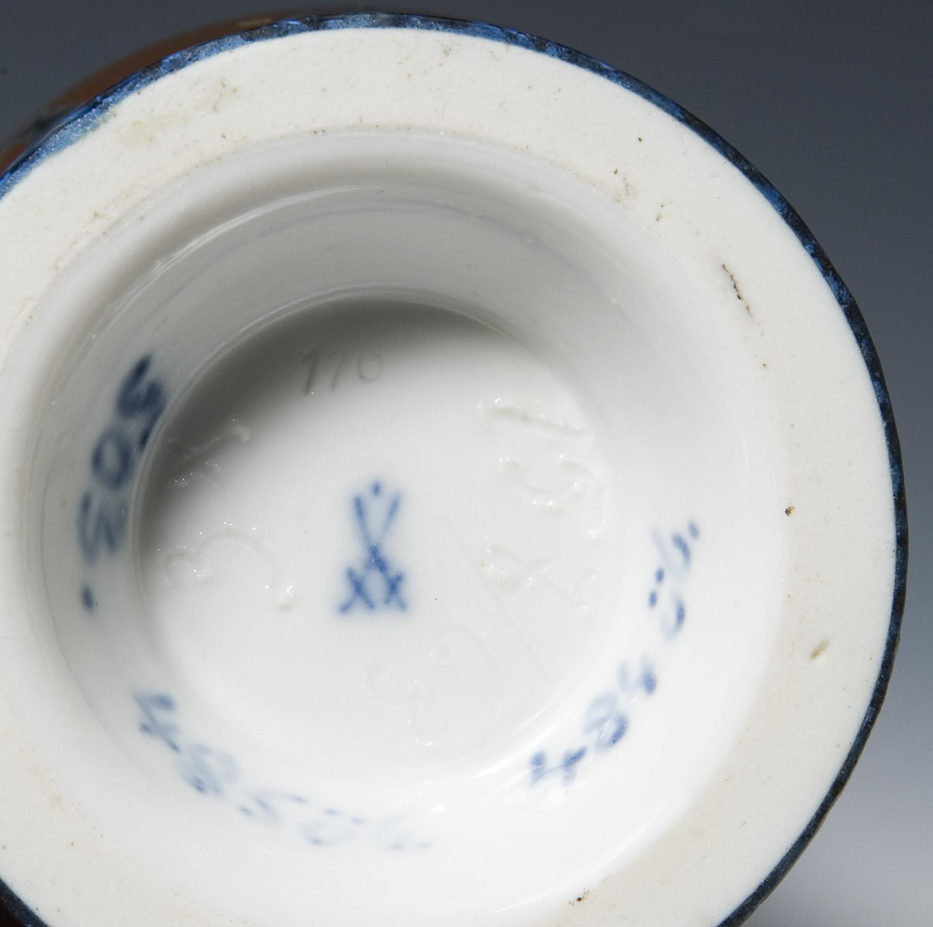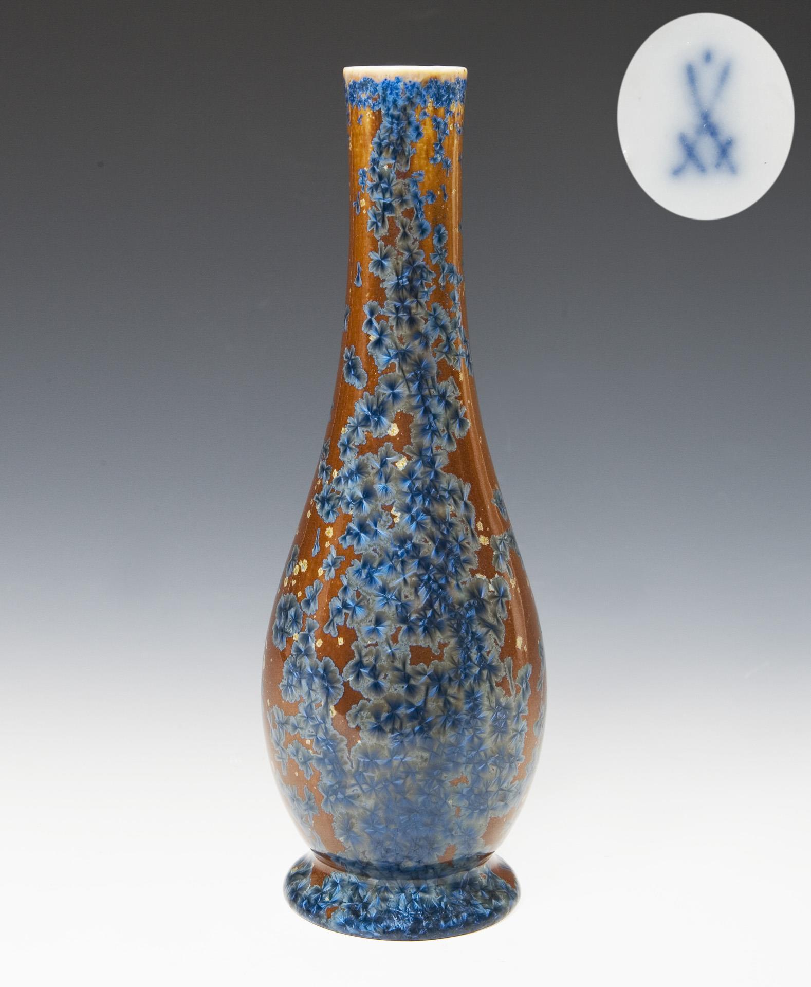 Umlaufend blaue und sandfarbene Kristalle über kapuzinerbraunem Fond. Schlanker Korpus über abgesetztem rundem Standfuß. Ritzmarken, Malermarken, Schwertermarke mit Punkt. Minimaler Brandriss am Mündungsrand.