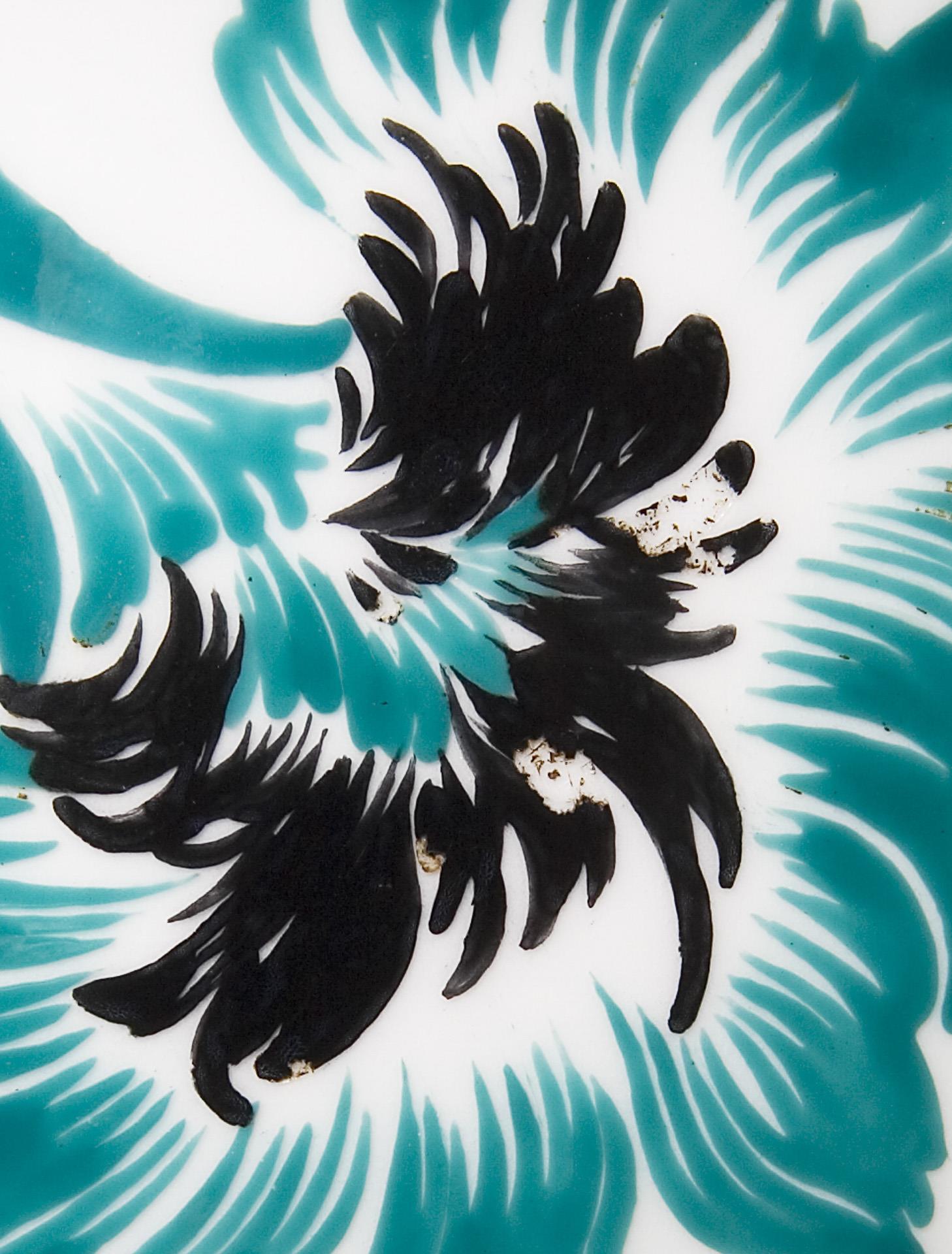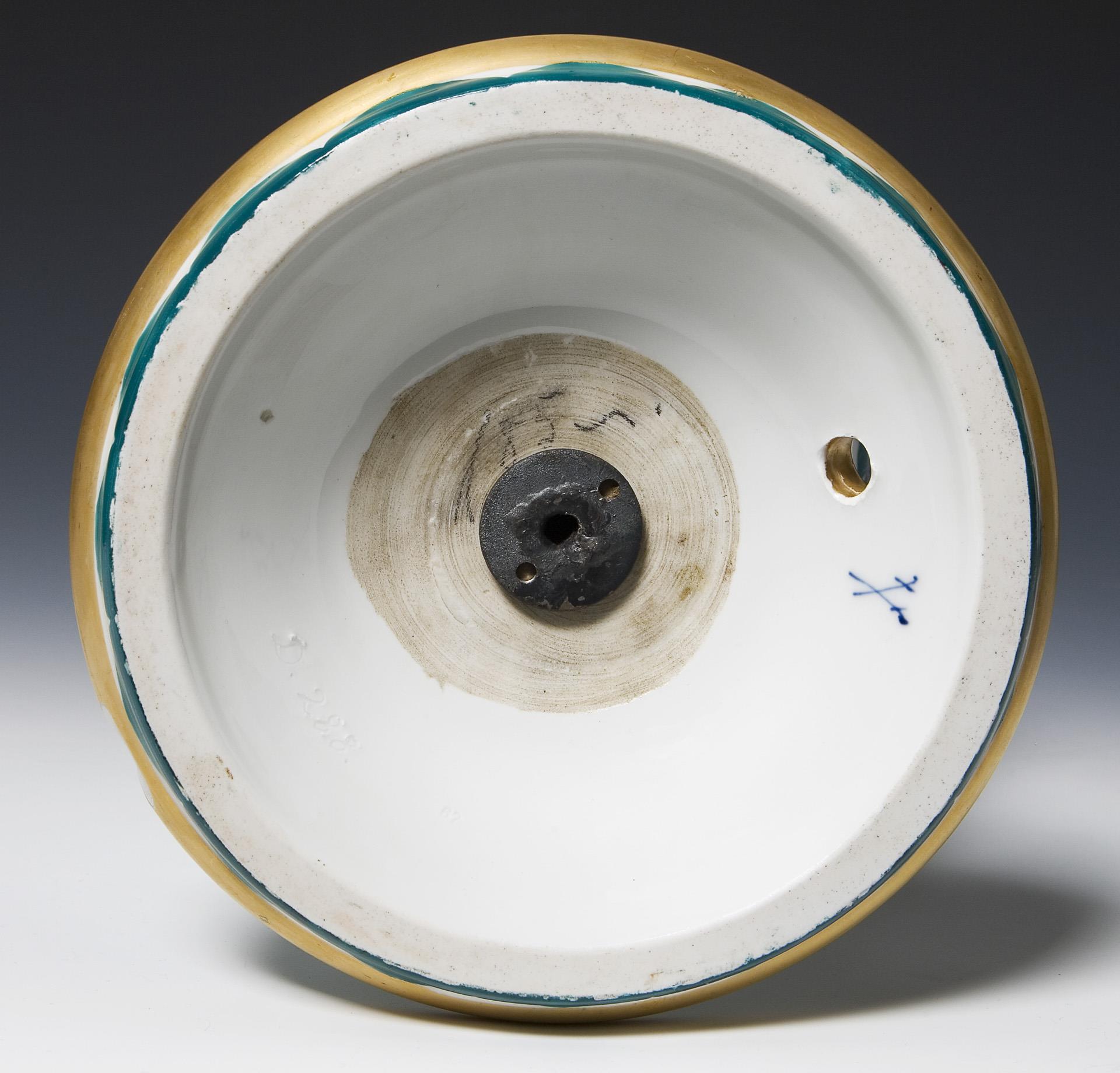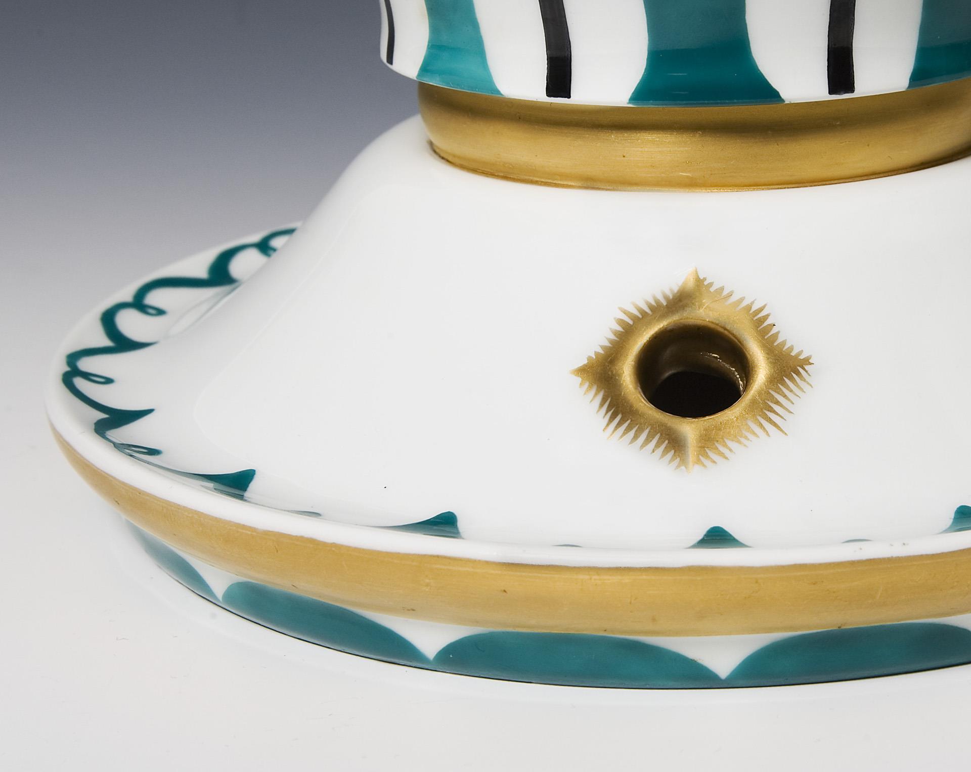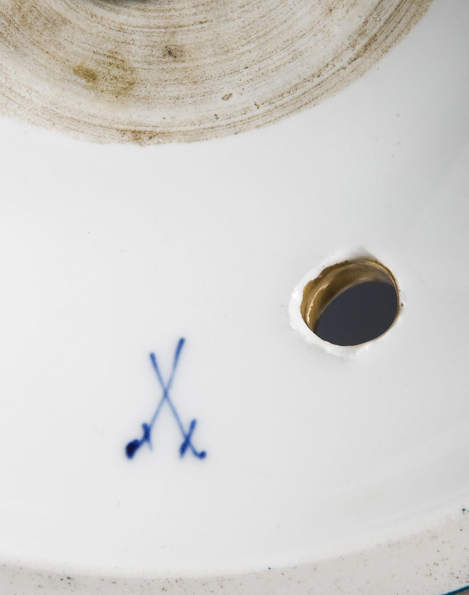 Modell-Jahr: 1913-1914, umlaufend farbig bemalt, florales und ornamentales Dekor in Grün, Schwarz und Gold. Metall-Montierung für Elektrifizierung. Ritzmarke, Pressmarke, Schwertermarke. Wandung minimal, Standfuß bestoßen.