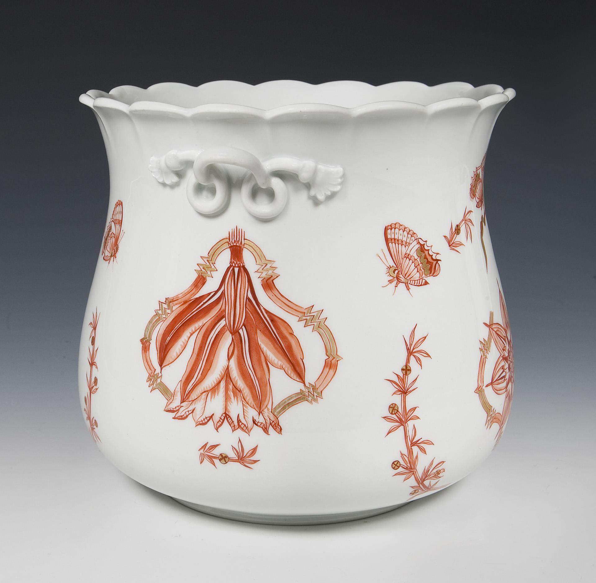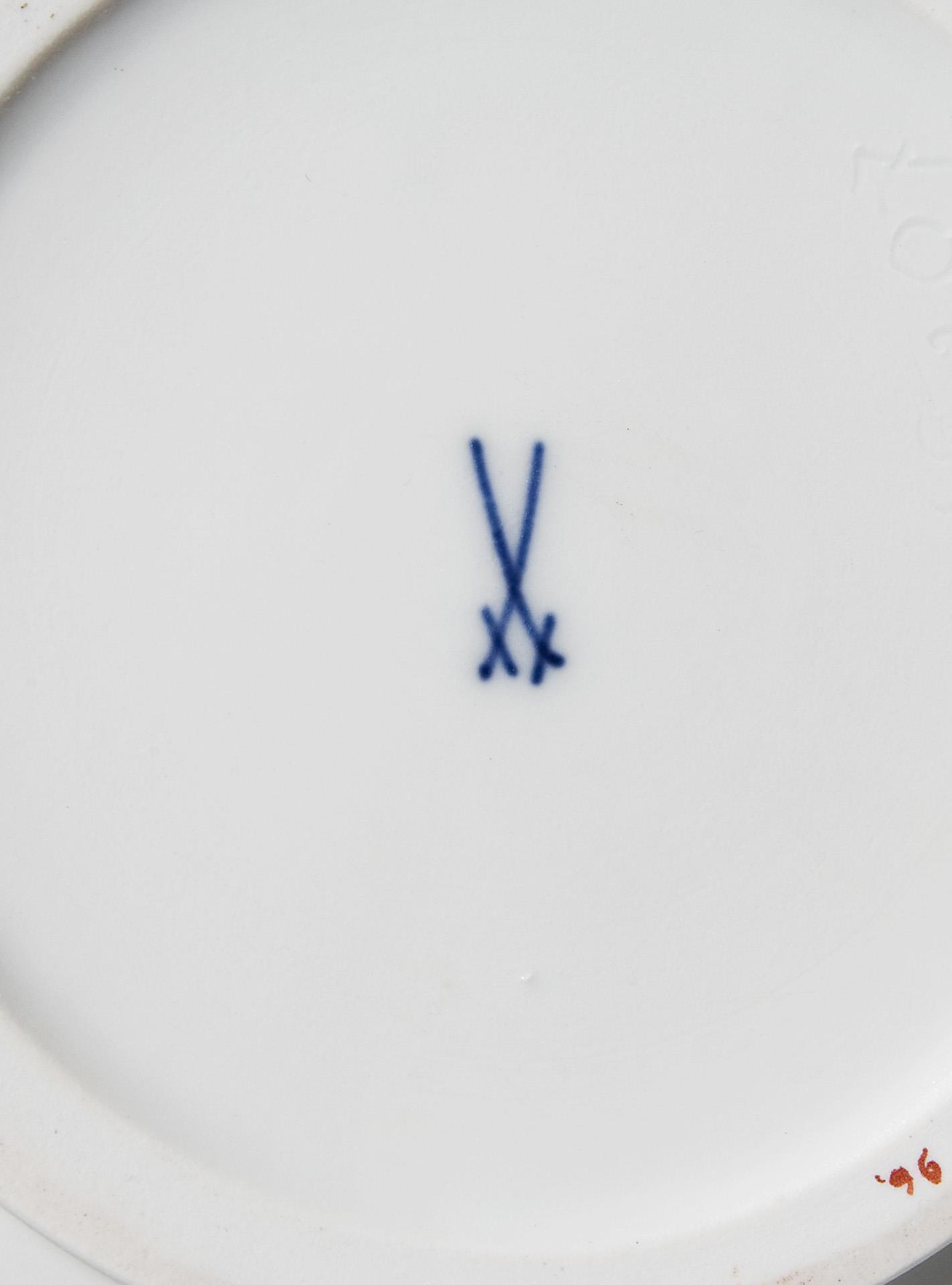 Modell-Jahr: 1919, umlaufend Bemalung mit stilisierten Blüten und Schmetterlingen in Korallenrot und Gold. Ritzmarke, Pressmarke, Malermarke, Schwertermarke.