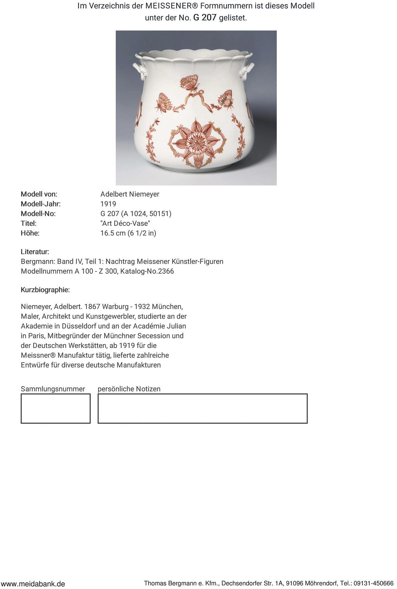 Niemeyer, Maler, Architekt und Kunstgewerbler, studierte an der Akademie in Düsseldorf und an der Académie Julian in Paris. Mitbegründer der Münchner Secession und der Deutschen Werkstätten, ab 1919 für die Manufaktur Meissen tätig. Lieferte zahlreiche Entwürfe für diverse deutsche Manufakturen * Partnerauktion Bergmann.