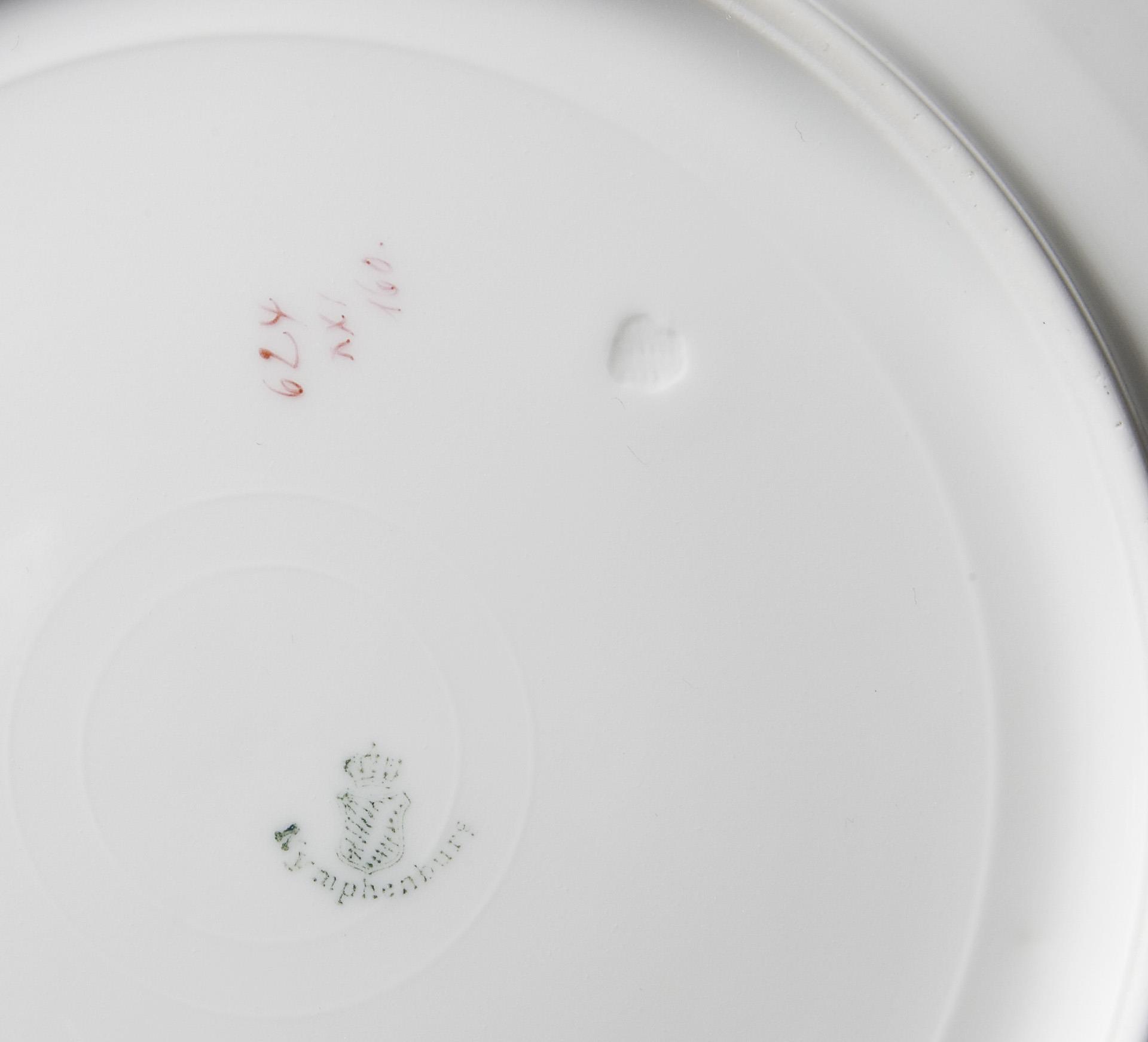 Modell-Jahr: 1899-1902, Dekor-Nr. 624. Bemalung in Chromgrün und Violett mit 9 verschiedenen Fischmotiven, gold staffiert. Pressmarken, Malermarken, grüne Bodenmarken.