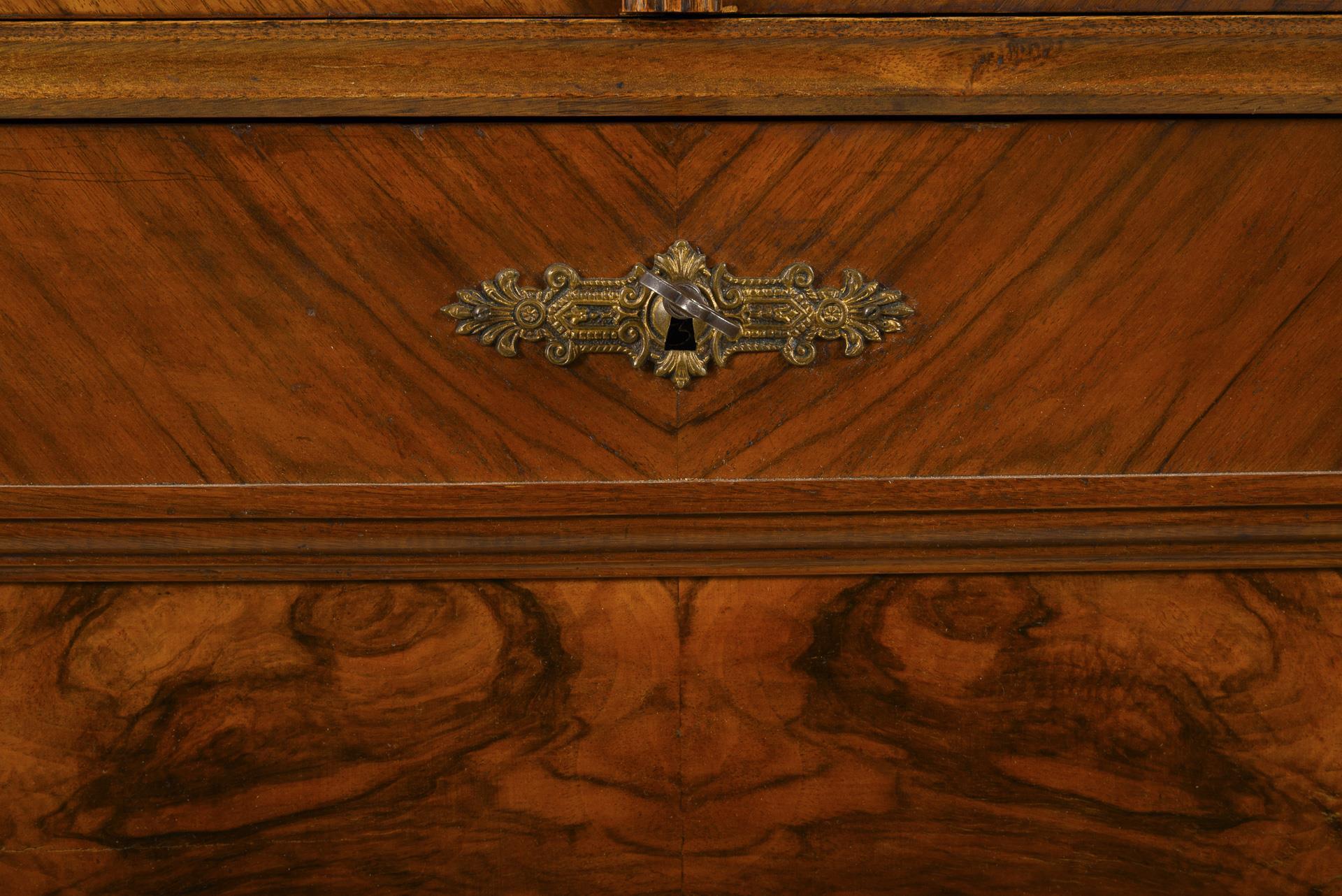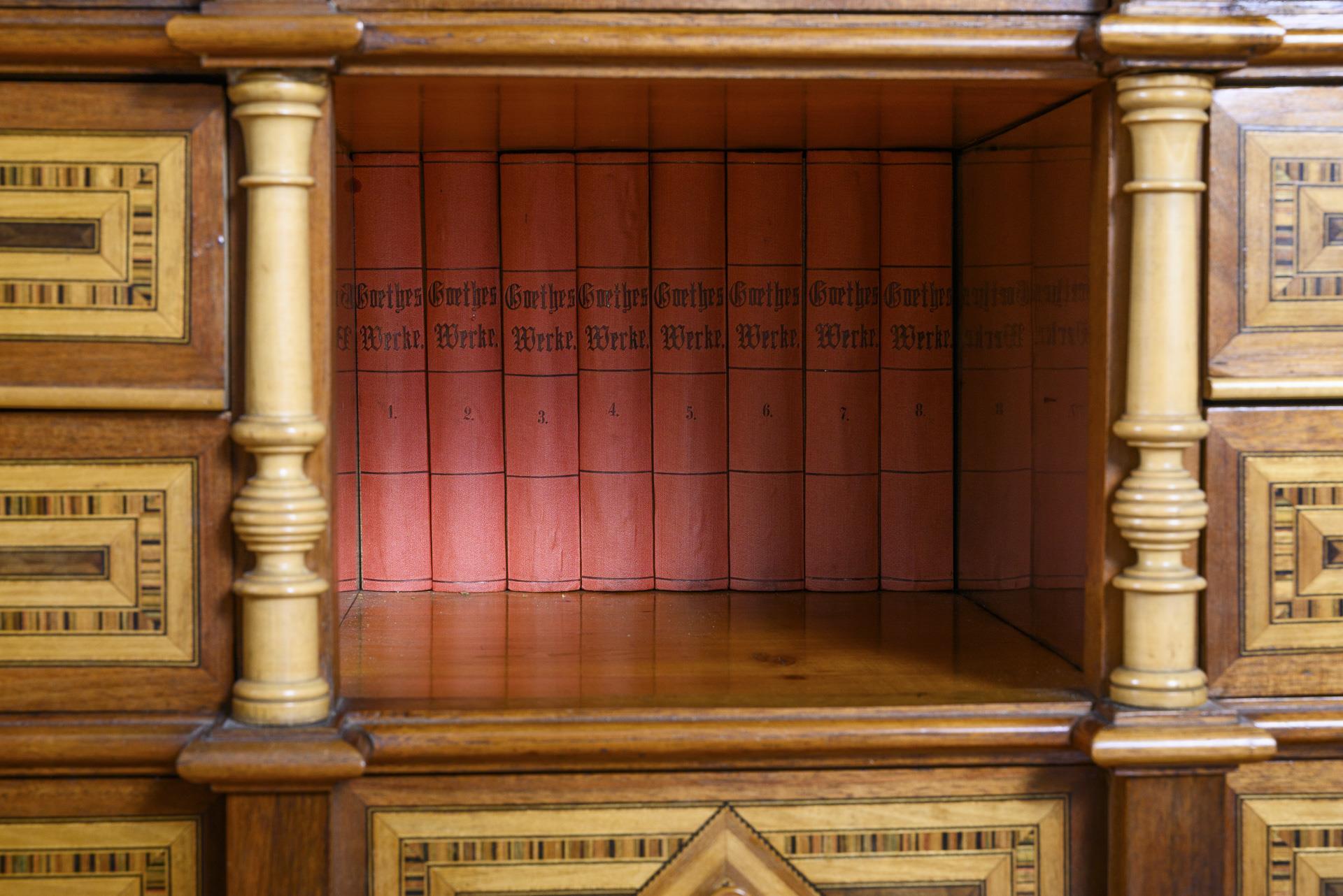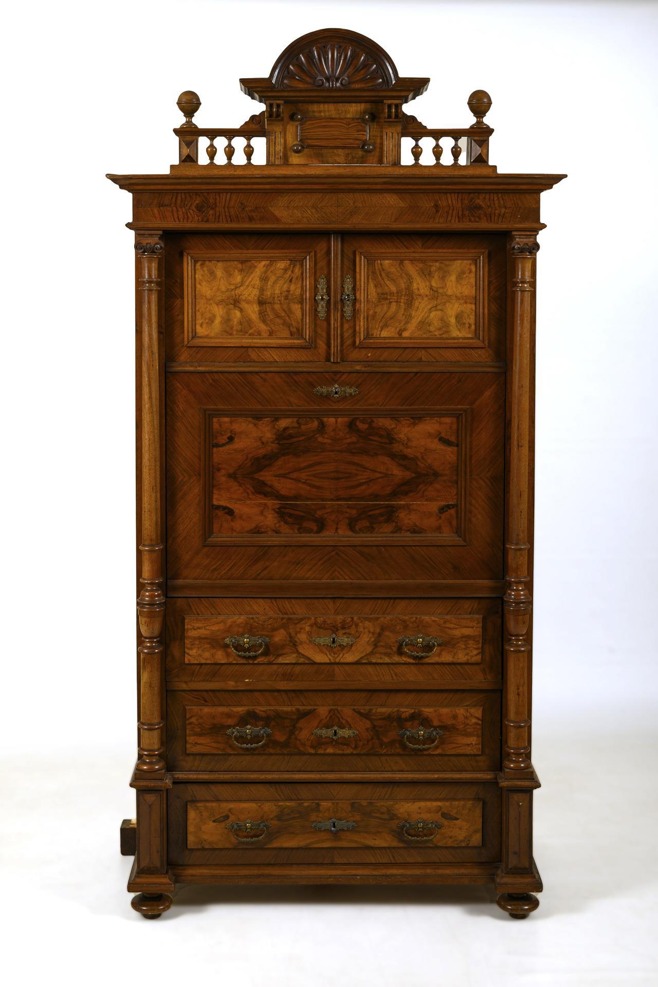 2-türiger Korpus mit klappbarer Schreibplatte und 3 Sockelschüben, auf 2 gedrückten Kugelfüßen und 2 Klotzfüßen. Seitliche Vollsäulen auf vorkragenden Postamenten mit Diamantquadern, kassettierte Fronten teils mit Rahmenleisten, gründerzeitliche Schlüssellochbeschläge und Bügelgriffe aus Messing. Eingericht mit offenem Mittelfach mit seitlichen Ziersäulchen und Scheinbücherrückwand, 5 kleine Schübe und 1 Sockelschub mit 3 Scheinschüben mit bandintarsierten Fronten und Holzknäufen, 2 kleine offene Ablagefächer mit dahinterliegenden Geheimfächern. Als Zugabe ein bekrönender Bogengiebel mit Drechselwerk und Geländer, nur lose anbei. Leichte Alters- und Gebrauchsspuren, partiell kleine Defekte, Aufsatzkrone und Klotzfüße lose anbei, Einlegeboden für oberes Fach fehlend, Schübe ohne passenden Schlüssel, Schreibplatte mit Schlüssel schwer schließend.
