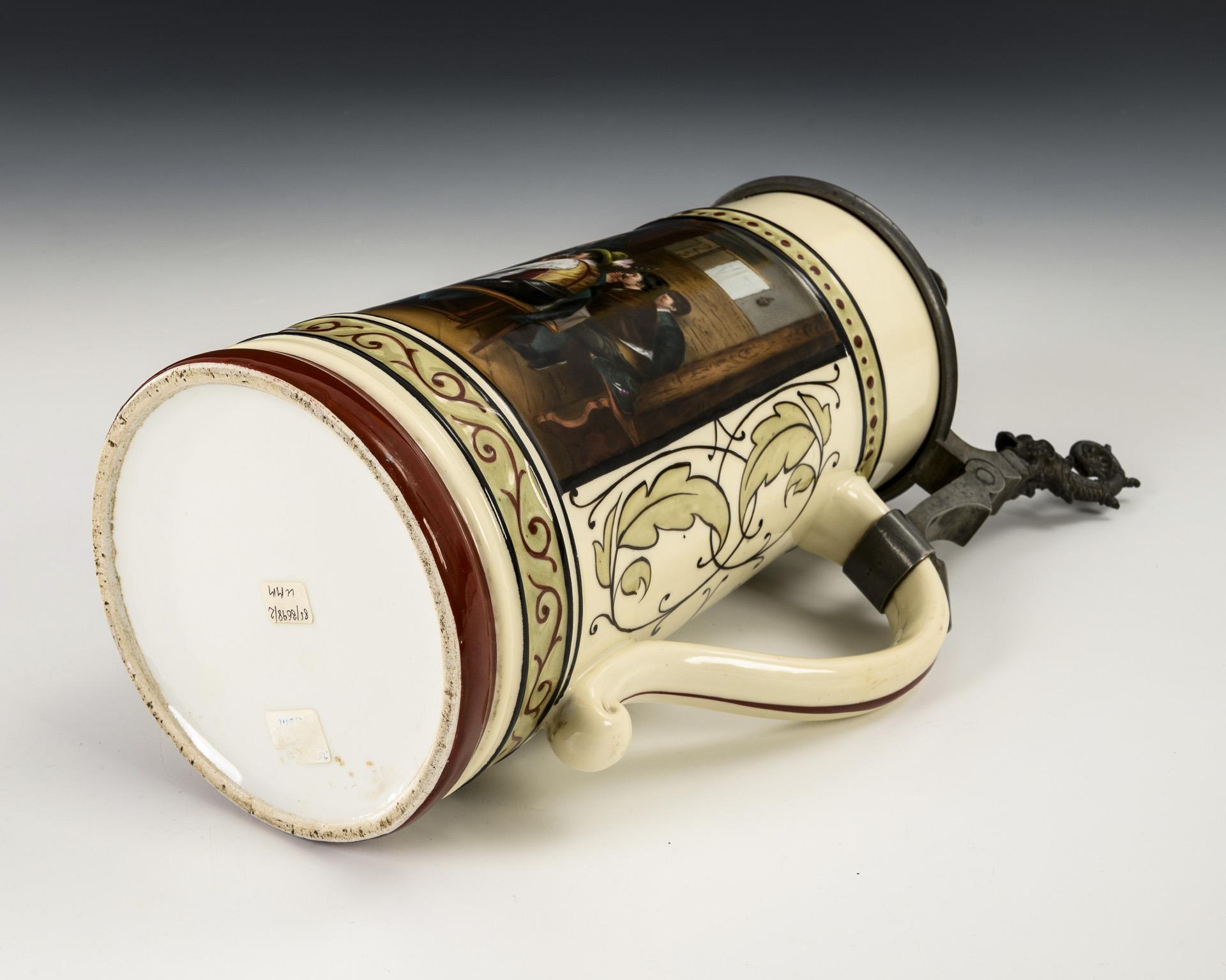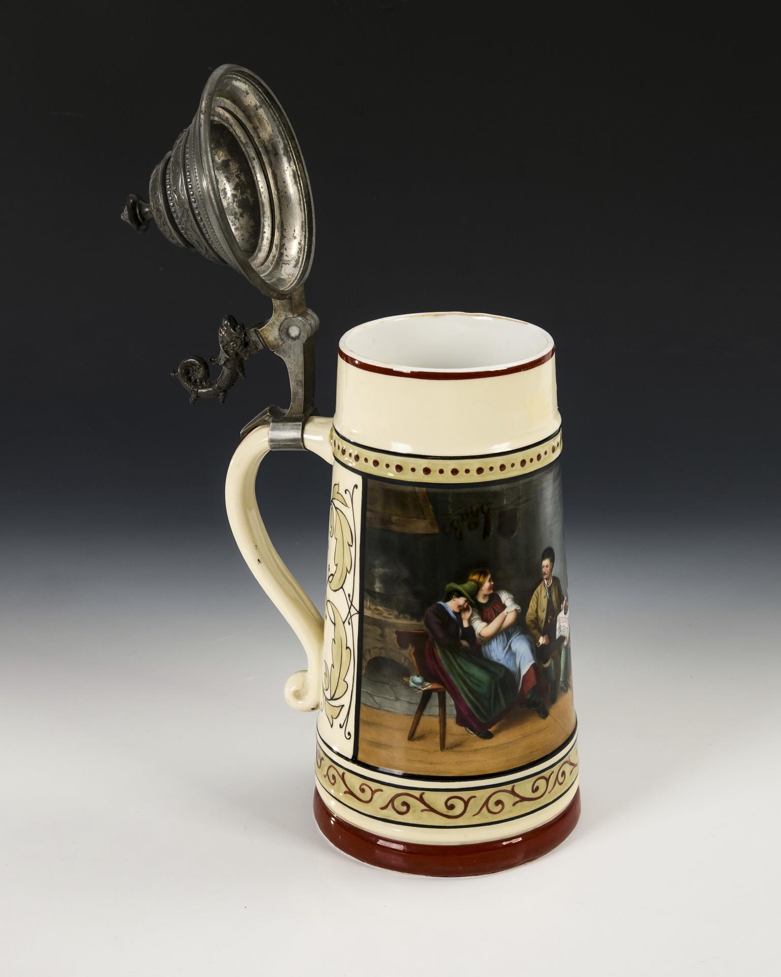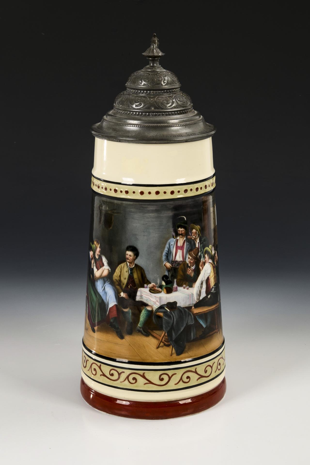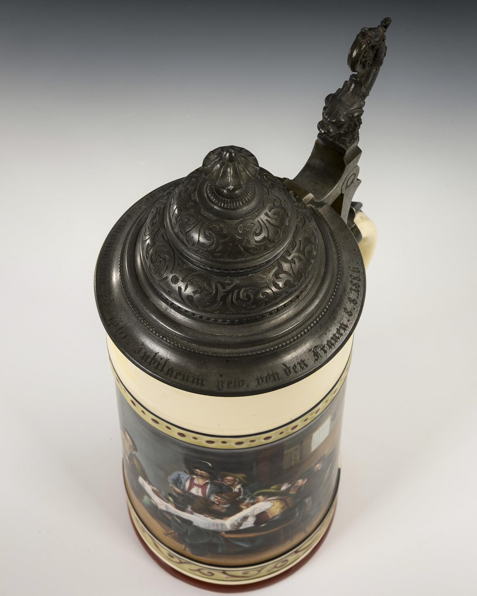 Konischer Krug mit zinnmontiertem Scharnierdeckel. Auf der Wandung eine große Rechteckkartusche mit der Darstellung einer Wirtshausszene, nach dem Gemälde "Der Salontiroler" von Franz Defregger (1835-1921), auf dem Deckel die Widmung "Der Riege Germania zum 25=jähr. Jubilaeum gew. von den Frauen. 8. 8. 1886".