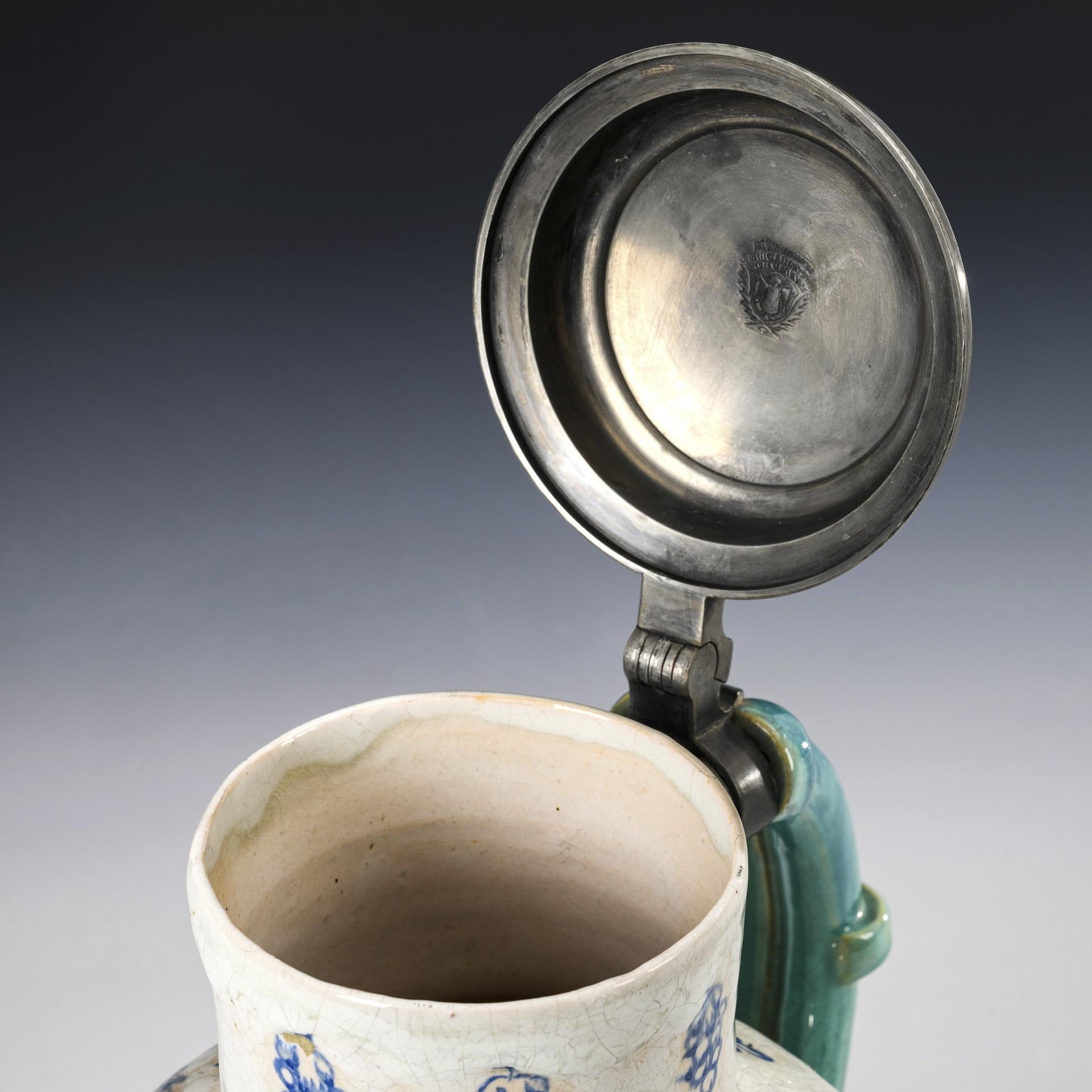 Kugelbauchkanne mit Zylinderhals und 7-fach geplatteter Wandung, 2-strängiger Bandhenkel mit teilplastischen Manschettenbändern, abgesetzter Stand. Umlaufend Kranznischen mit Heiligenfiguren und Engeln, alternierend bezeichnet "Ave Maria" und "Gratia". Godronierter Zinndeckel mit Kugeldrücker, Zinnstandring. Partiell Glasurdefekte, 1 Retusche.