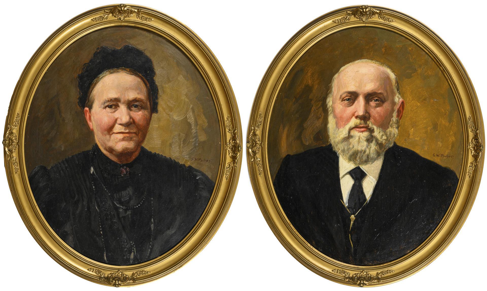 Porträt einer Frau im schwarzen Kleid vor neutralem Hintergrund sowie Porträt eines Mannes im schwarzen Anzug vor neutralem Hintergrund.