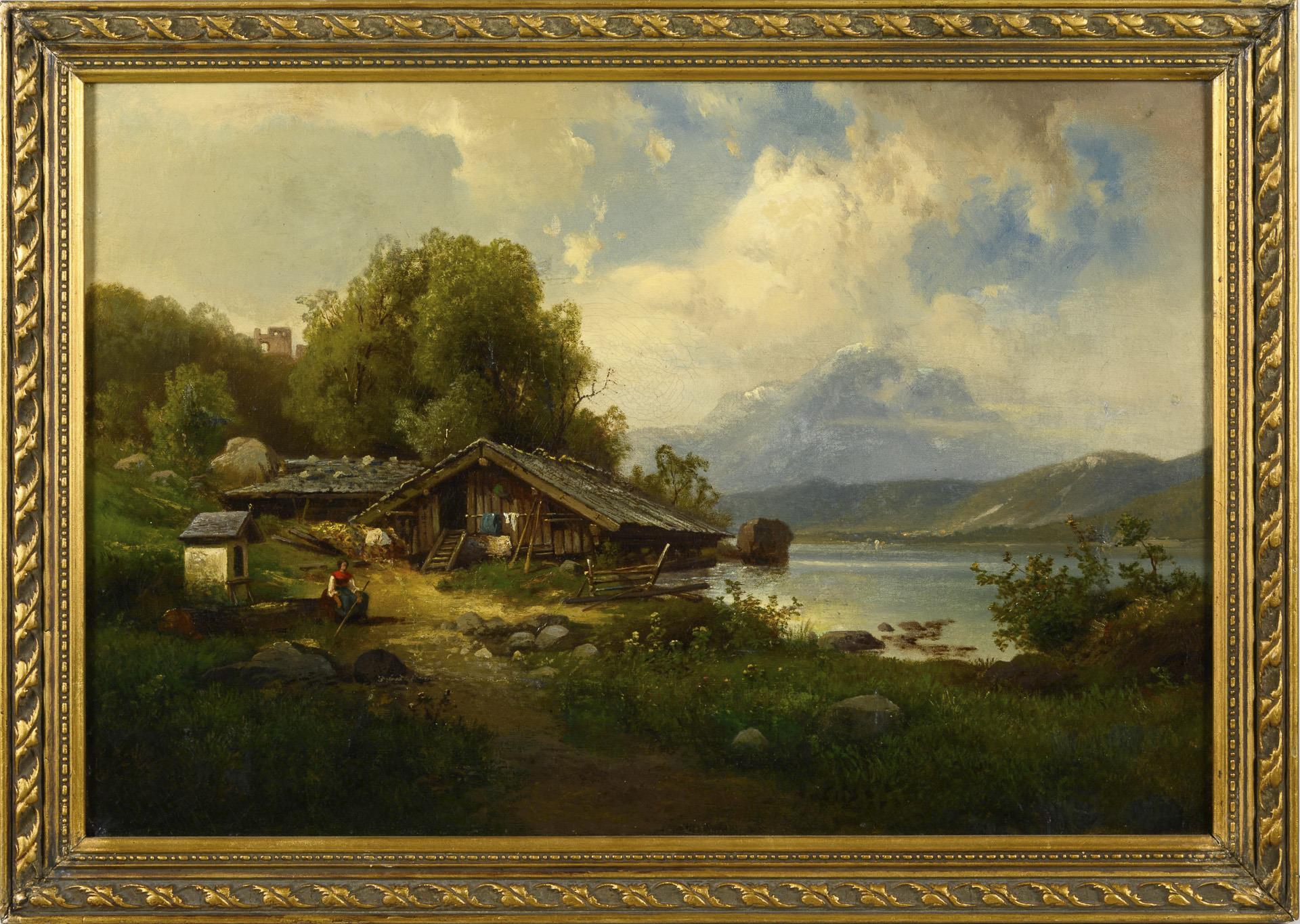 Gebirgslandschaft mit See und Staffagefigur vor einem Haus am Ufer mit Blick zu den Bergen am Horizont. Leinwand doubliert, restauriert.
