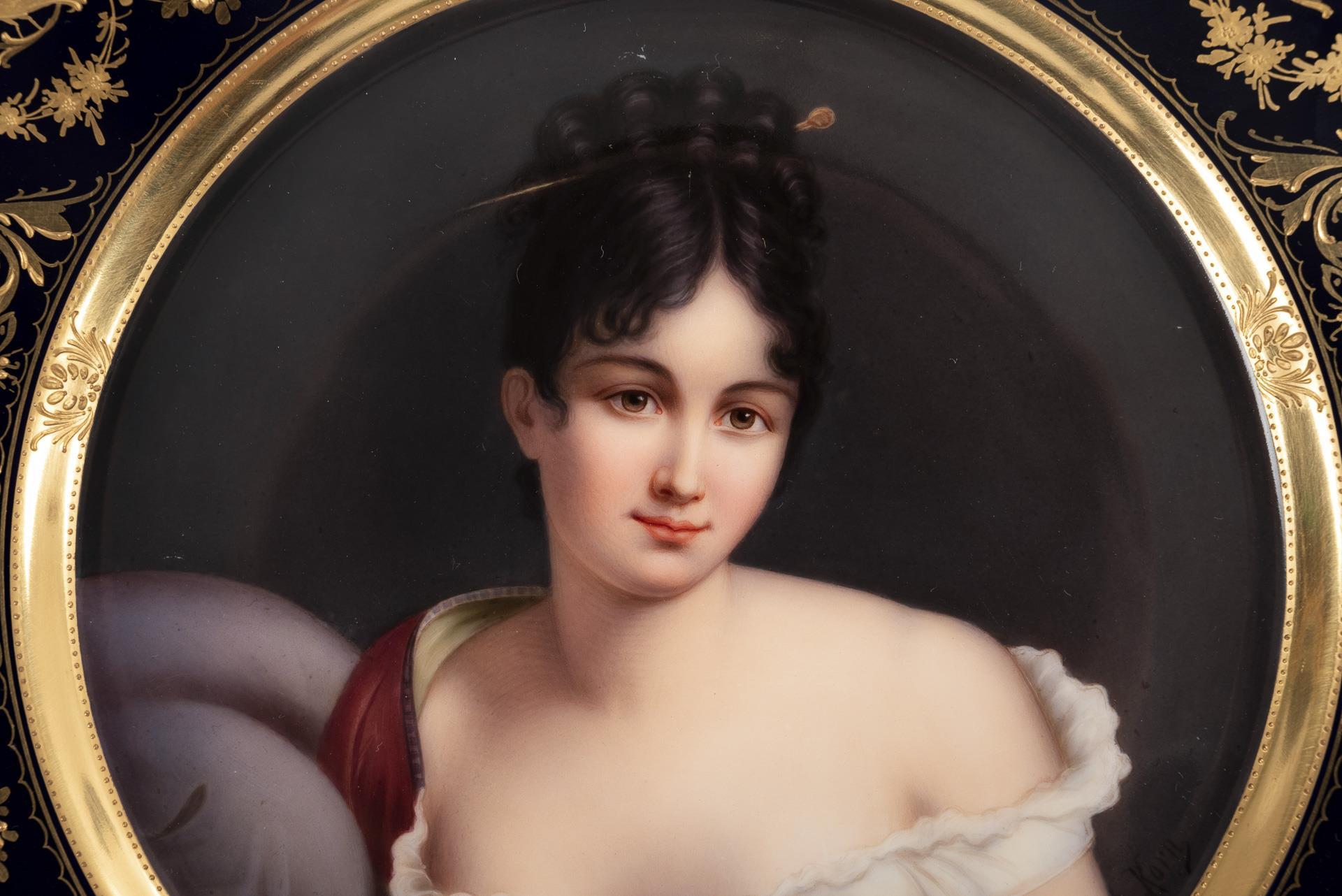 Kobaltblaue Fahne mit reicher, teils reliefierter floraler Malerei mit Girlanden und Vögeln, im Spiegel das Porträt der Juliette Récamier (1777-1849), nach einem 1802 geschaffenen Gemälde von François Pascal Simon Gérard (1770 - 1837).