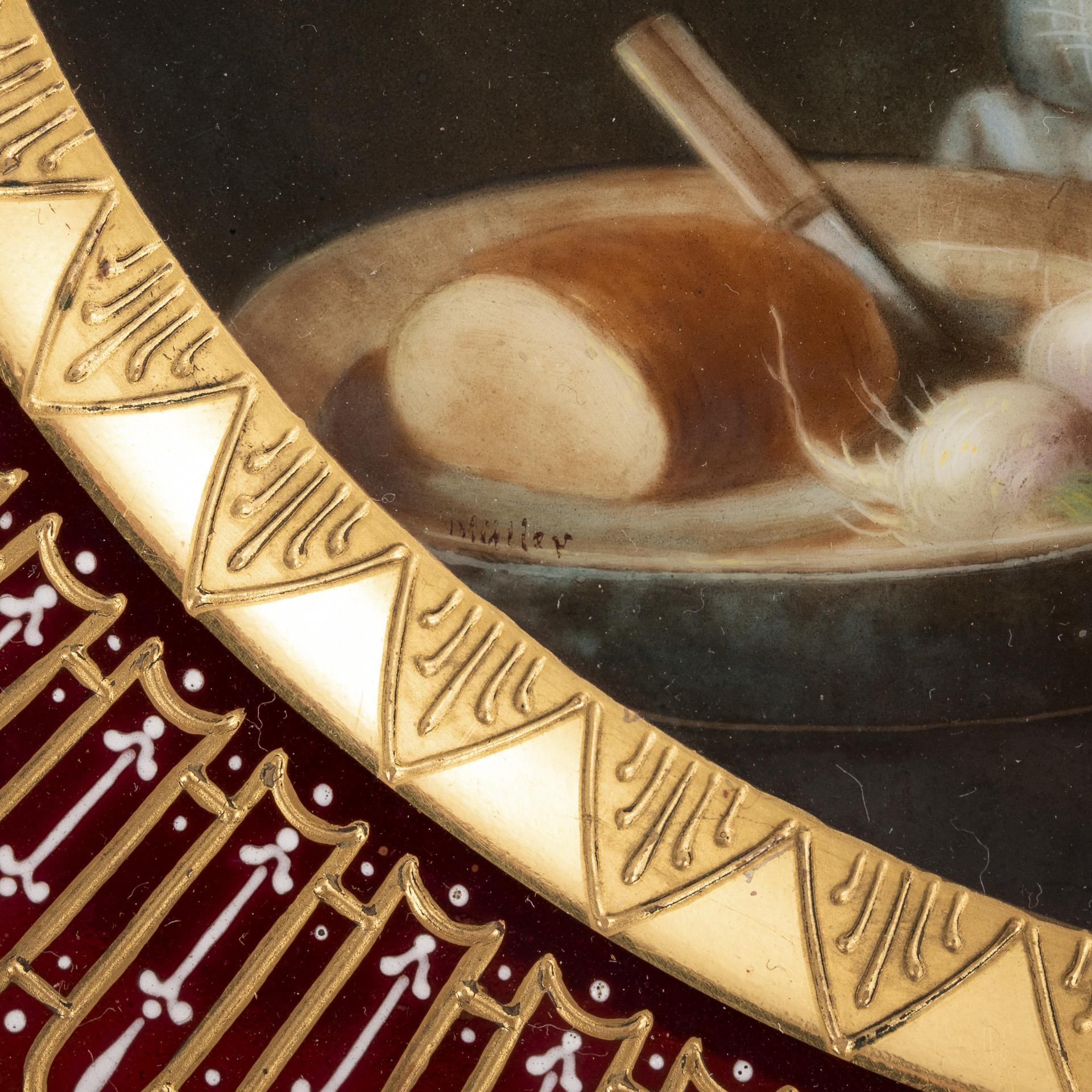 Im Spiegel die Darstellung eines den Bierkrug erhebenden, fröhlichen Mönches, vor einem Teller mit Brot und Rettich sitzend, verso bezeichnet "Frühtrunk", wohl nach einem Gemälde von Eduard von Grützner (1846-1925).