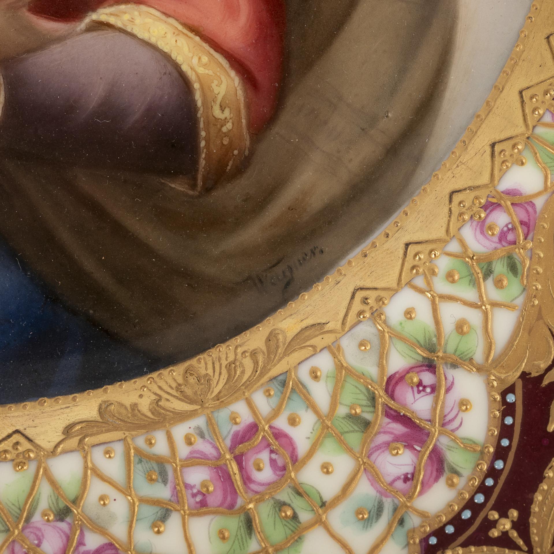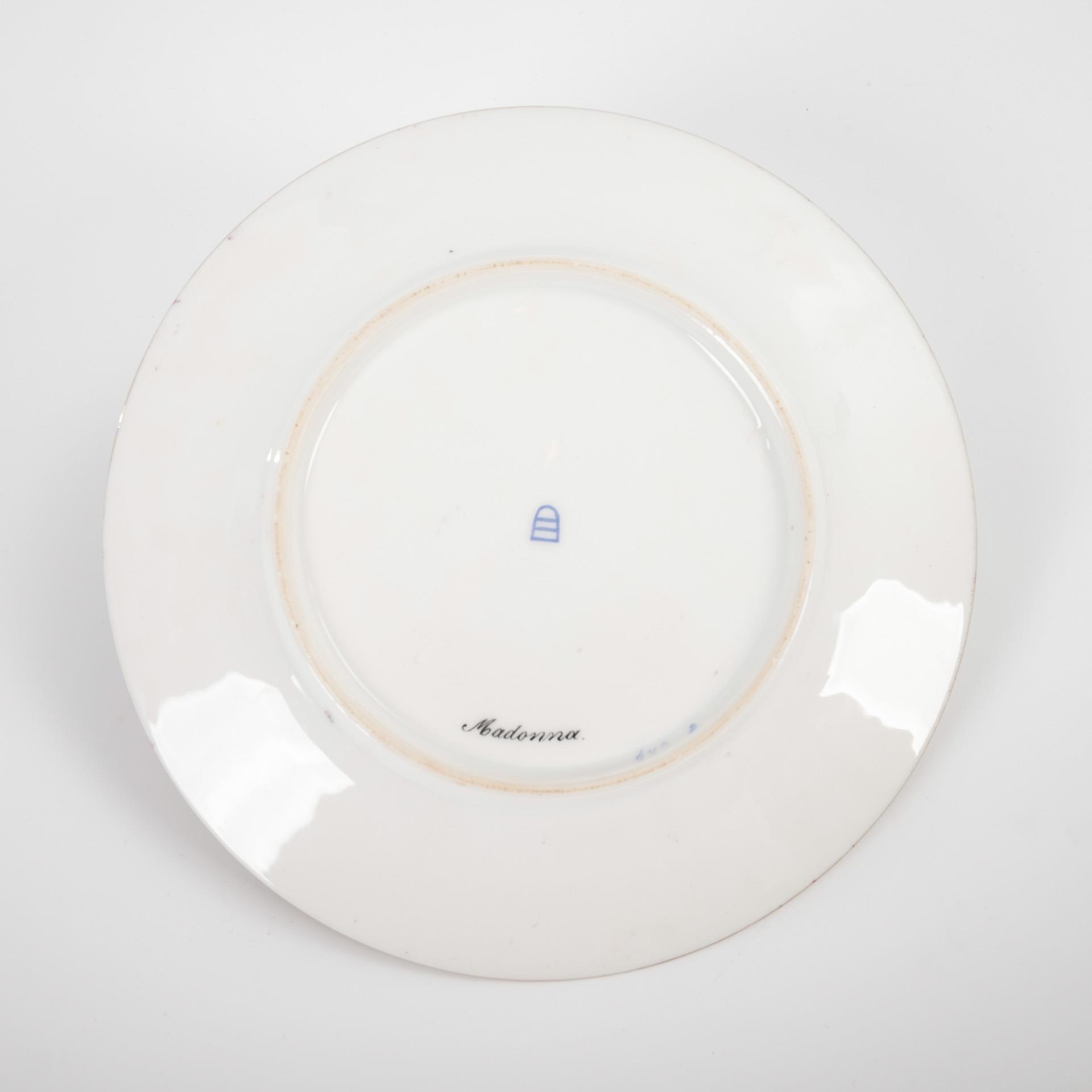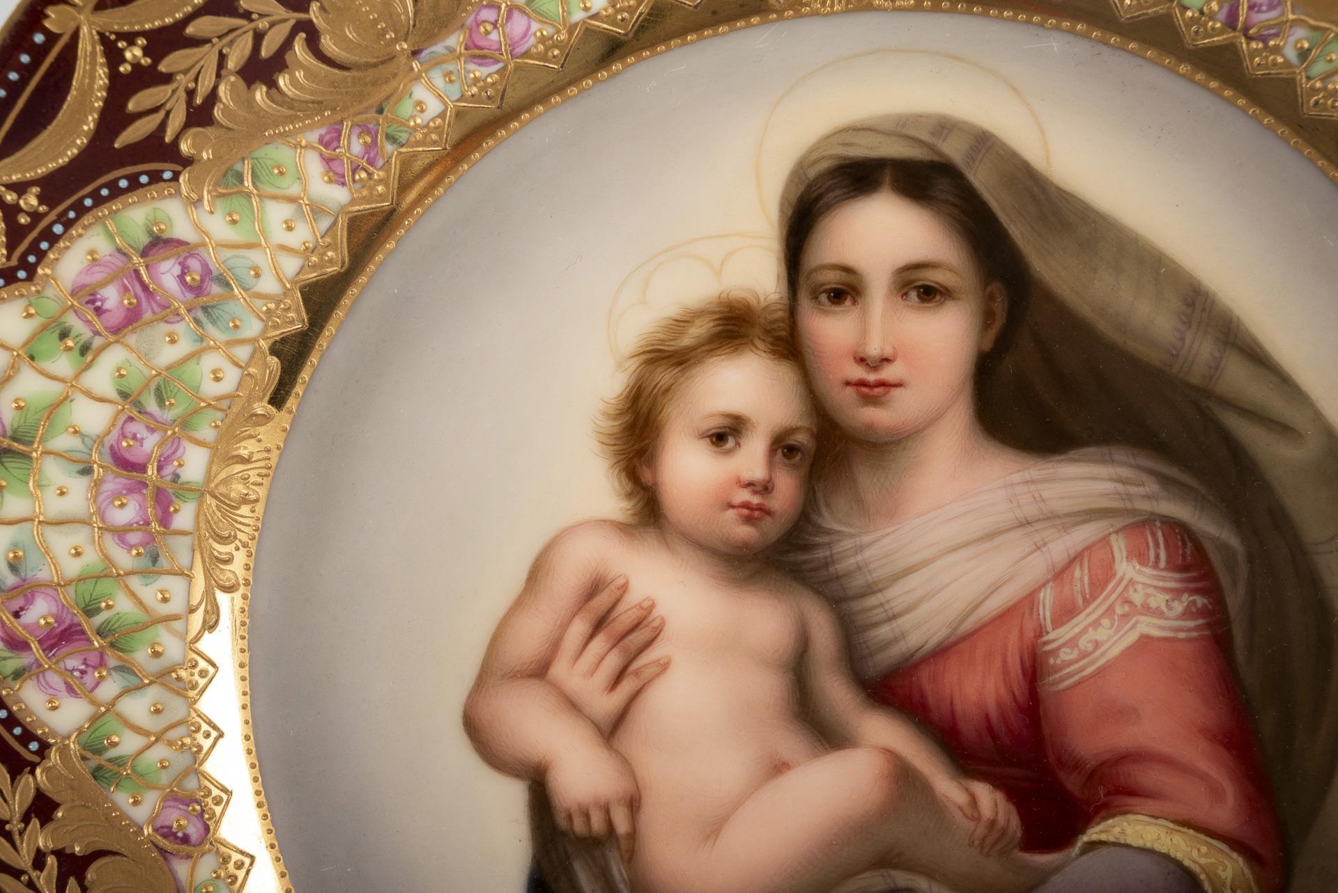 Im Spiegel die Darstellung der Madonna mit Kind, nach dem 1512/13 entstandenen Gemälde von Raffael (1483-1520) in der Gemäldegalerie Alte Meister in Dresden. Prunkvoll gestaltete Fahne mit braunem, lüstriertem Teilfond, floraler Reliefgoldmalerei sowie fünf Kartuschen mit Reliefgoldgitter vor Rosenmalerei. Ø 24 cm.