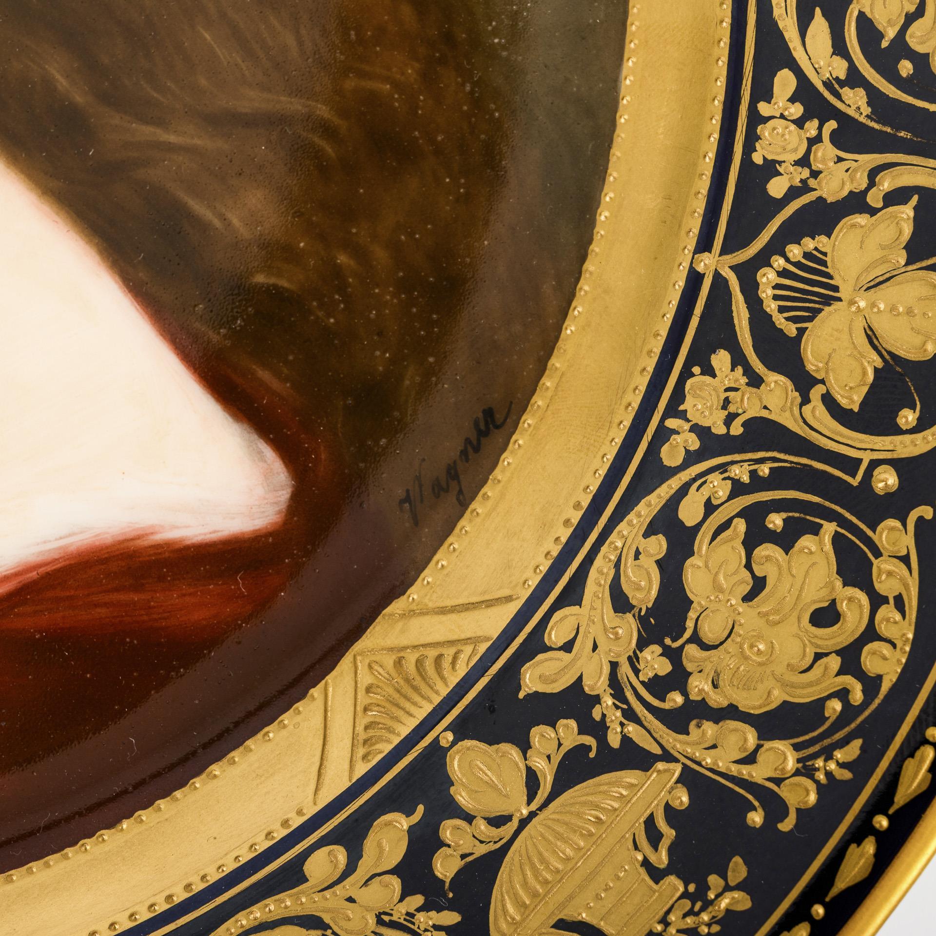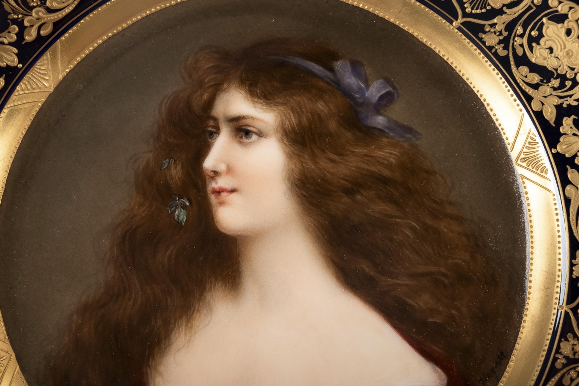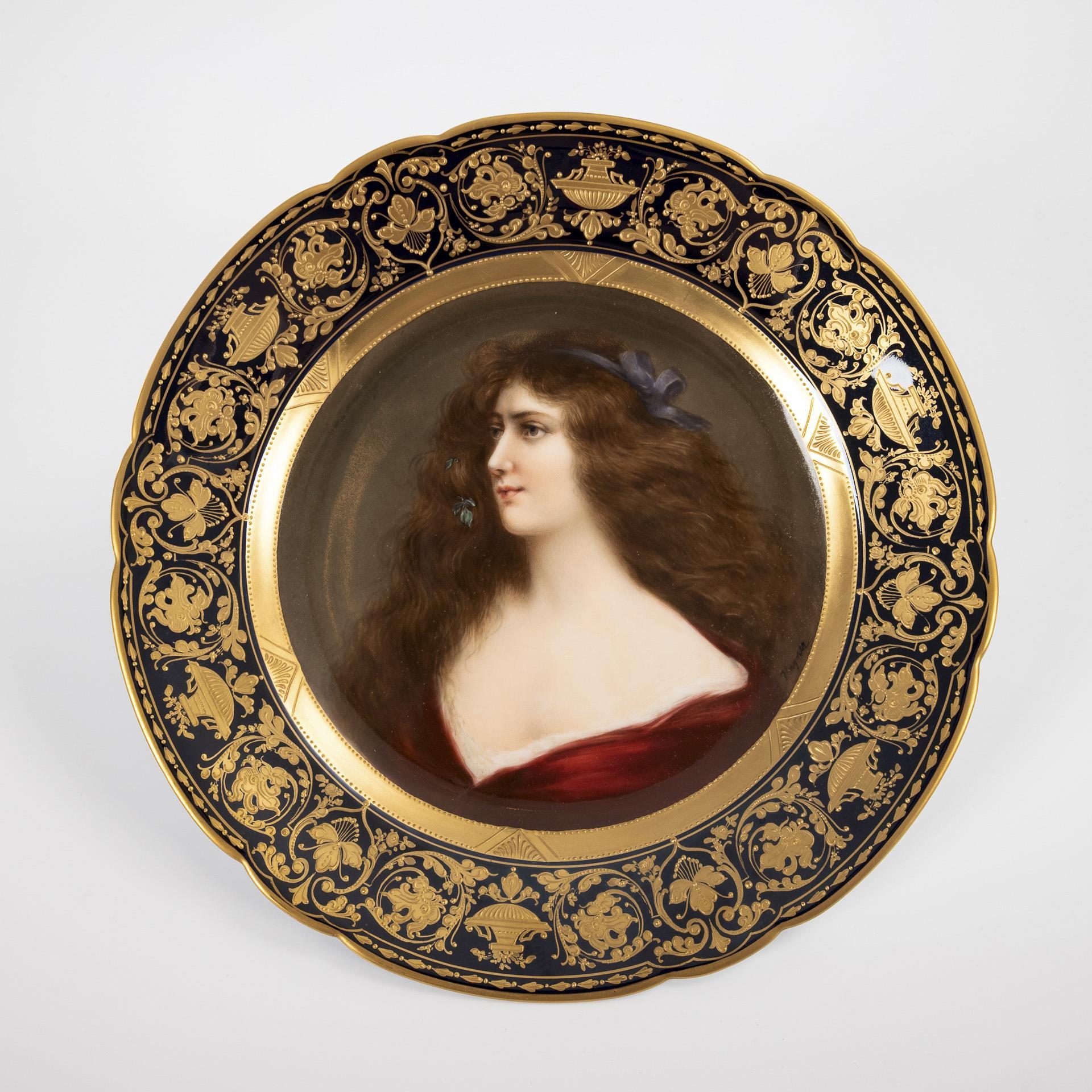 Kobaltblaue Fahne mit ornamentaler Goldreliefmalerei, im Spiegel die Darstellung einer jungen Frau mit langem, lockigem Haar und rotem Kleid, nach einem Gemälde von Angelo Asti (1807-1903), verso bezeichnet "Reneuse".
