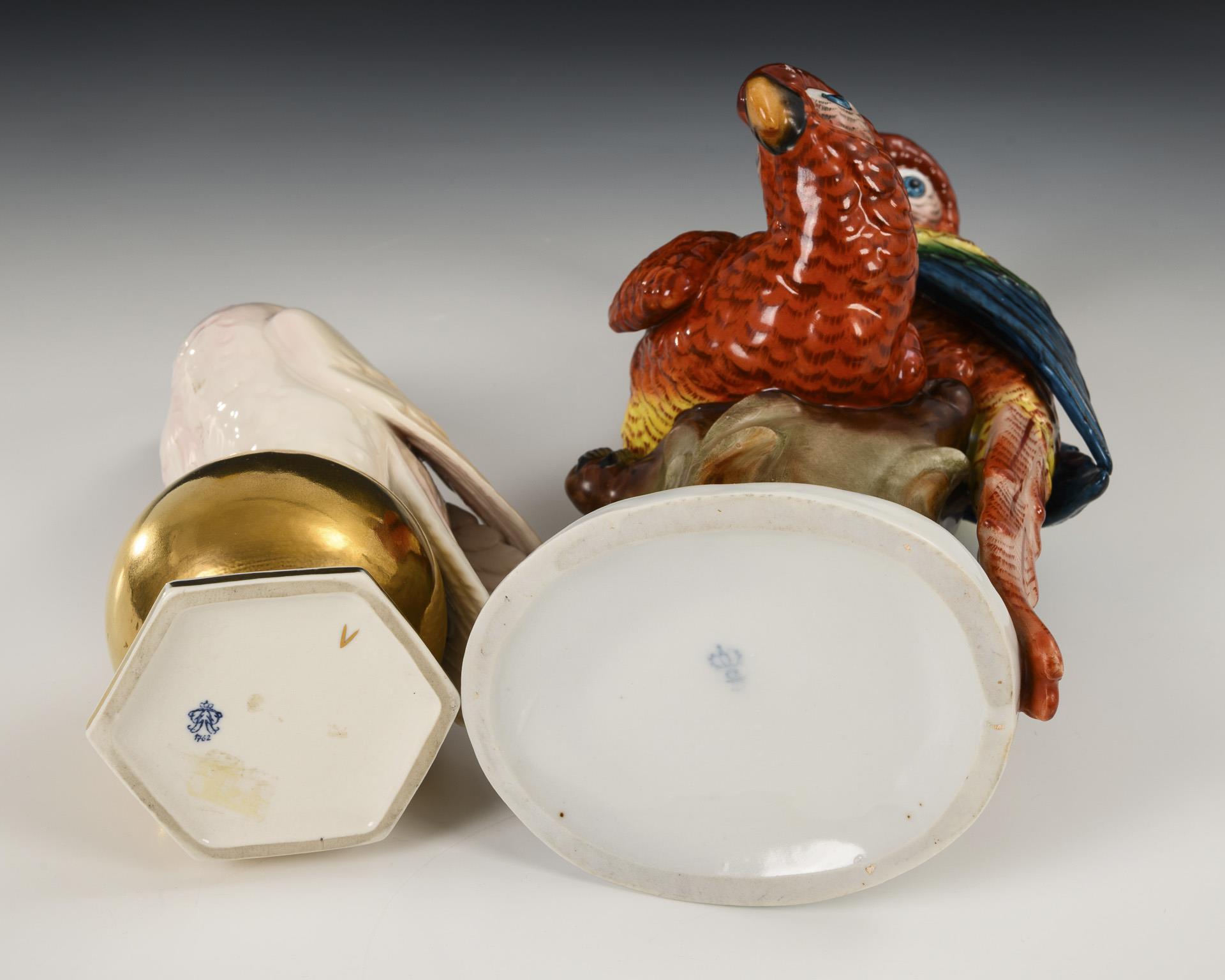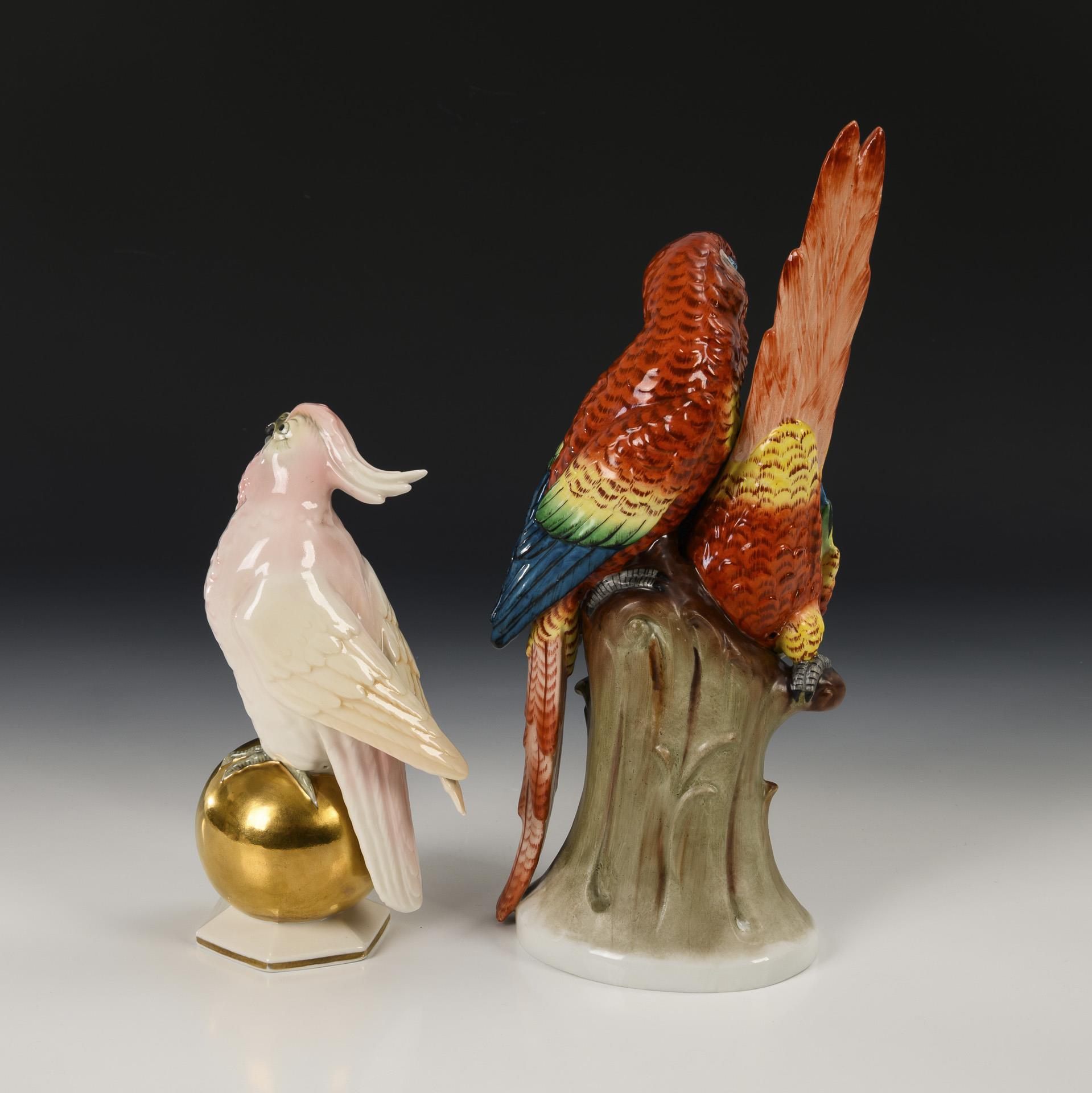1x SITZENDORF: auf einem Baumstumpf sitzendes Papageienpaar (H 32 cm). / 1x AELTESTE VOLKSTEDTER: auf einer goldenen Kugel sitzender Kakadu.