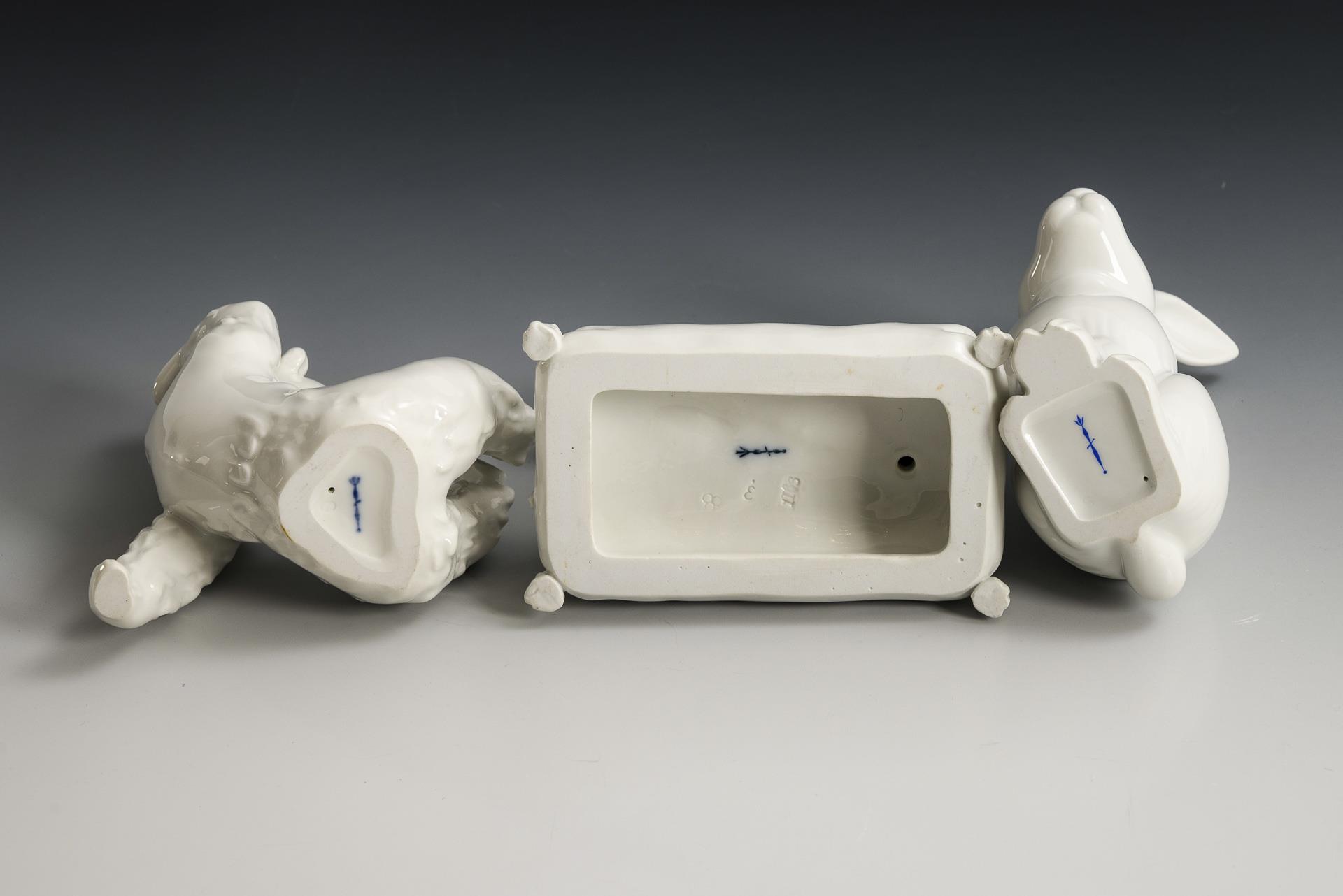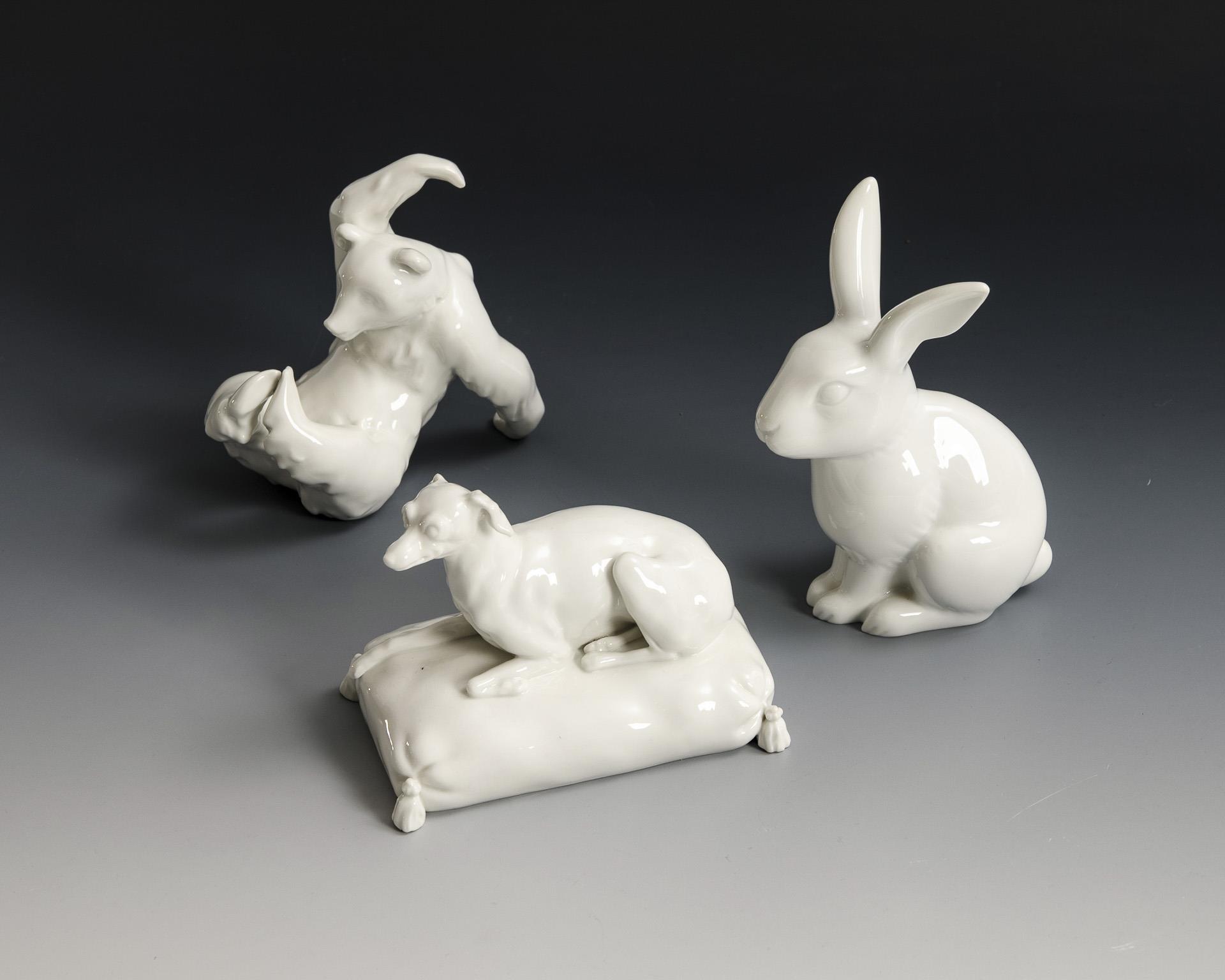 Hase, Bär und Windhund auf Kissen. KPM Berlin.