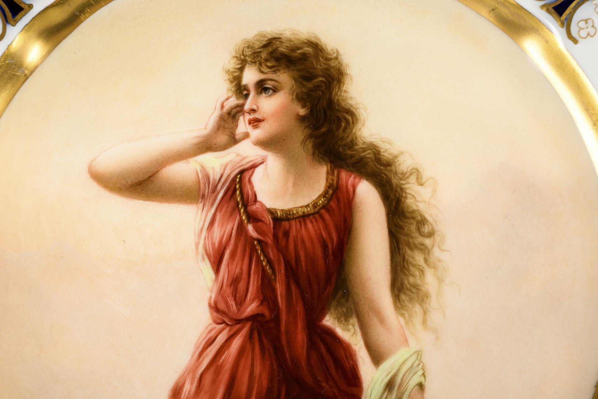 Passiger Teller mit reliefiertem, geschwungenem Liniendekor auf der unterglasurblau verlaufend staffierten Fahne, im goldgerahmten Spiegel die Darstellung einer jungen, antikisierend gekleideten Frau.