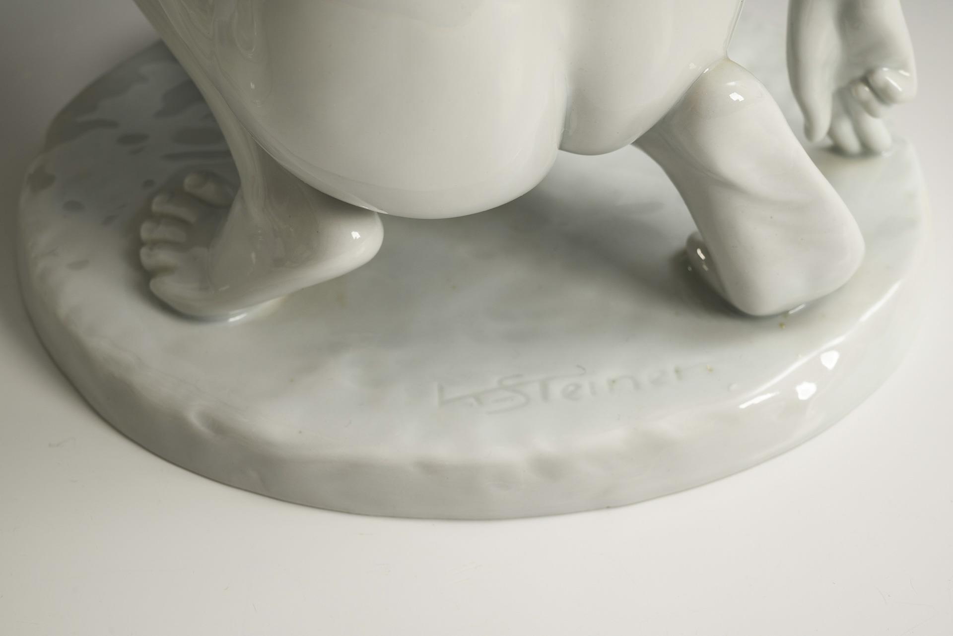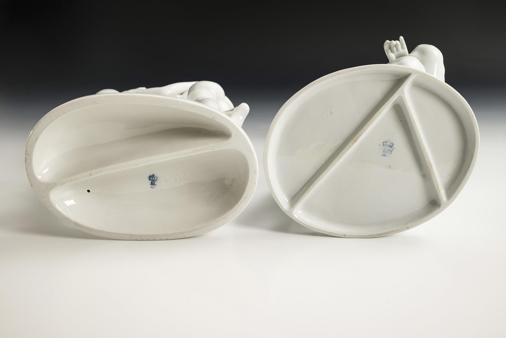1x SITZENDORF, Modell-Nr. 21403: Gruppe der drei Grazien nach Antonio Canova (1757-1822). / 1x UNTERWEISSBACH, Modell-Nr. 9365: hockender Frauenakt.