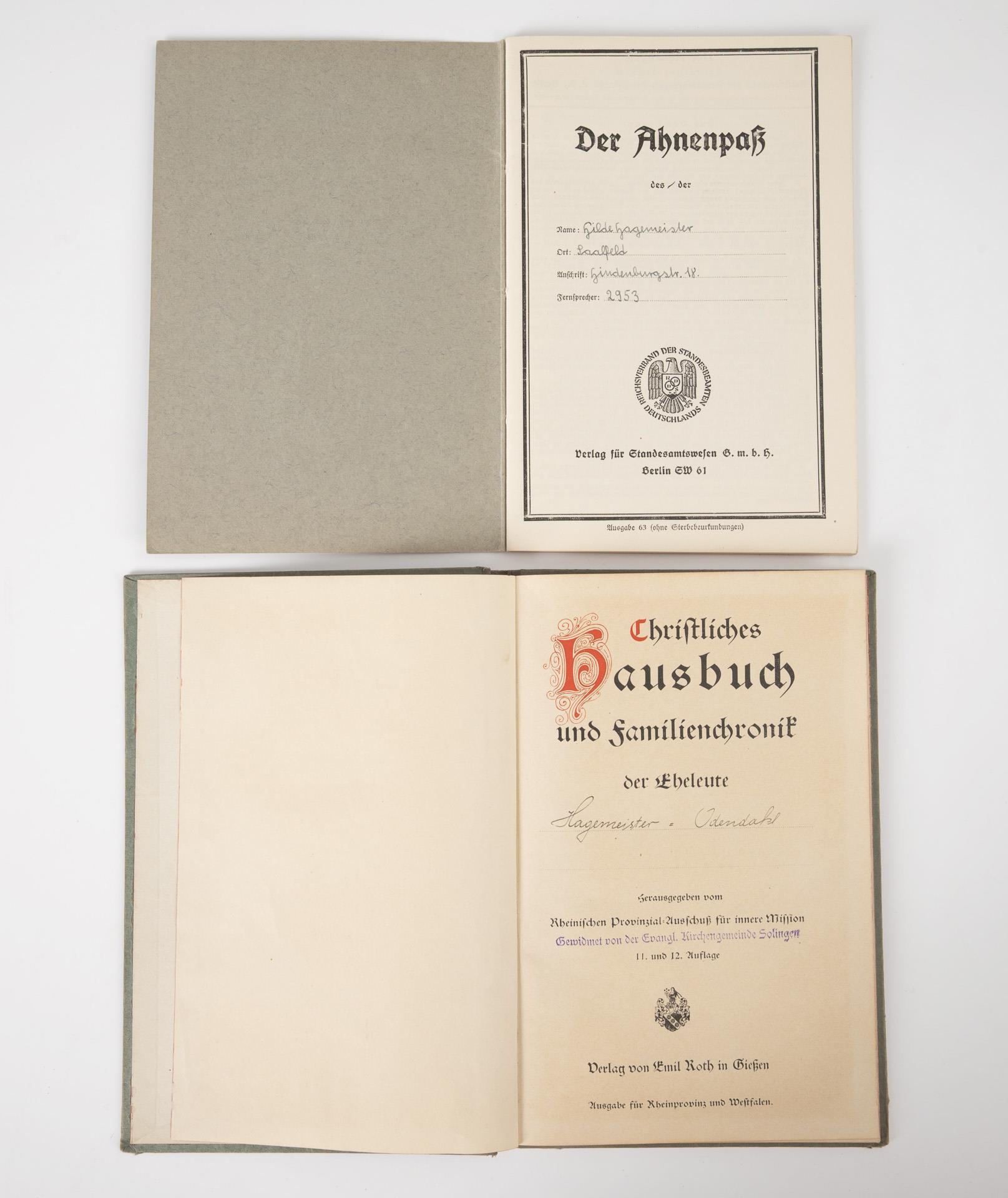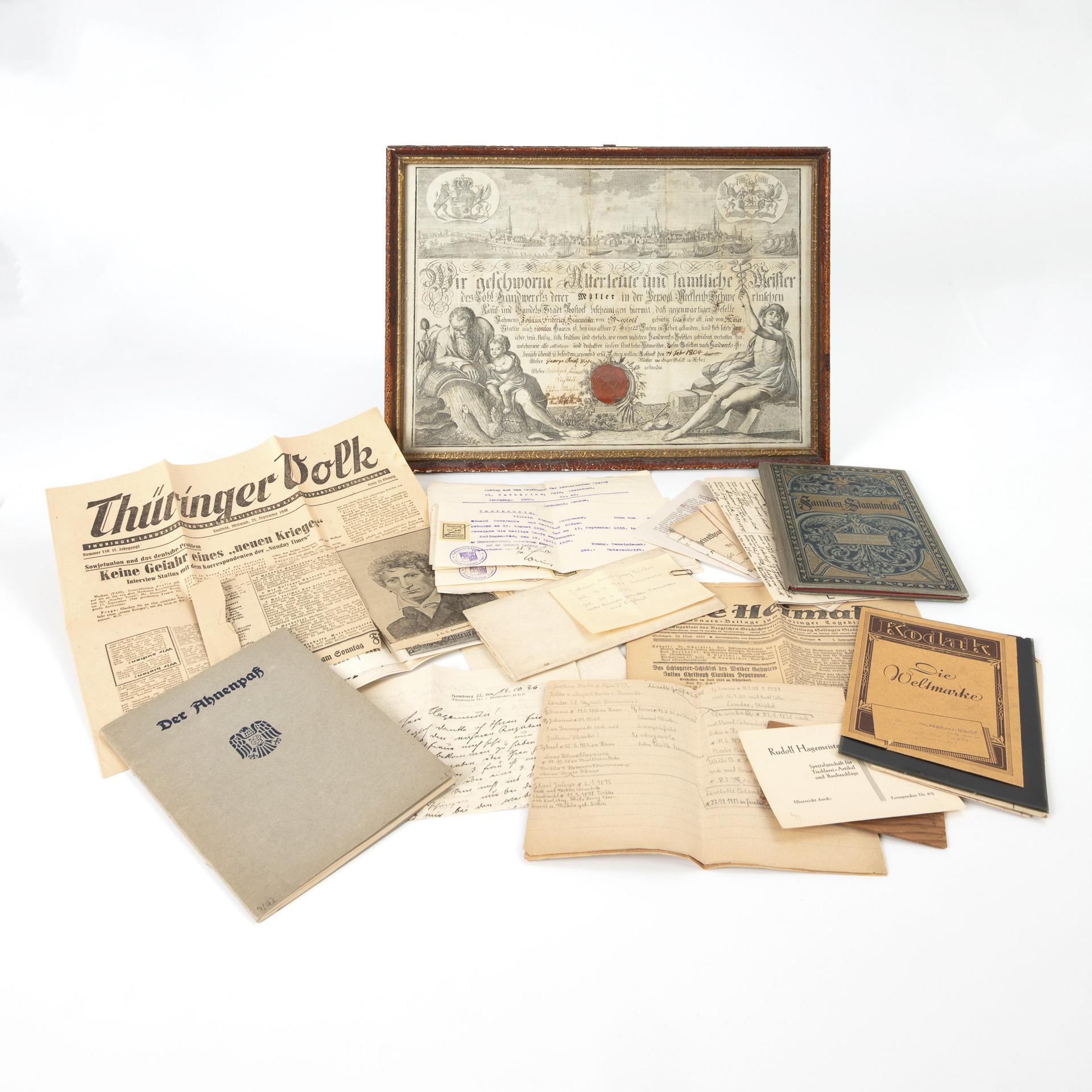 Gerahmter Gesellenbrief von 1804 für Johann Friedrich Hagemeister mit Zunftsiegel der Müller in Rostock. "Familien-Stammbuch" der Eheleute Hagemeister-Odendahl mit Eintragungen 1923 - 1976. "Ahnenpass" von Hilde Hagemeister in Saalfeld mit Eintragungen. "Ahnenblatt" der Familie Hagemeister-Müller-Albrecht. Handschriftlicher Stammbaum beginnend mit Isaak Devaranne. Negative vom Bildnis von Johann Christian Claudius Devaranne (1784 Hanau - 1813 Düsseldorf) und der Gedenktafel für ihn von 1933. Etliche Urkunden (Geburt, Taufe, Heirat) sowie zahlreiche Auszüge aus Tauf- bzw. Trauregistern für die Familien Devaranne, Odendahl, Greef, Albrecht usw.. Brief an die Eltern von Johann Ernst Georg Müller (1788-1847), der Kurier zwischen Hannover und England war. Brief von Pastor Heinz Hagemeister in Hamburg an Herrn Hagemeister mit genealogischen Angaben. Wenige Zeitungsausschnitte. Teils Alters-/Gebrauchsspuren.
