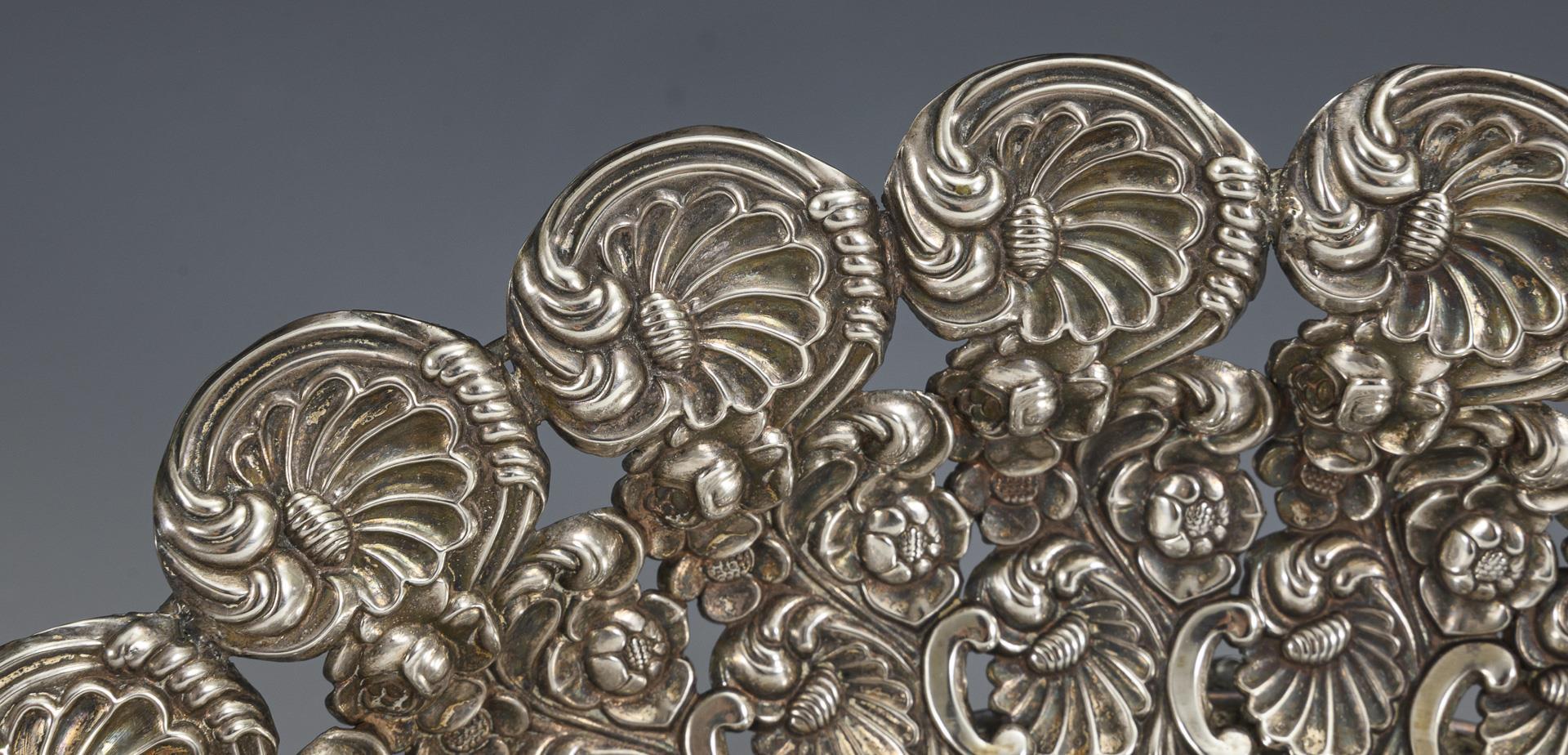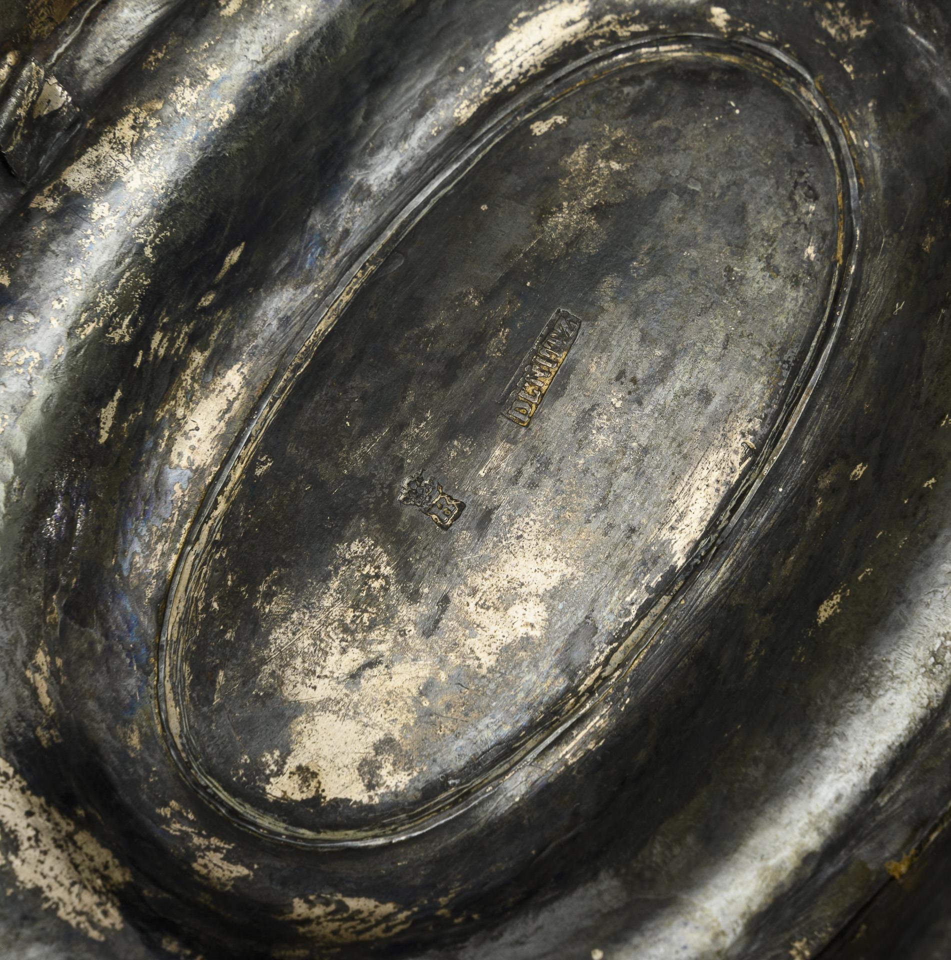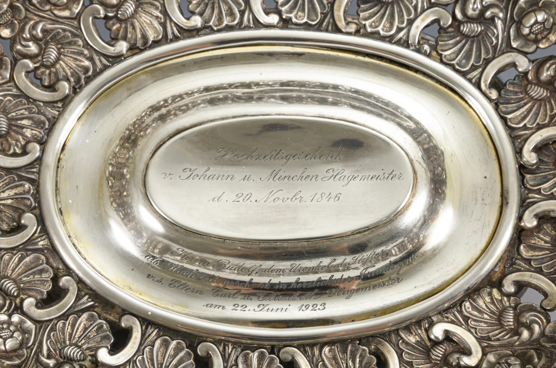 Reich reliefierte Henkelschale mit Widmungsgravur "Hochzeitsgeschenk v. Johann u. Minchen Hagemeister, d. 20. Novbr. 1846" sowie 2. Widmung von 1923 im vergoldeten Spiegel. Altersspuren, unterseitig Lötstellen und ergänzter? Verstärkungsring.