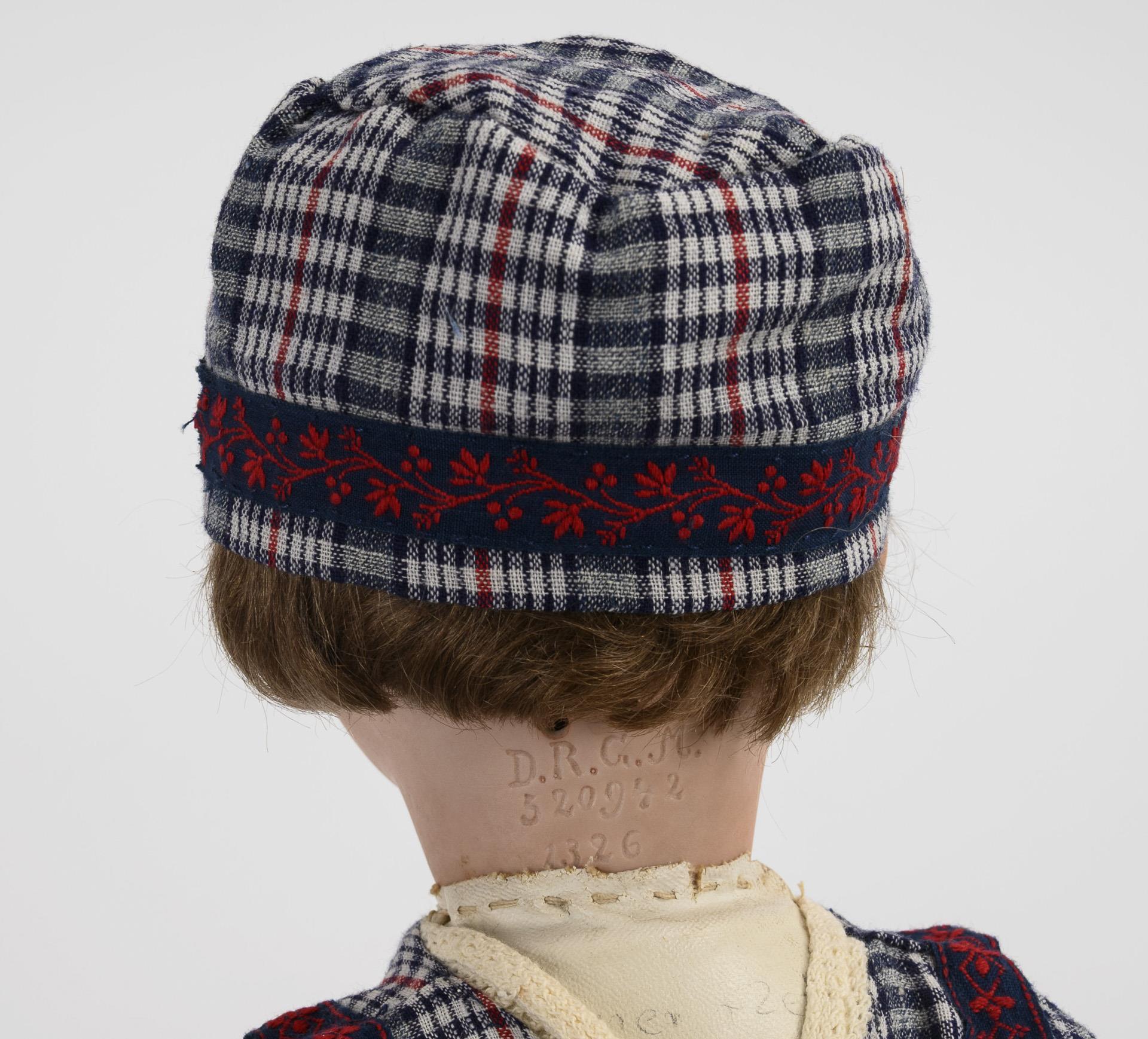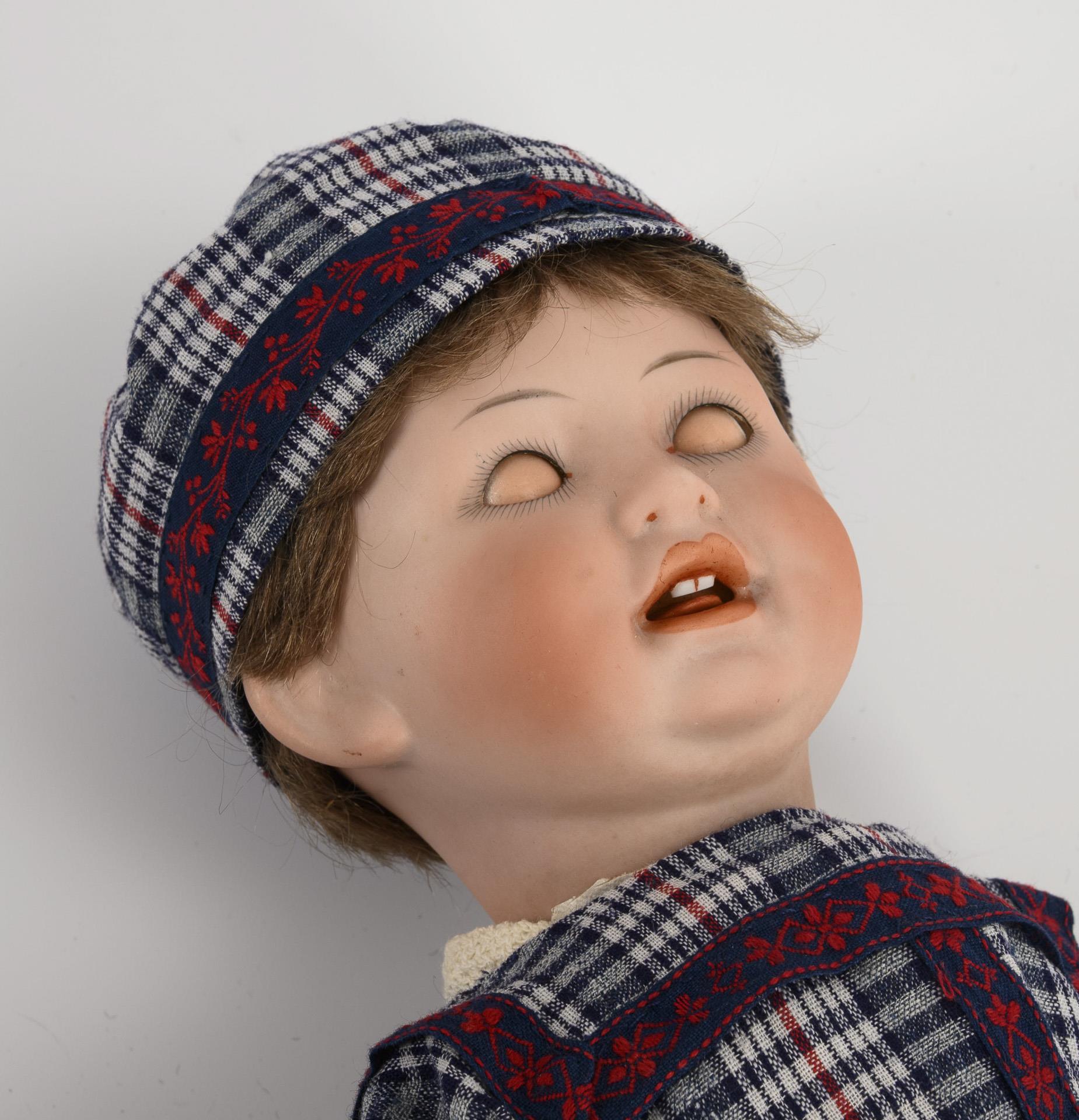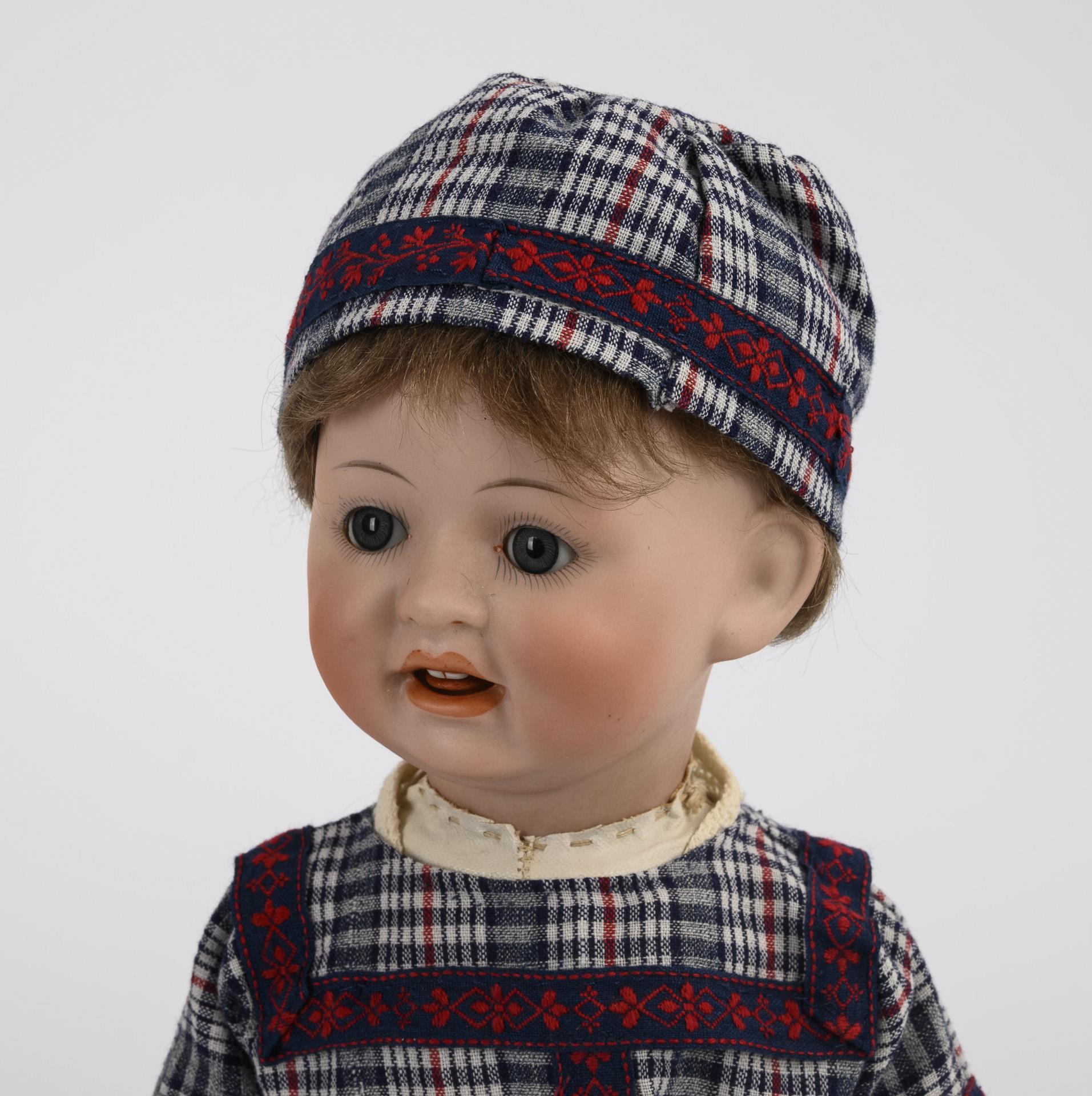 Feststehender Kurbelkopf, blaue Schlafaugen, offener Mund mit Zunge und 2 Zähnchen, dunkelblonde Mohairperücke. Weißer Wachstuchkörper mit Gliederarmen. Nachgenähtes, kariertes Kleidchen mit gemusterten Borten, passende Kappe, alte braune Lederschuhe. Kopf durchleuchtet: ohne Defekte (Halskurbel verdeckt).