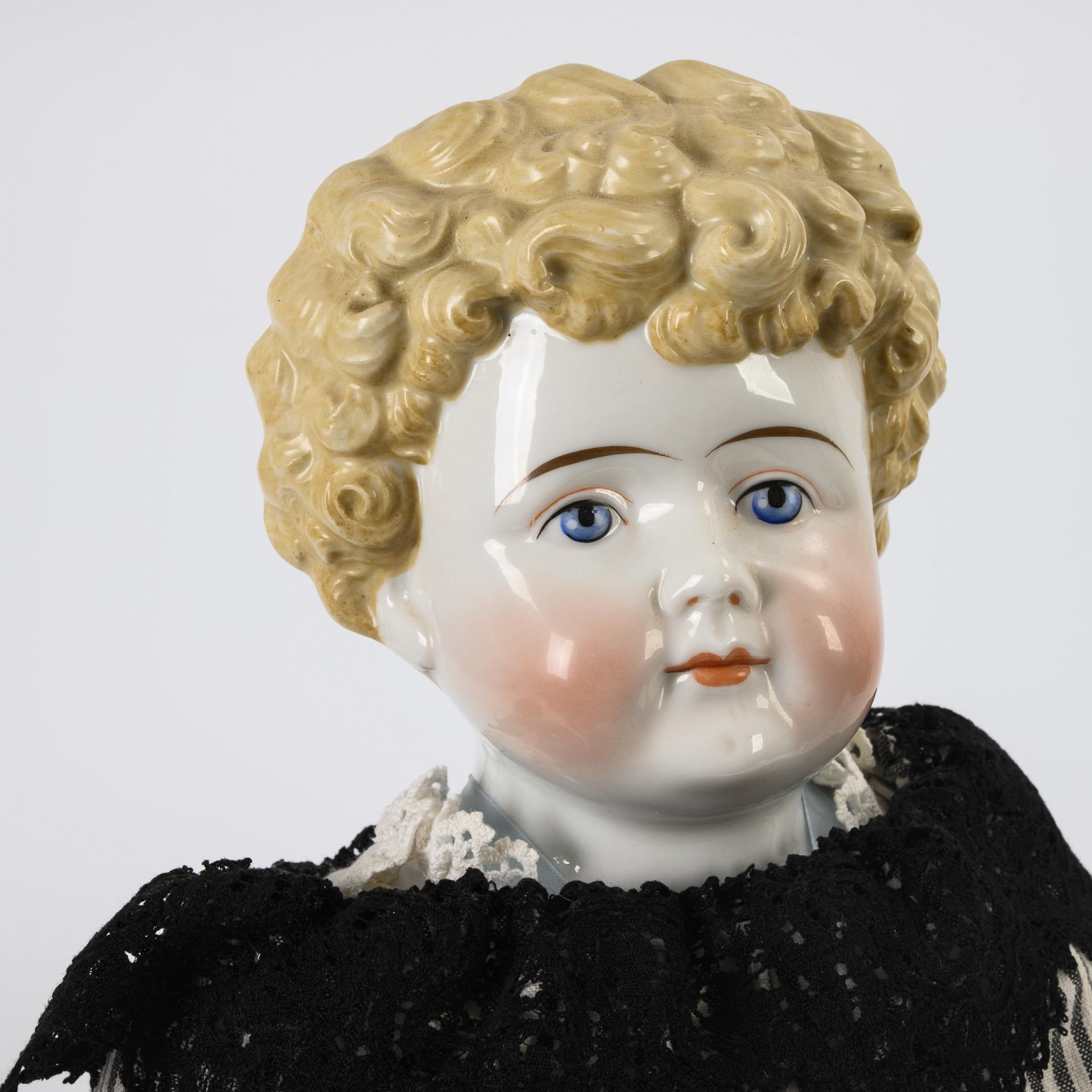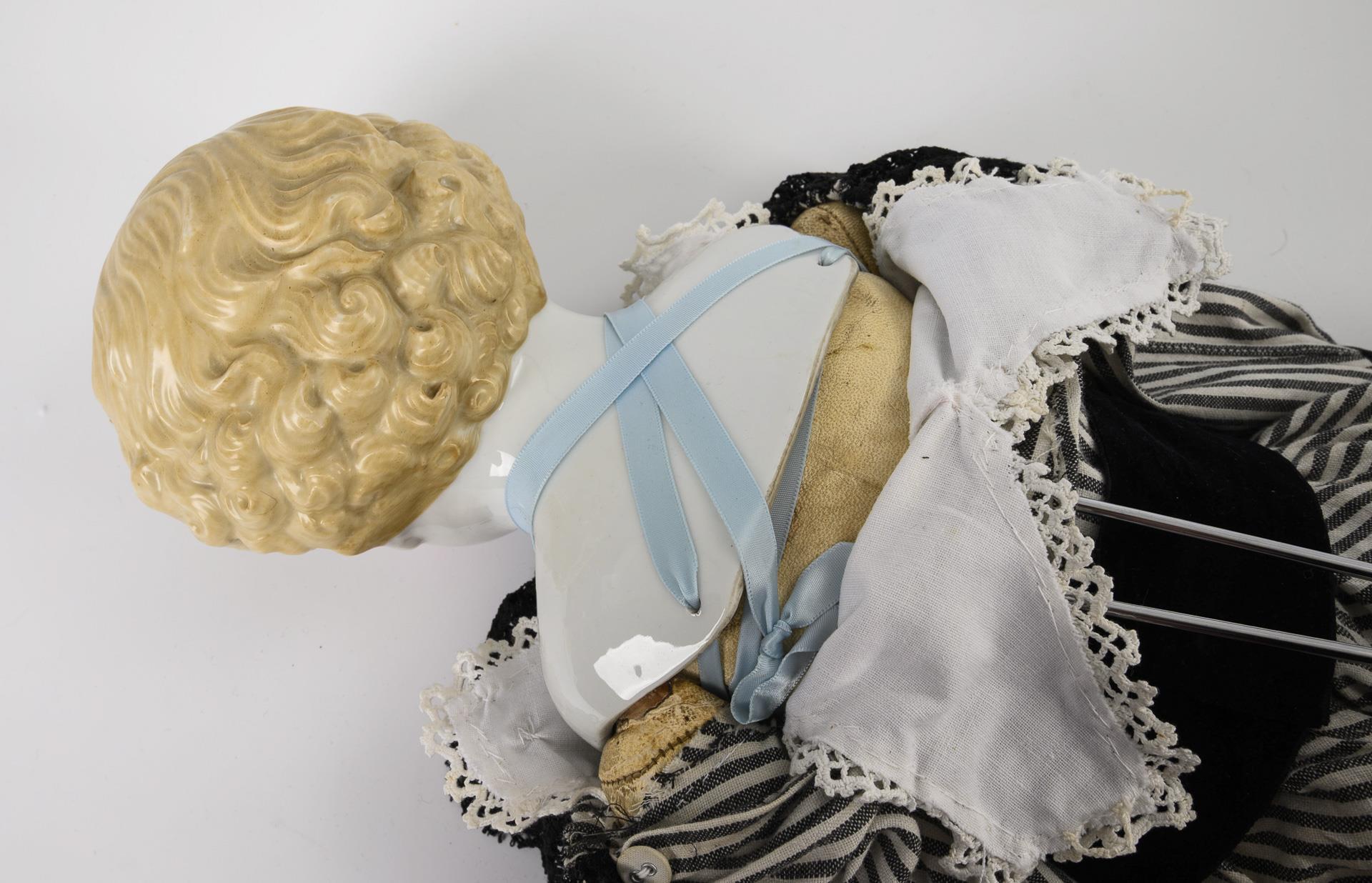 Glasierter Kopf mit gemalten blauen Augen und blonden, modellierten Haaren. Weißer Lederkörper mit einem Biskuit- und einem Celluloidarm. Gestreiftes Kleid mit schwarzem Samtgürtel, alte braune Lederschuhe. Körper mit Altersspuren.