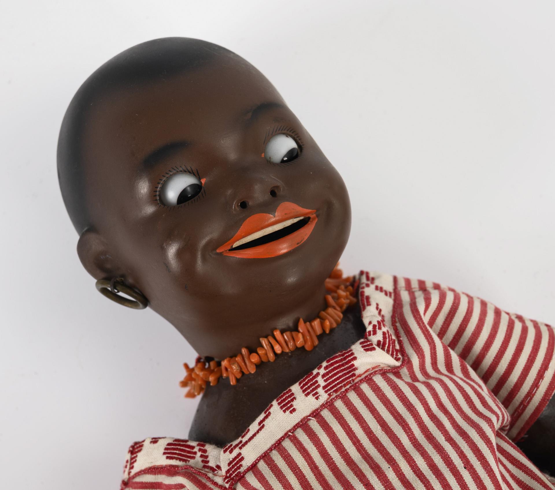 Kurbelkopf, braune Glasaugen, breiter lachender Mund mit modellierter Zahnreihe, schwarzer Haarboden mit runder Bohrung an der Kopfkrone (für Haarlocke oder Schmuck?), Ohrringe. 5-teiliger Sitzbabykörper. Rot-weiß gestreiftes Kleidchen. Partiell berieben, 2 Finger der rechten Hand geklebt.