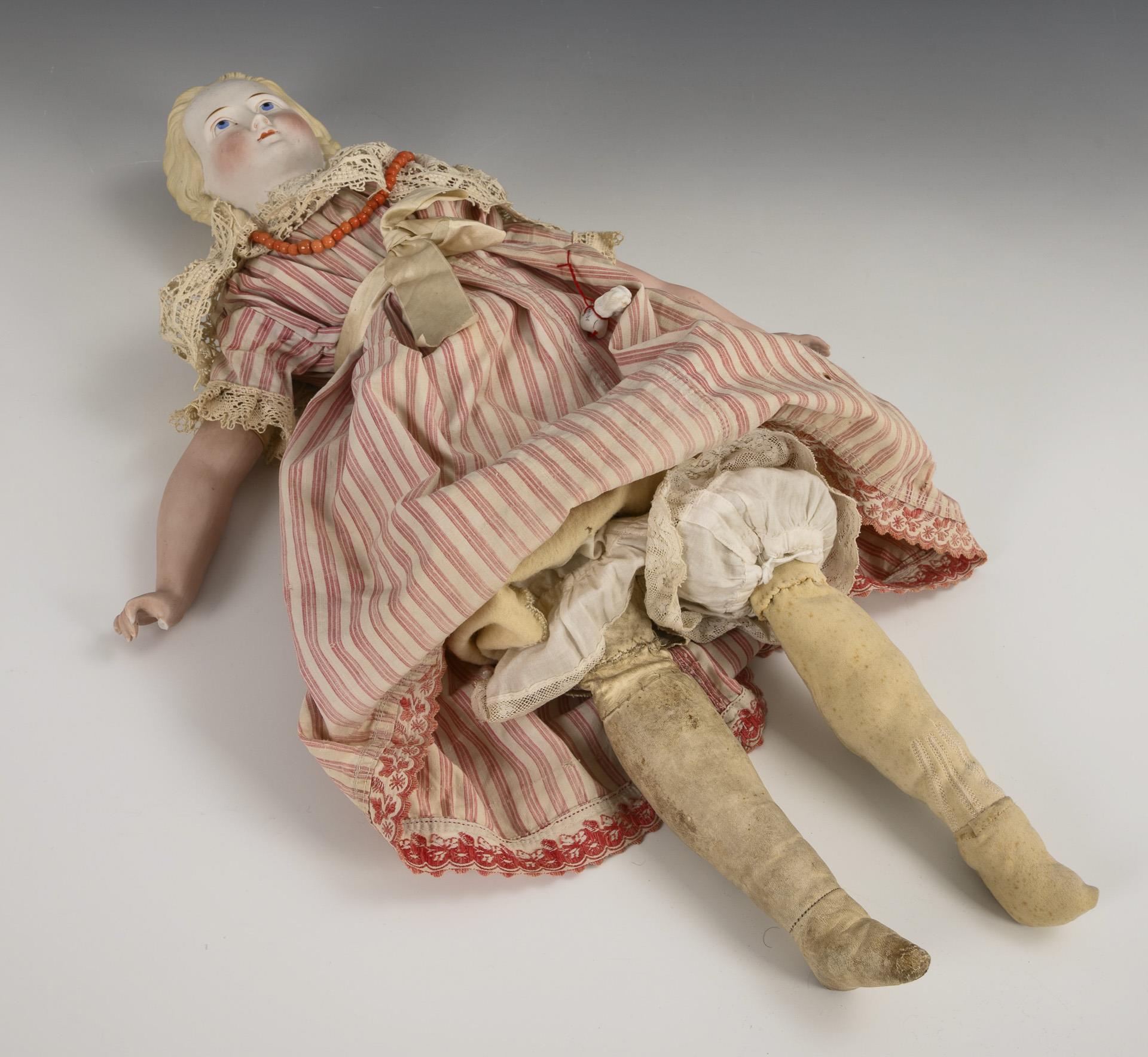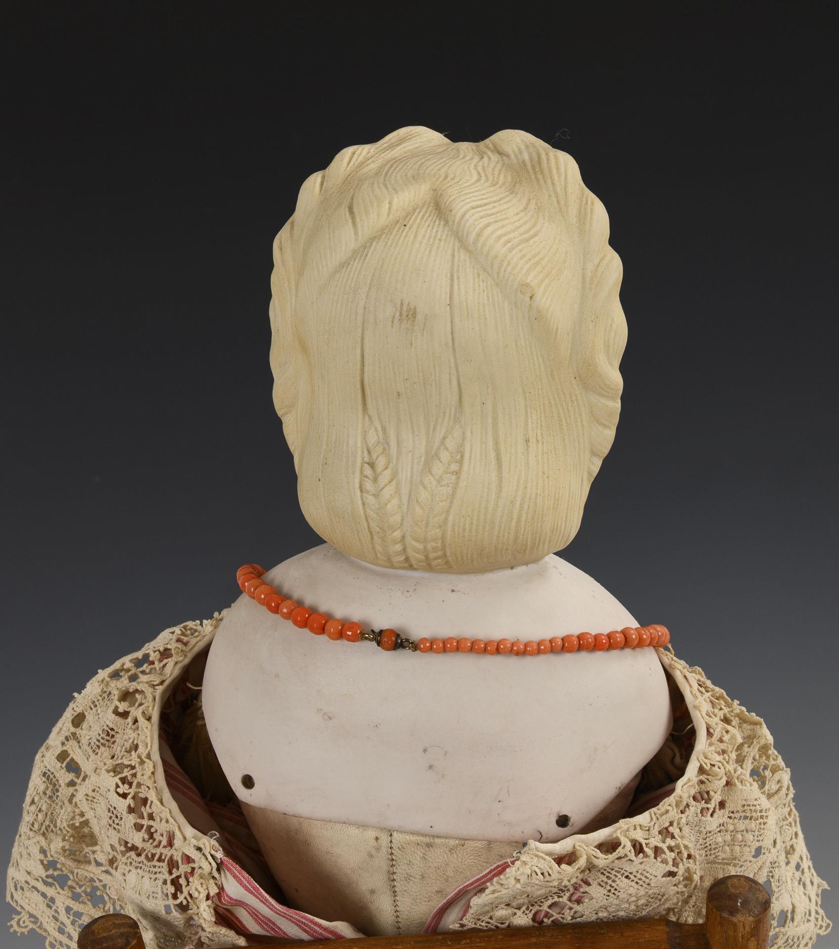 Wohl Firma Kister, Scheibe. Tief heruntergezogener Brustkopf, gemalte blaue Augen, modellierte blonde Haare mit kunstvoller Flechtfrisur. Lederkörper mit Biskuitunterarmen. Rot gestreiftes Kleid mit Spitzenkragen, Korallenkette, jüngere Lederschuhe. Dazu Holzstuhl (35 x 22 x 20 cm) und kleiner weißer Brustkopf gleichen Typs (H 3 cm). 1 Bein aus Stoff ergänzt, 2 Finger rechts defekt.