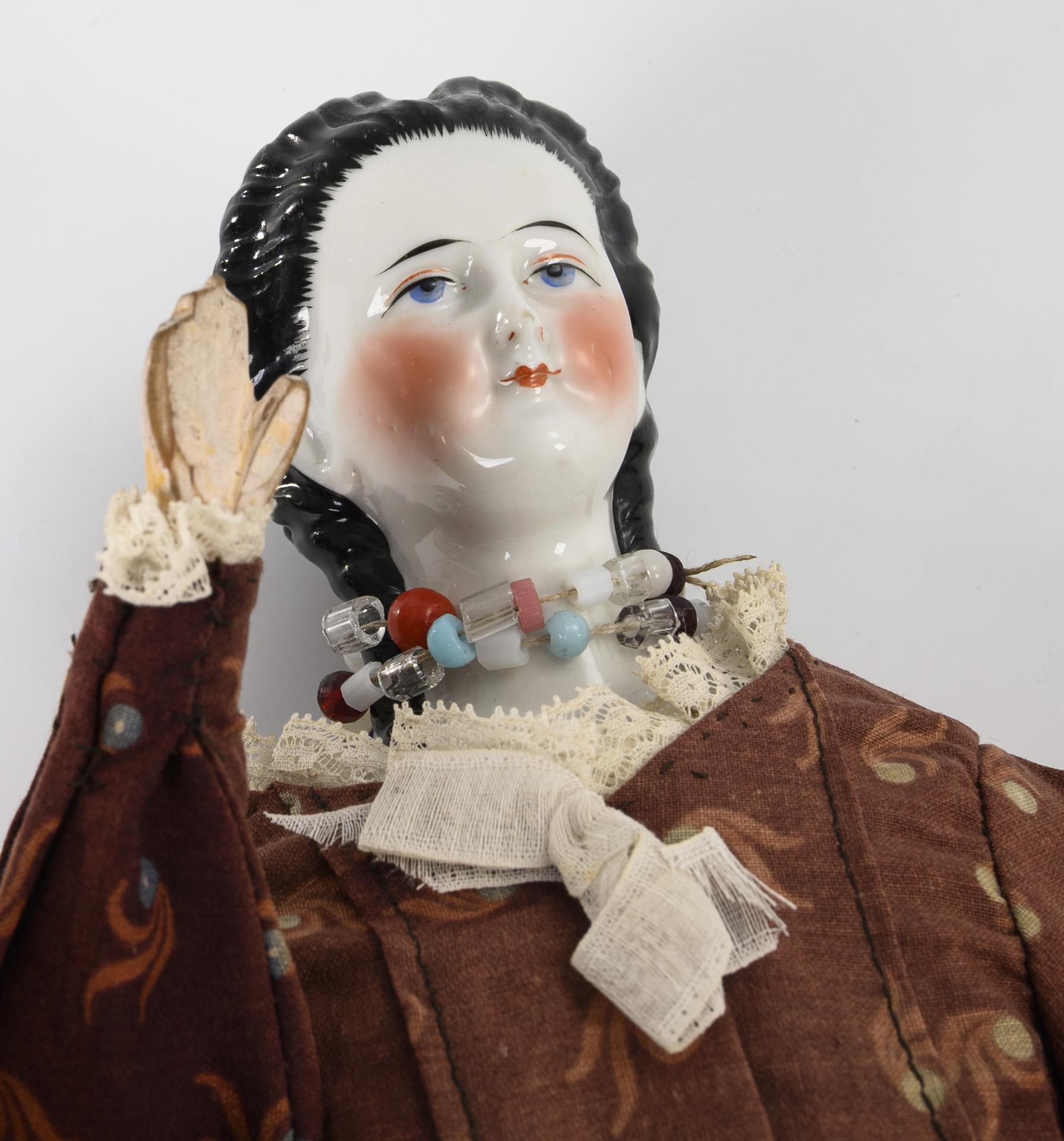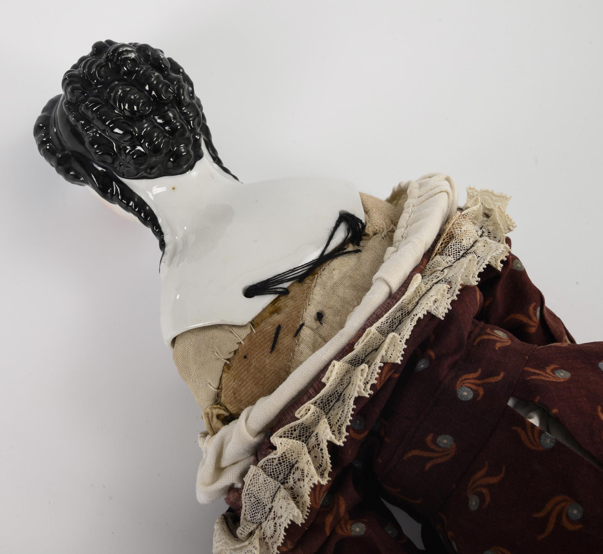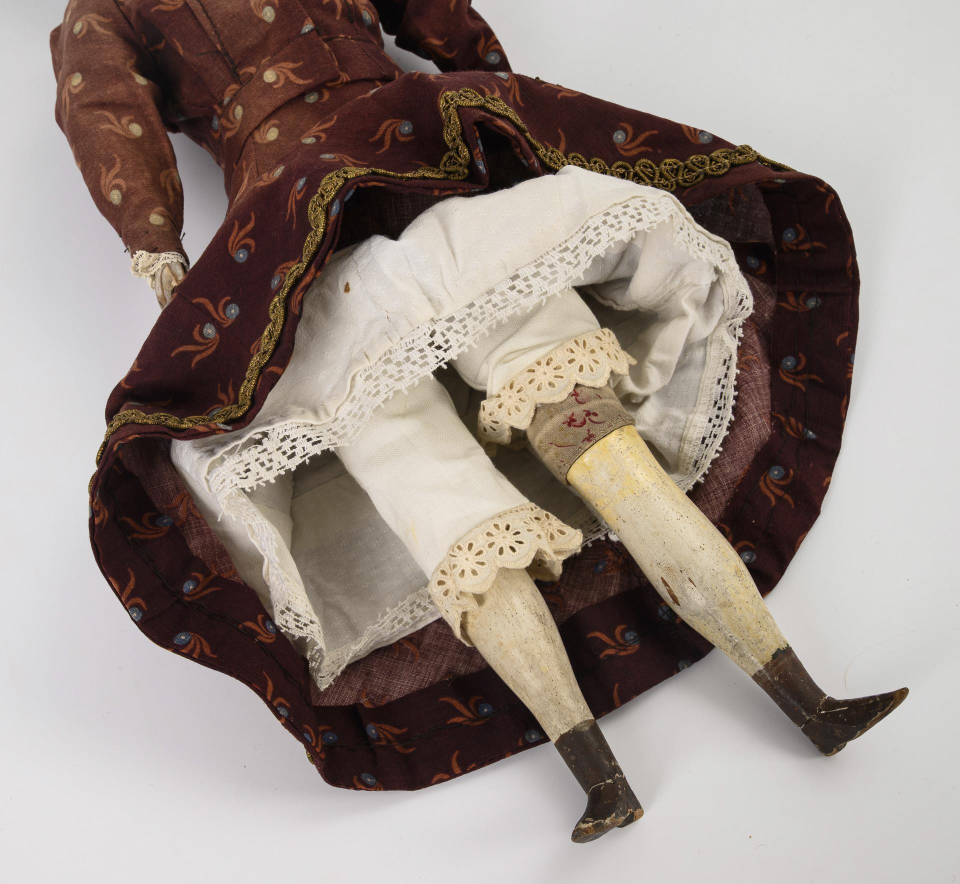 Brustkopf, gemalte blaue Augen, schwarze Haare, Stoffkörper, Holzunterarme und -Unterschenkel mit geschnitzten Stiefeln, originale Unterwäsche und nachgenähtes braunes Kleid. Kopf locker auf Körper aufgesetzt, Daumen links bestoßen, Füße geklebt.