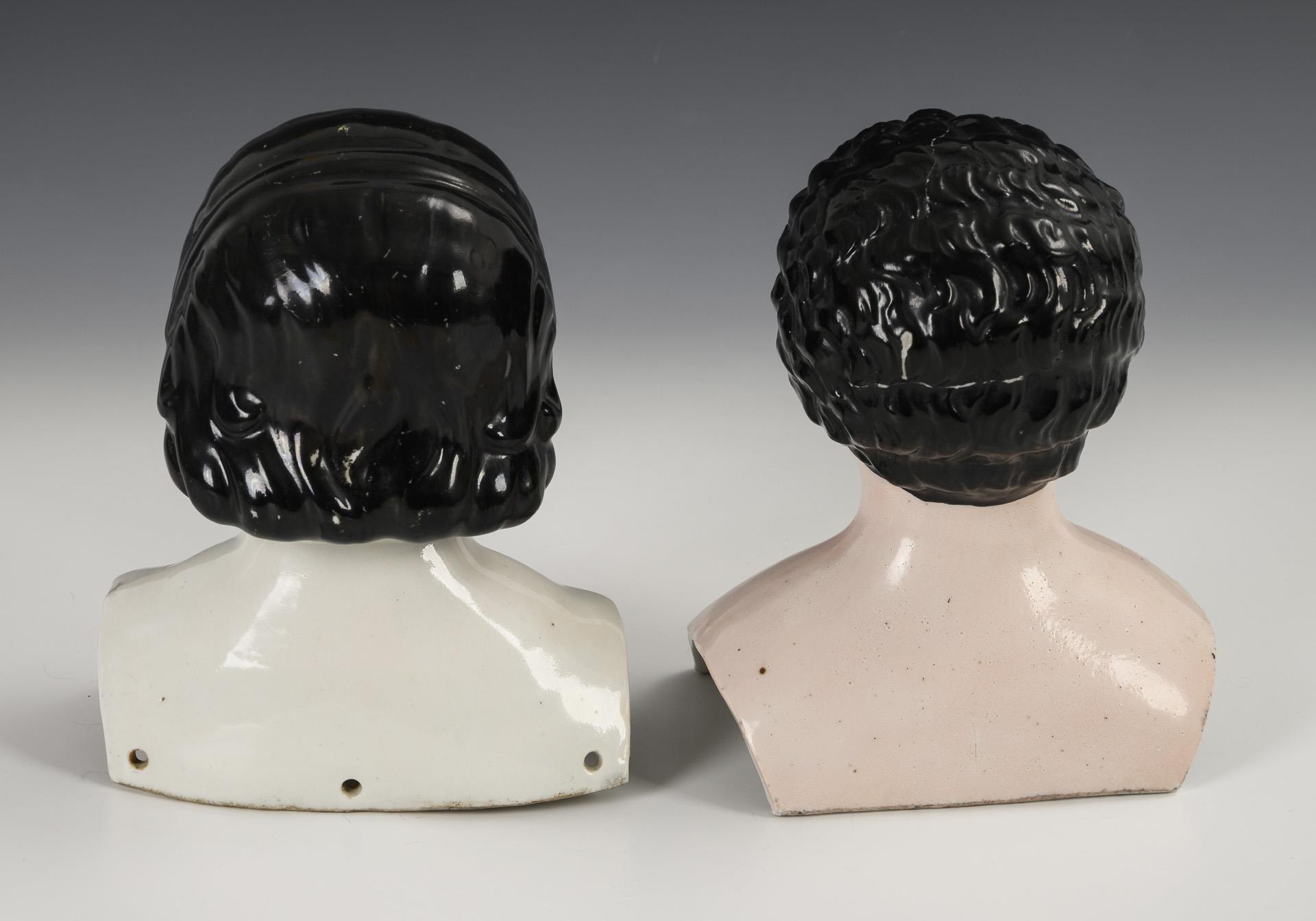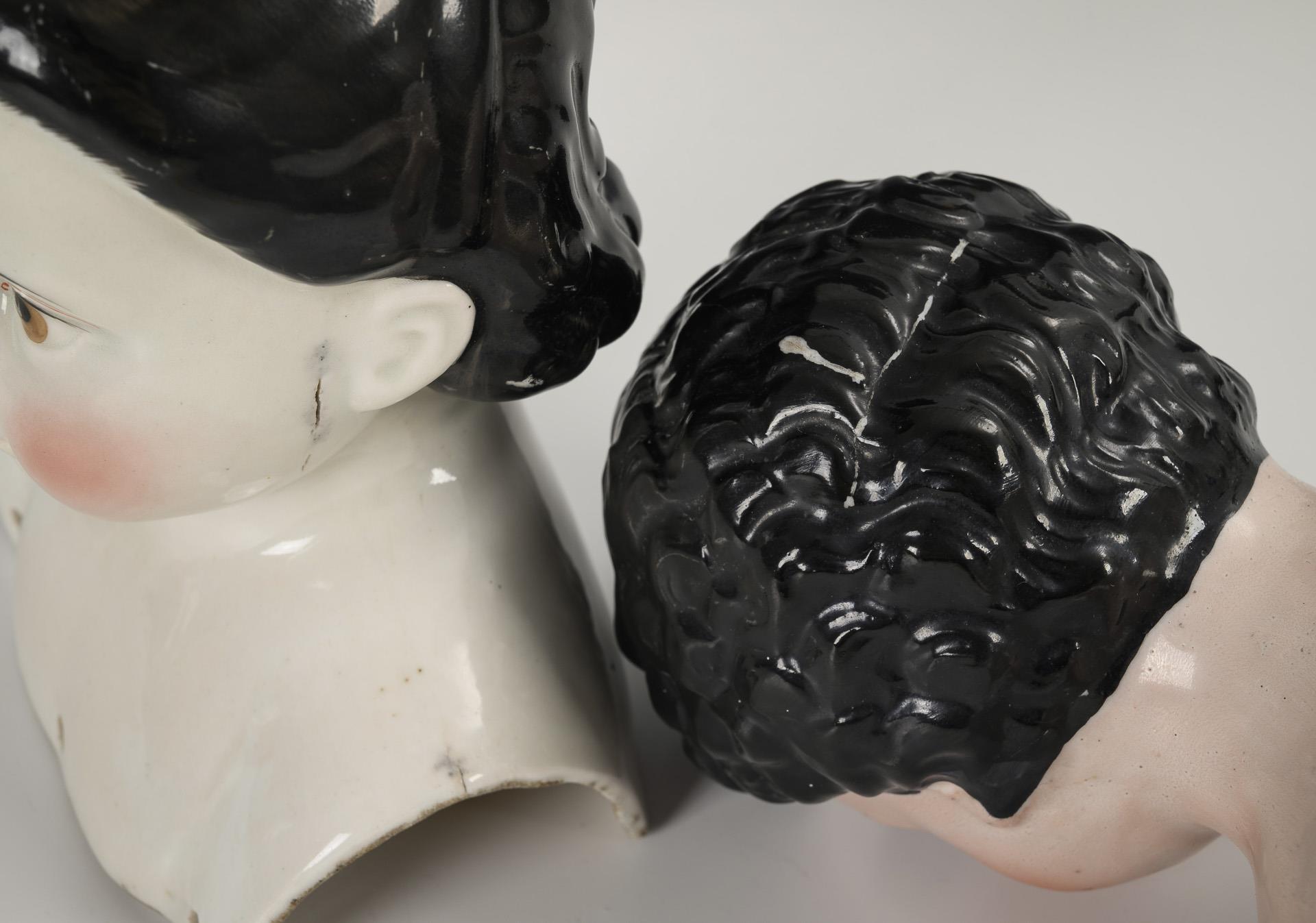 2 große, glasierte Brustköpfe: 1x weiß, Typ "Alice im Wunderland" mit braunen Augen und modelliertem Haarreif. 2 Brandrisse, 1 kleine Bestoßung. H 19 cm. / 1x rosa getönt mit blauen Augen und lockigen Haaren. Haarrissig. H 18 cm.