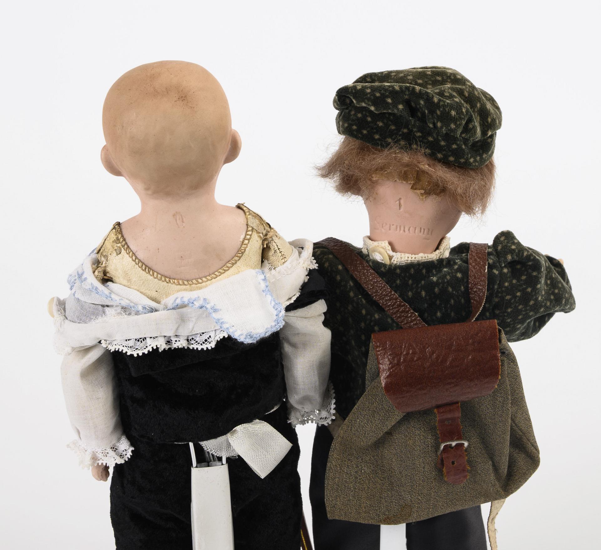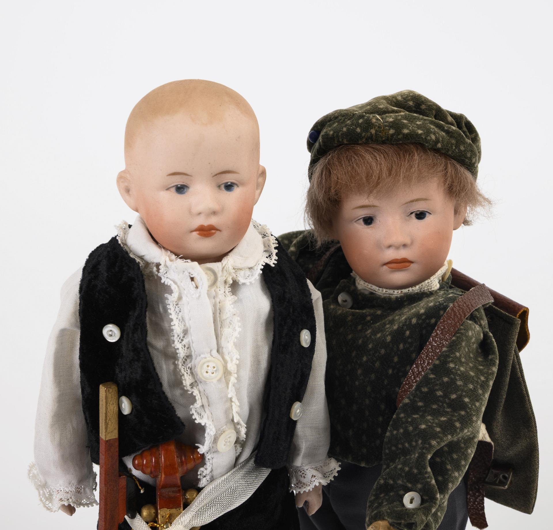 Beide mit Intaglio-Augen und geschlossenem Mund. 1x mit Brustkopf, getöntem Haarboden, lose gefülltem Lederkörper, schwarzem Samtanzug und Geige. L 31 cm. / 1x mit Kurbelkopf, Mohairperücke, 9-teiligem Gliederkörper, grauer Hose, Samtjacke und Rucksack. L 28 cm. Köpfe nicht durchleuchtet: ohne sichtbare Defekte.