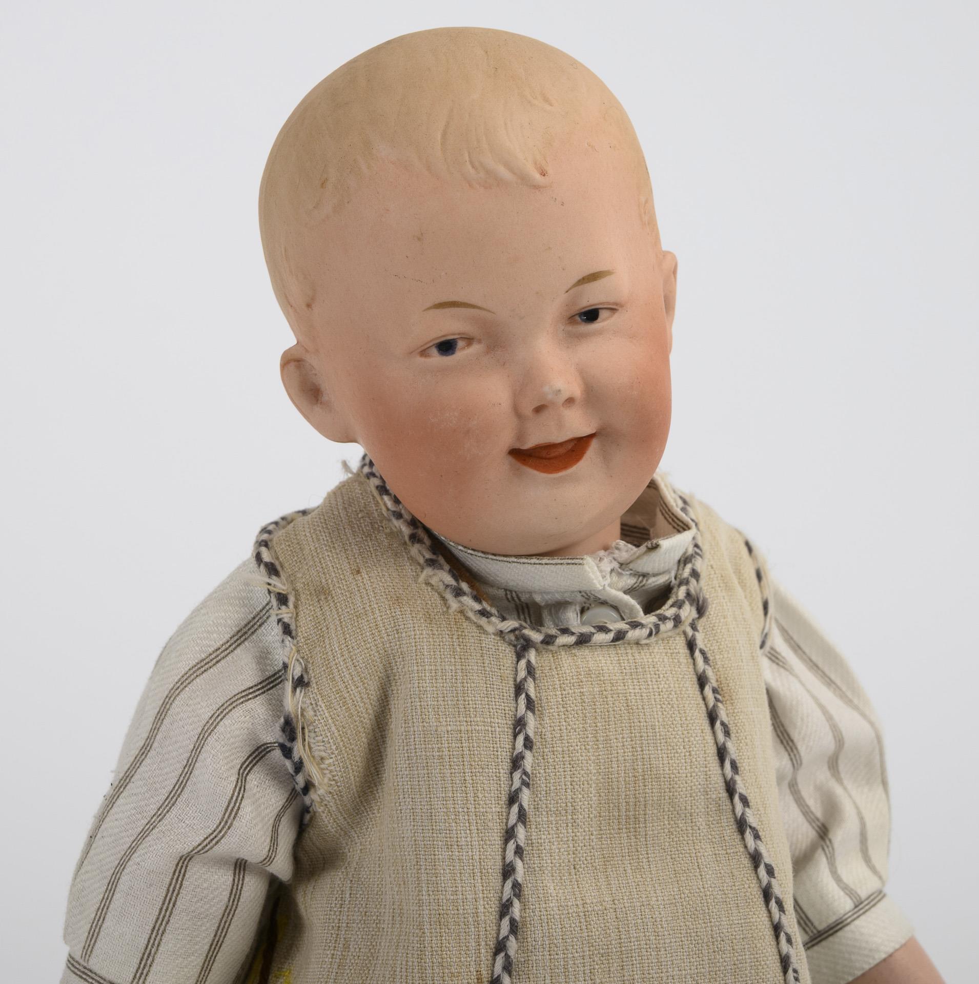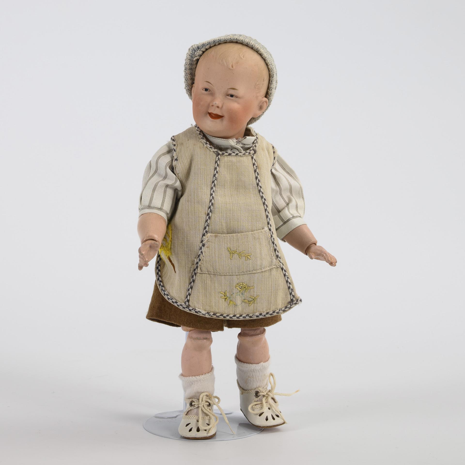 Kurbelkopf, blaue Intaglio-Augen, lachender, offen/geschlossener Mund, modellierte blonde Haare. Zierlicher, 13-teiliger Gliederkörper. Braune Filzhose, alte Schürze. Rechter Fuß geklebt.