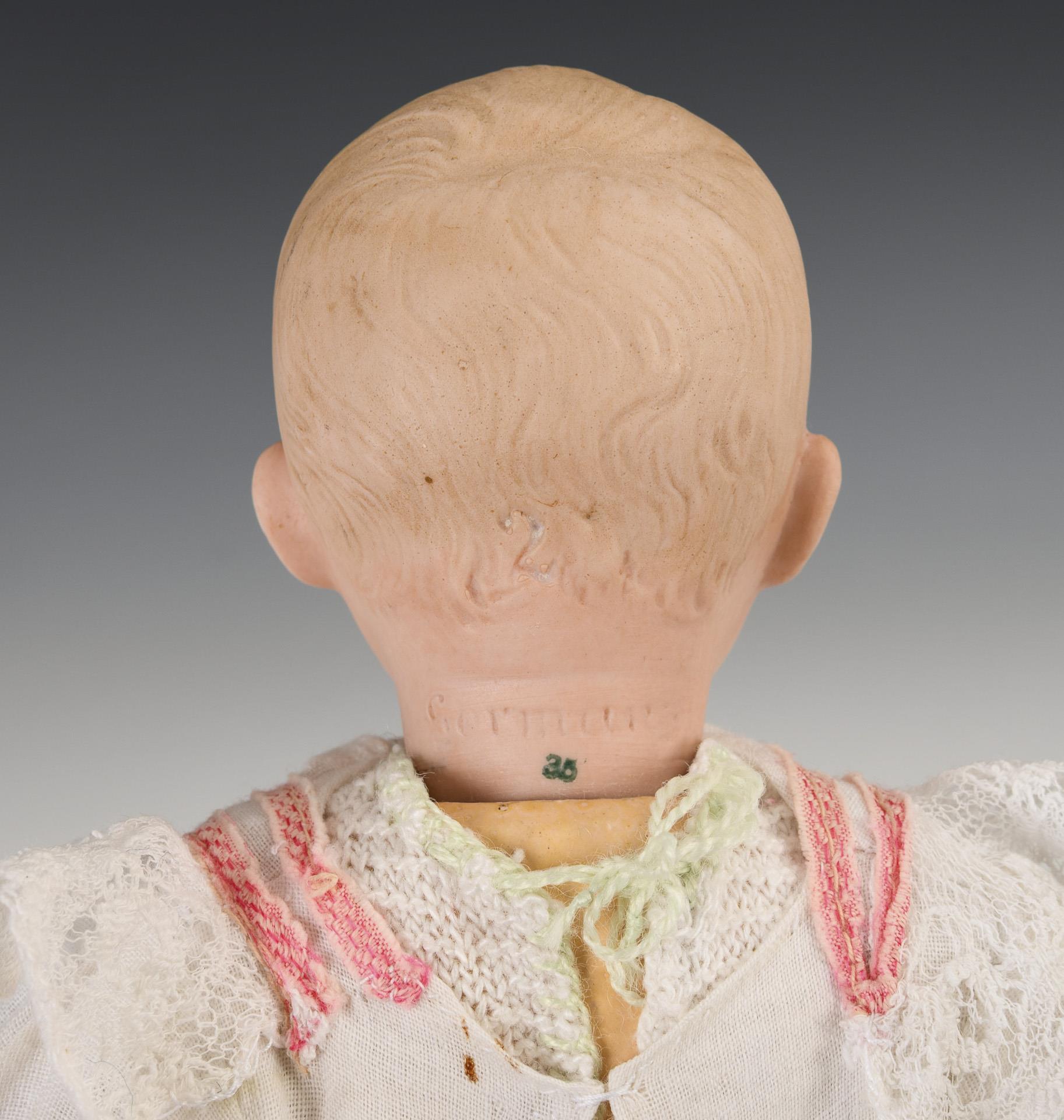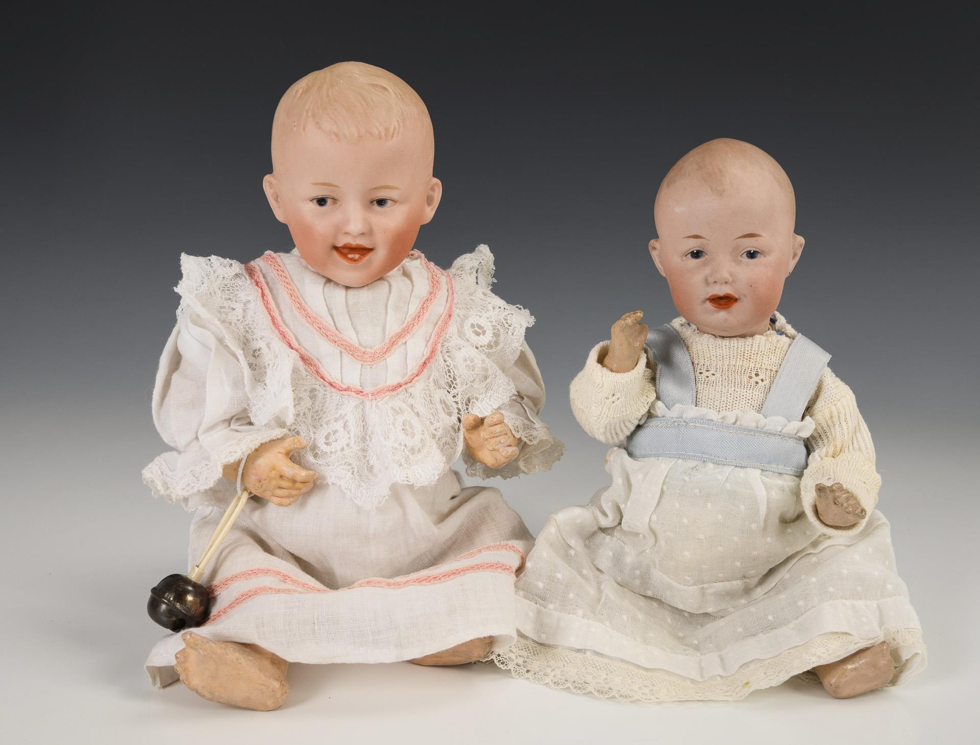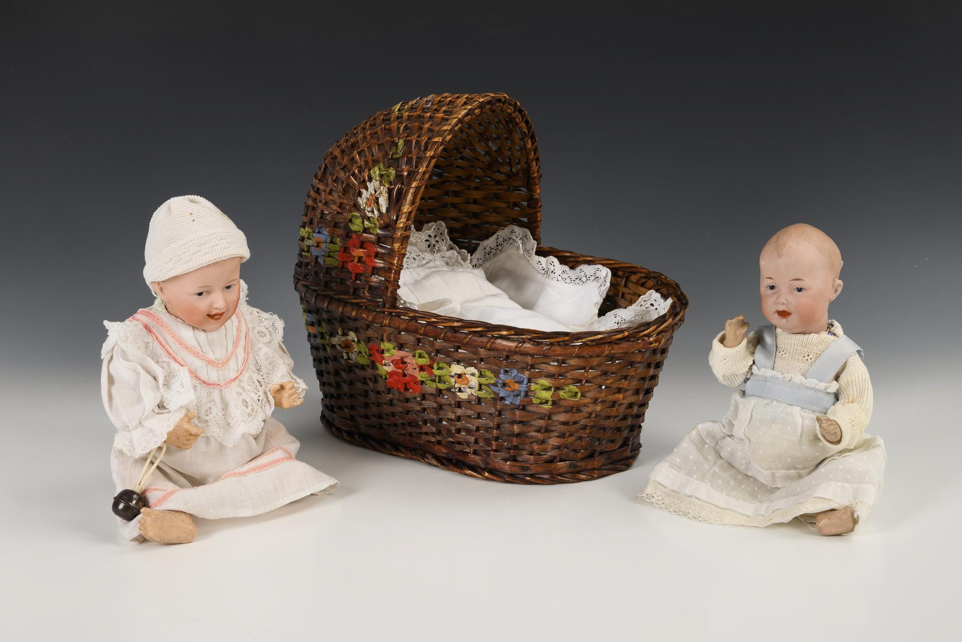 Beide mit Kurbelkopf, Intaglio-Augen, offen-geschlossenem Mund, modellierten Babyhaaren und 5-teiligem Sitzbabykörper. 1x sitzender "Lacher" mit 2 Zähnchen, in weißem Kleid, dazu Rassel. Eine Hand mit Reparaturspuren. L 27 cm. / 1x Baby (Quadratmarke) mit weißem Kleid, dazu Flechtkörbchen. L 23 cm. Etwas bespielt.