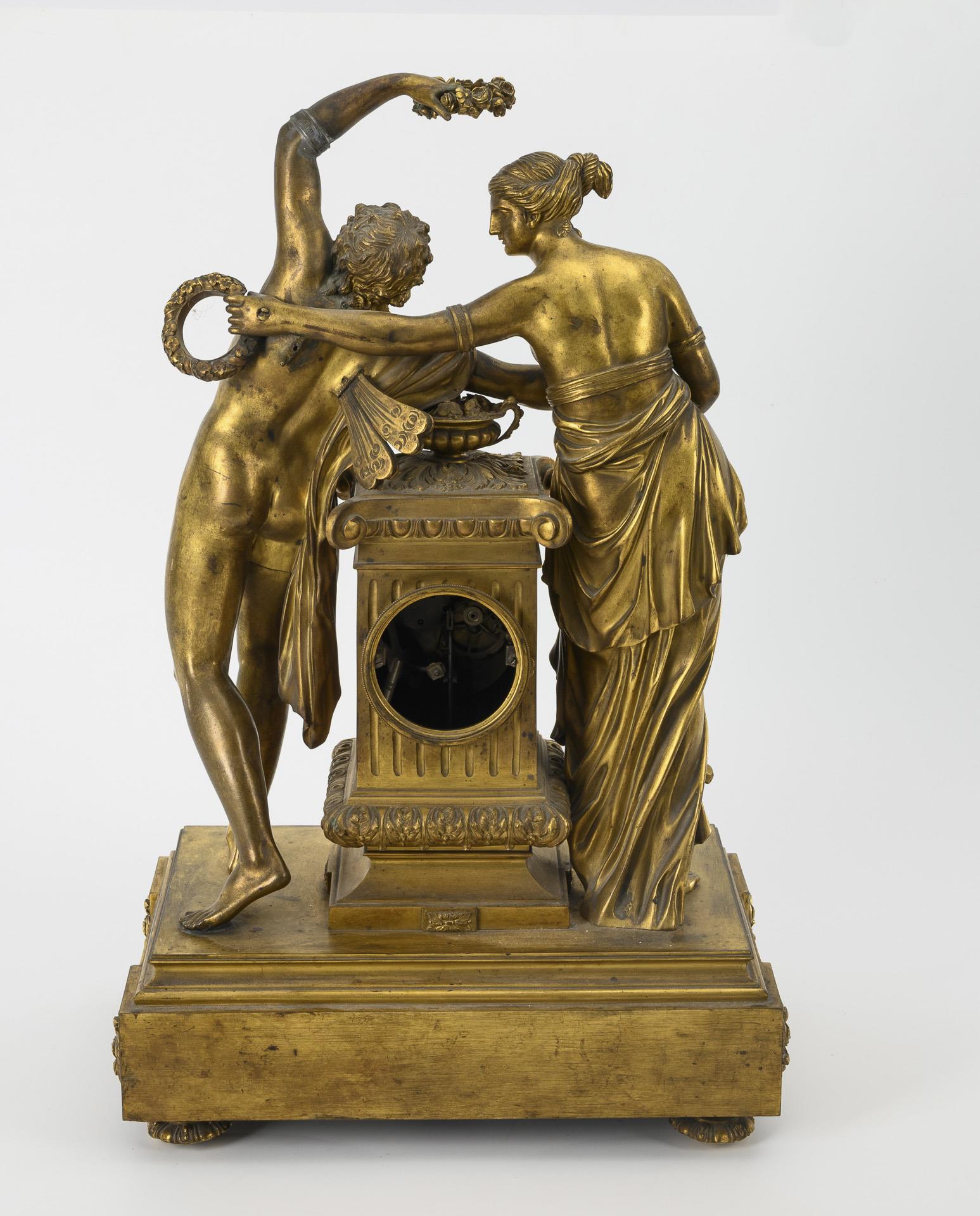 Floral reliefierter Stufensockel mit bekrönender Uhrenstele und antikisierendem Figurenpaar mit Lorbeerkränzen. Altersspuren, Glocke, rückseitiges Glas und 1 Flügel am Amor fehlend, Defekte am Emailziffernblatt.