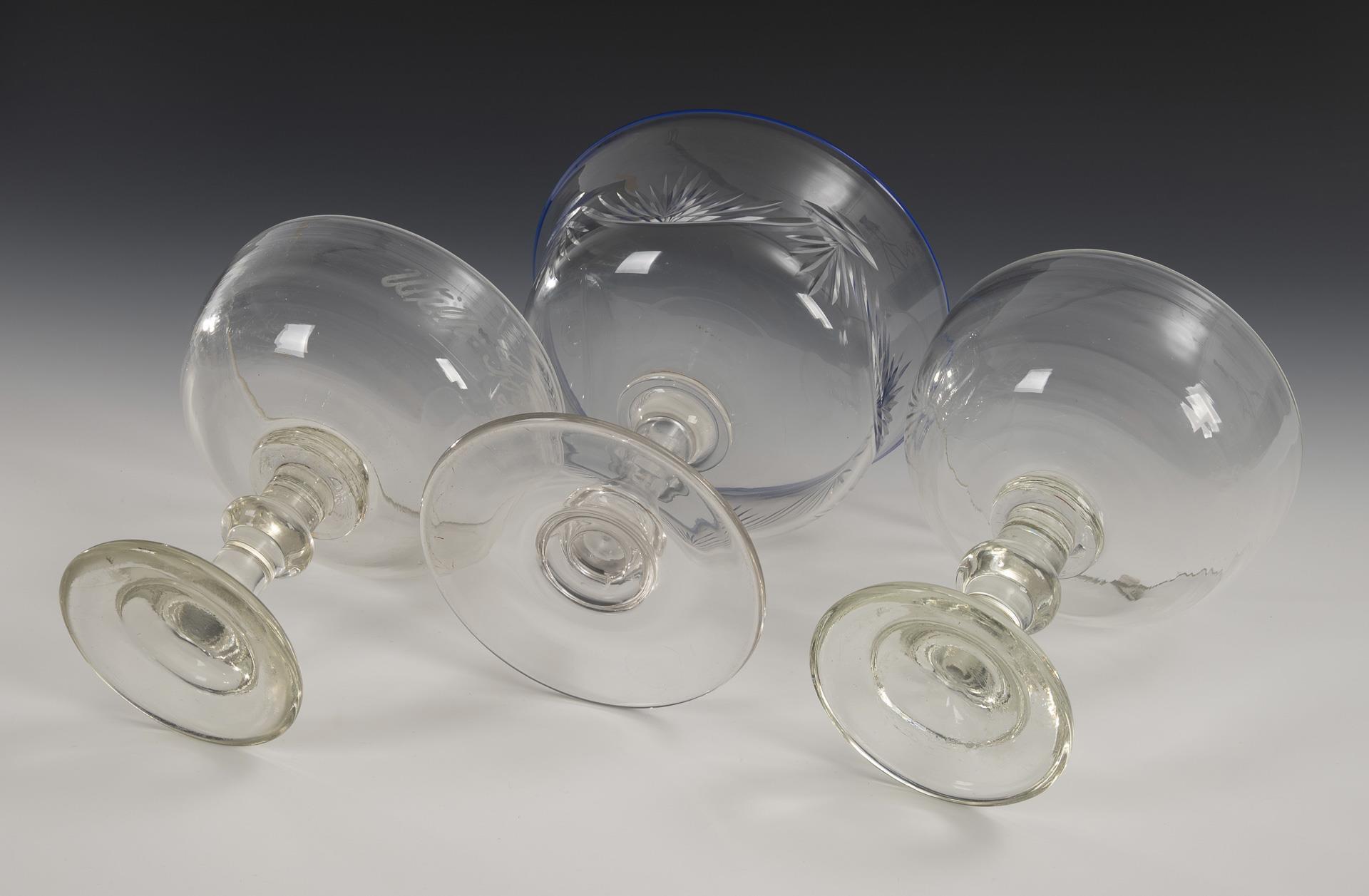 2 Gläser mit breiter, bauchiger Kuppa, Zinnemailrand, nodiertem Schaft und Rundfuß, 1x bezeichnet "Wilh. Gogol.". / 1x Fußschale aus farblosem Glas mit Kerbschliffdekor auf der Kuppa mit Kobaltglasrand, Hohlschaft, Rundfuß.
