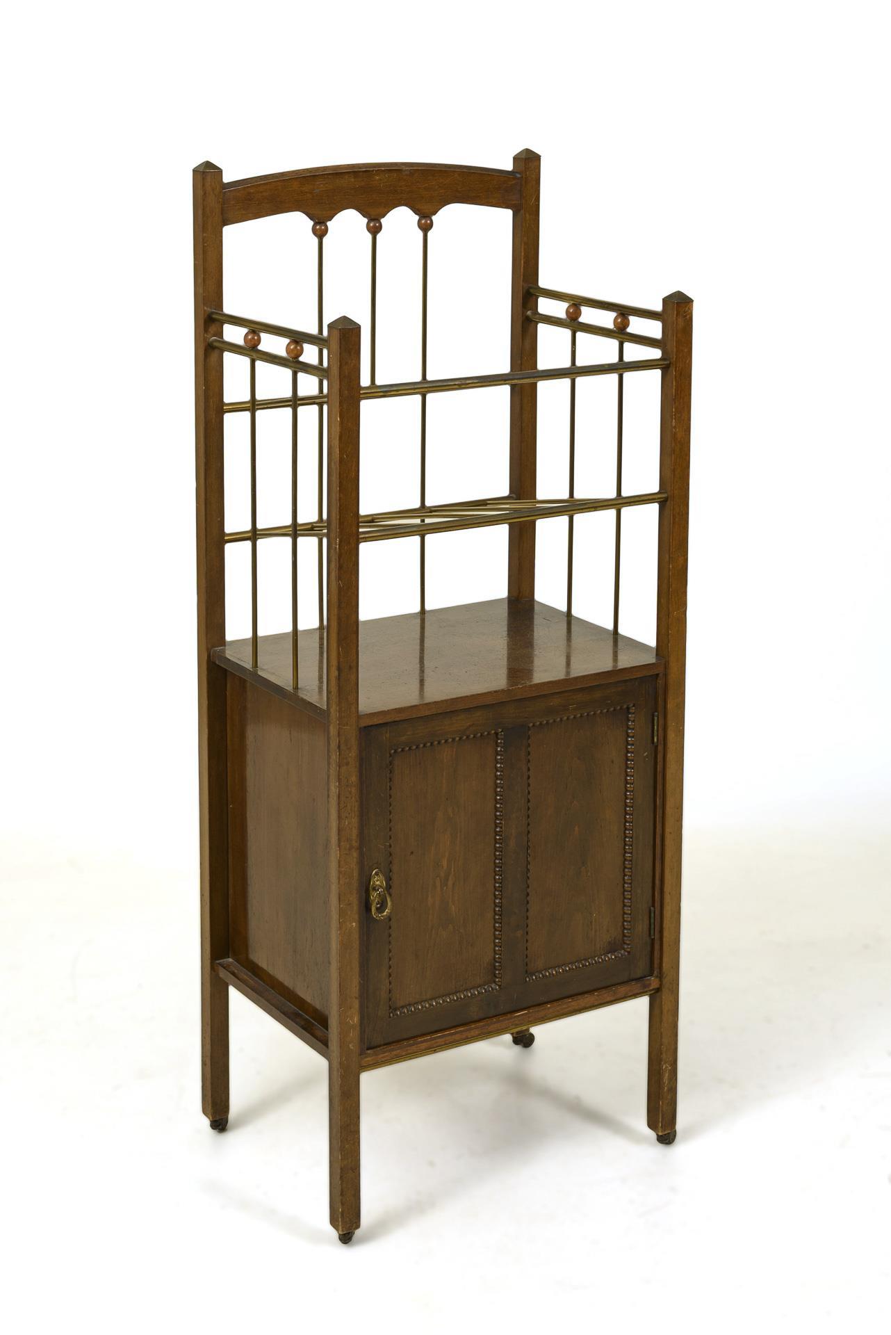 Rollbares Beistellmöbel mit 3 offenen, oberen Ablagefächern mit Messingverstrebungen und Kugelzier, 1 Sockelfach mit kassettierter und perlgeränderter Tür, auf 4 hohen Beinen mit Rollfüßen. Ringgriff aus Messing. Alters- und Gebrauchsspuren.
