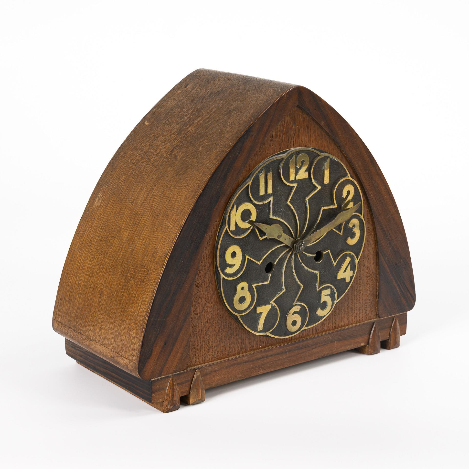 Spitzbogengehäuse mit dezentem Holz- und Messingdekor. Partiell kleine Schäden am Holz.
