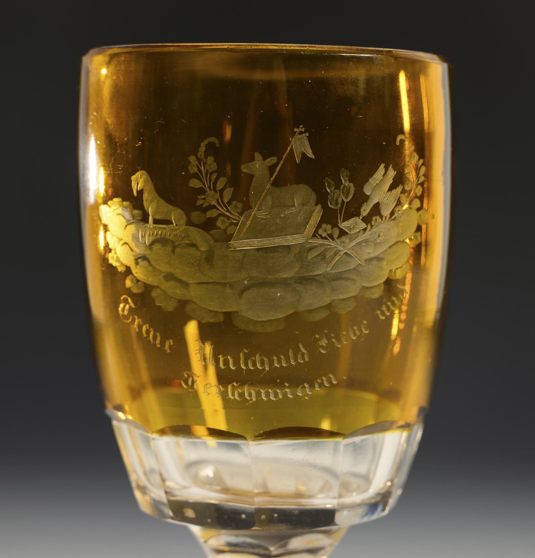 Ovoide, am Ansatz facettierte Kuppa, facettierter und nodierter Schaft, Rundfuß mit kerbgeschliffenem Boden. Schauseitig gravierte, auf einer Wolke angeordnete Symbole (Hund, Lamm, Taube), darunter die Worte "Treue, Unschuld, Liebe und Verschwigen". 2 kleine Bestoßungen am Mündungsrand.