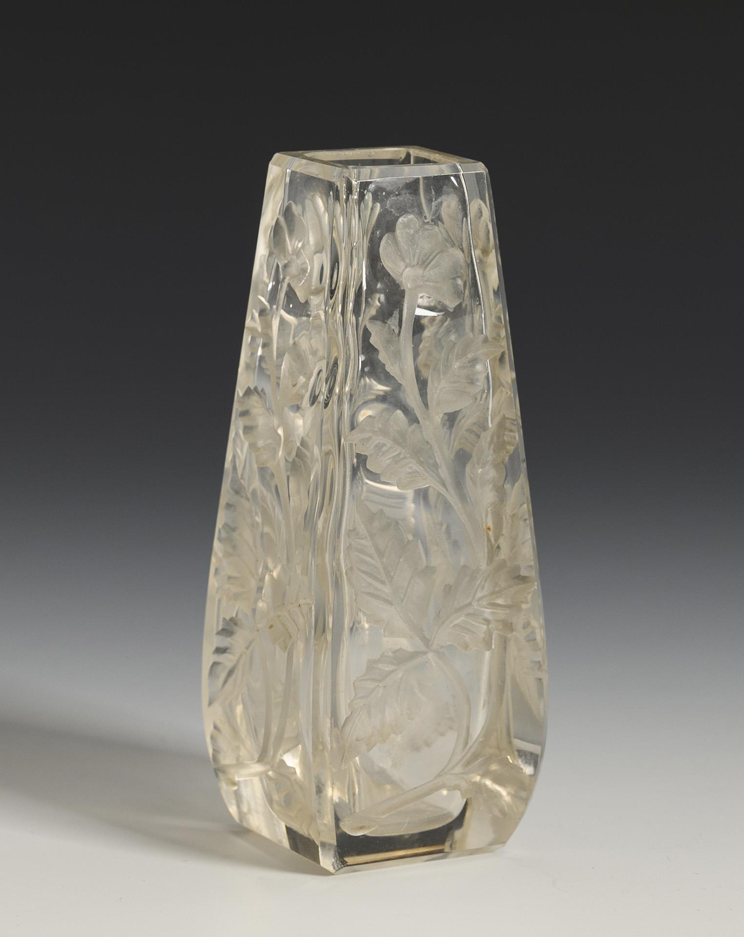 1x 2. H. 19. Jh.: halbkugelige Karaffe mit facettiertem Hals, Stopfen und Goldstaffage; ausgekugelter Abriss (H 22 cm). / 1x um 1930: formgeblasenes Vierkantväschen mit allseitigem, vertieftem Blumenrelief (H 11 cm) . Minimaler Goldabrieb, Chip am Karaffenrand.