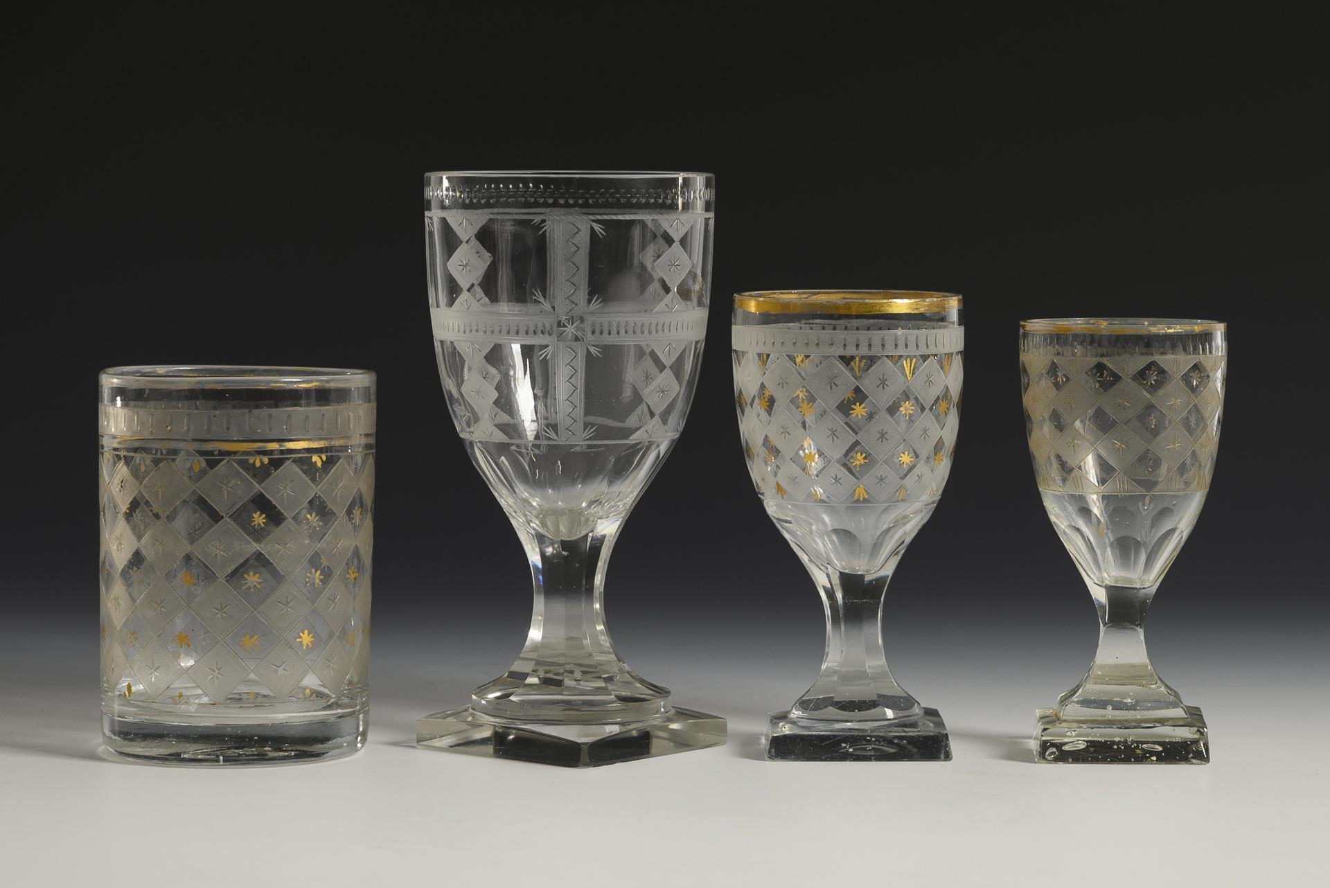 3x mit graviertem Harlekinsmuster: Zylinderbecher, 2 verschiedene Kelchgläser mit Quadratfuß. / 1x Kelchglas mit Quadratfuß und geometrischer Gravur. Gold berieben, Füße und Mündungsränder teils minimal bestoßen.