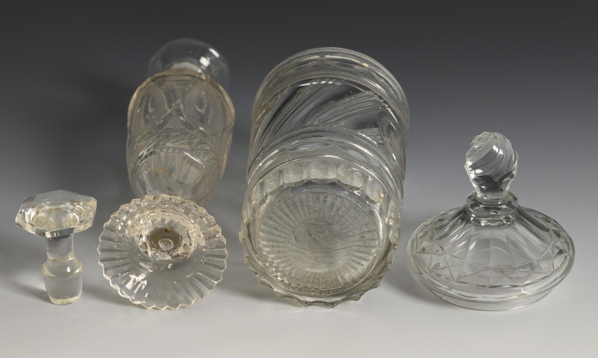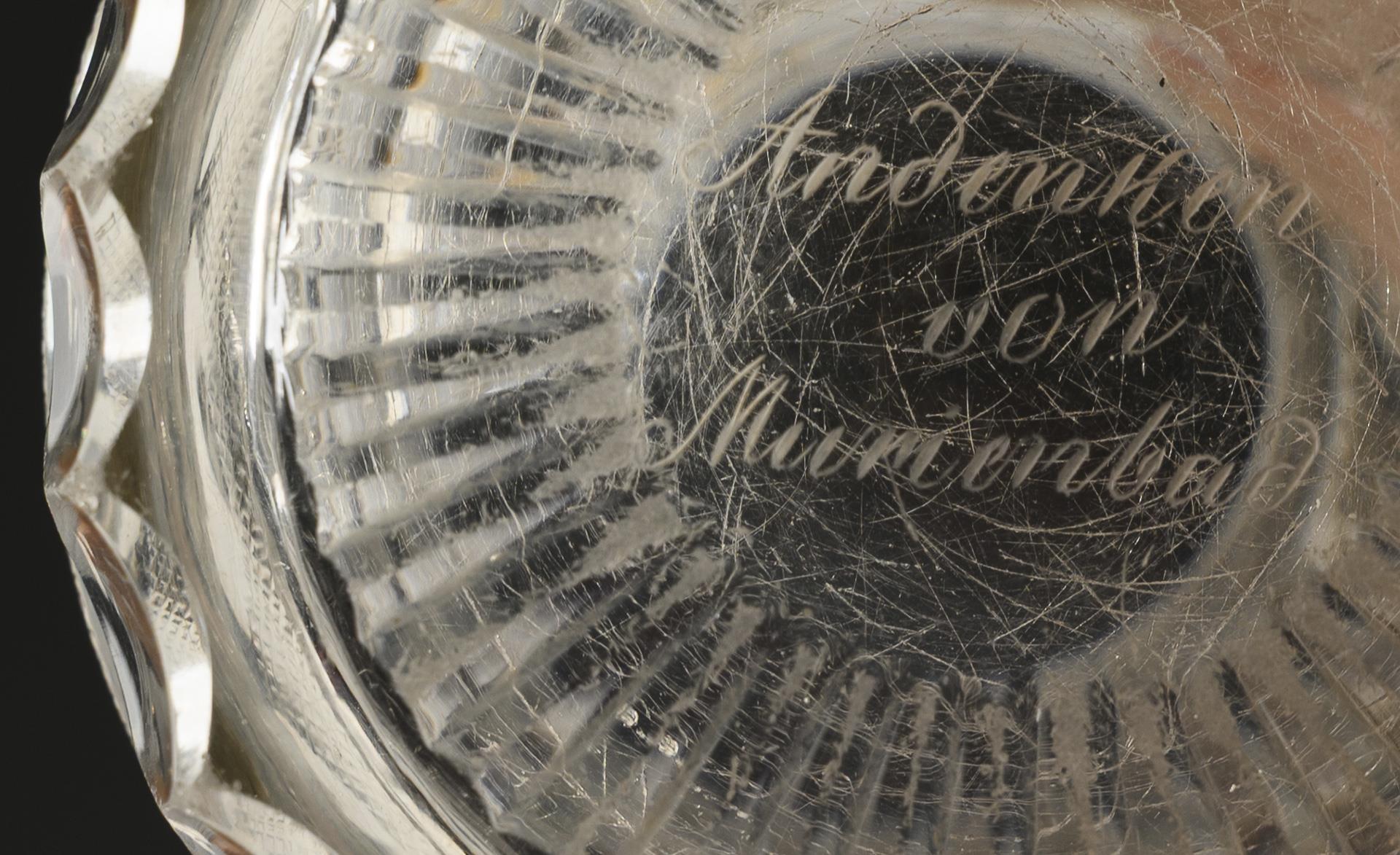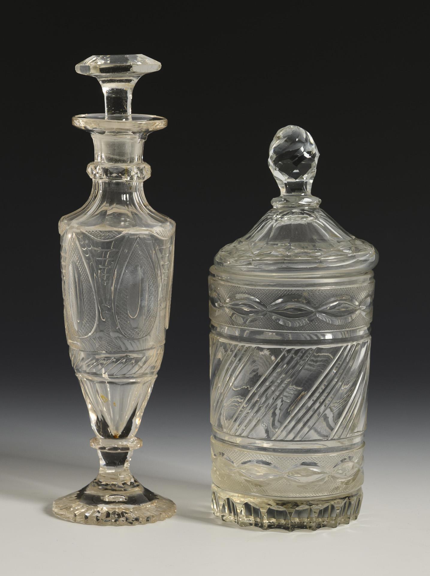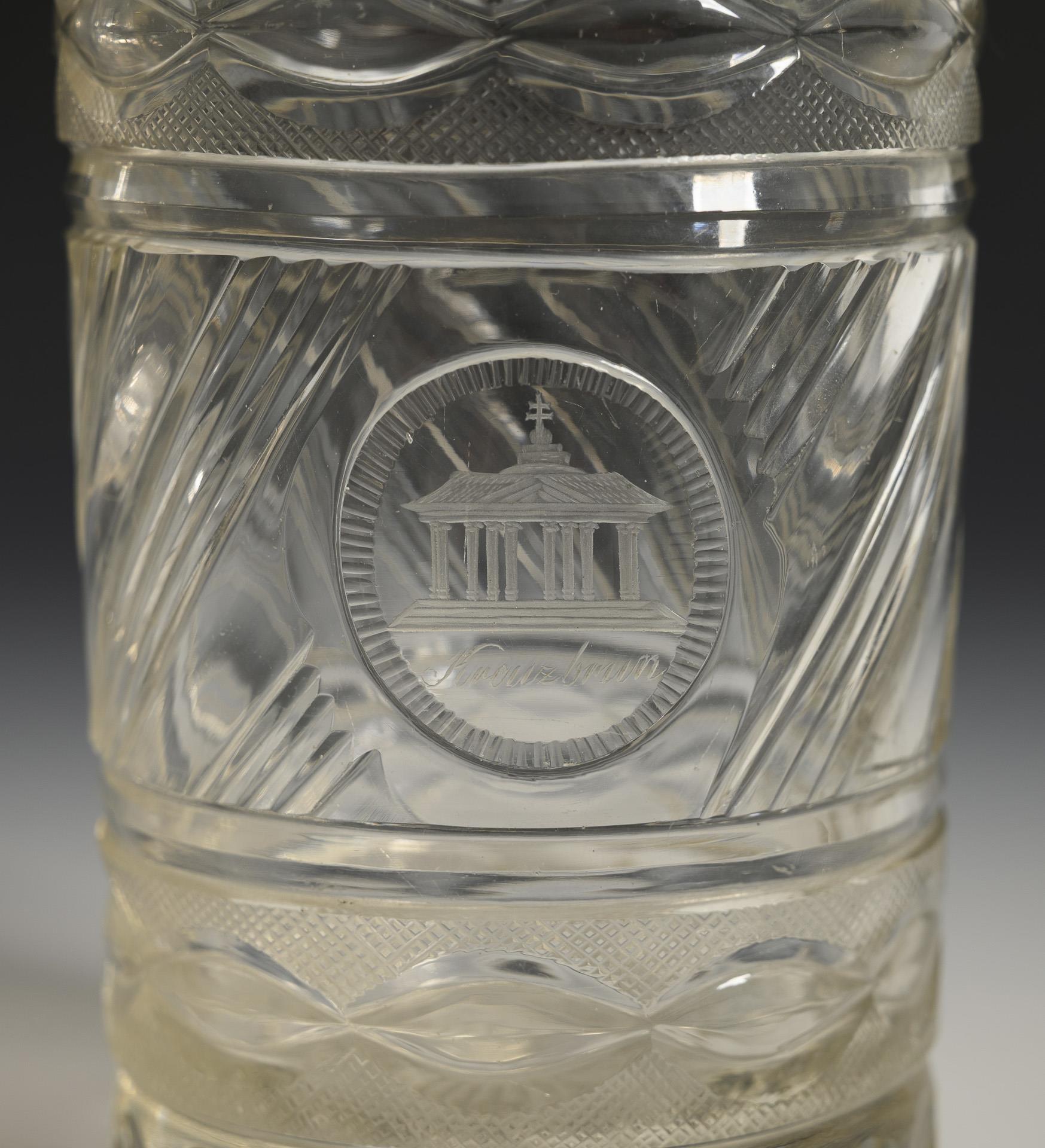 1x Zylinderbecher mit reichem Kerb- und Steinelschliff, schauseitig ein Medaillon mit einer gravierten Architekturdarstellung über der Bezeichung "Neubrunn", im Boden die Bezeichnung "Andenken an Marienbad", dazu ergänzter Knaufdeckel. / 1x schlank-ovoide Karaffe mit Kerb-, Steinel-, Facetten- und Olivenschliff sowie Stopfen. Minimale Bestoßungen am Stand des Bechers, am Deckelrand sowie am Stopfen.