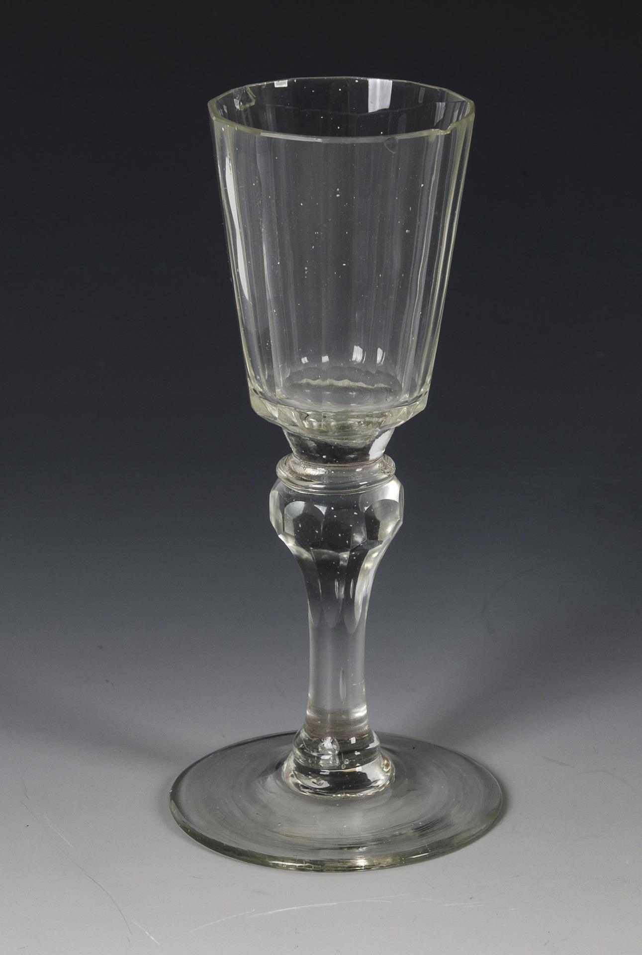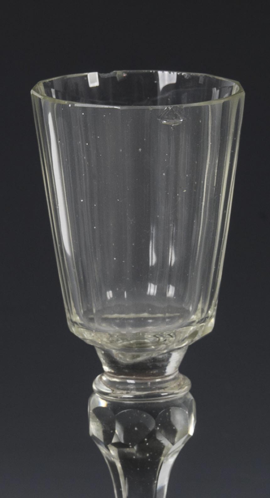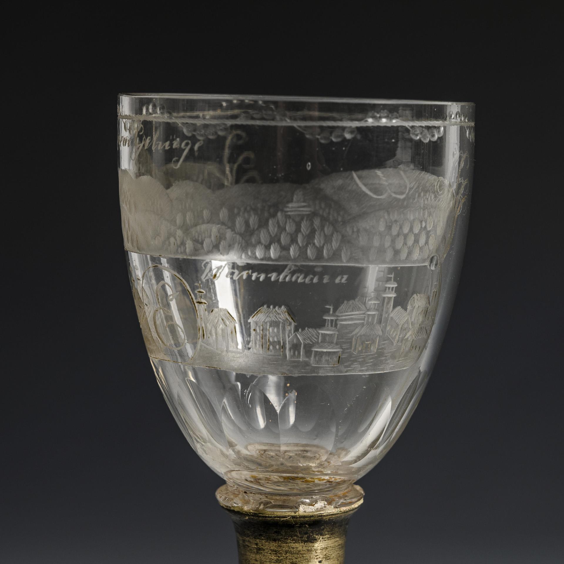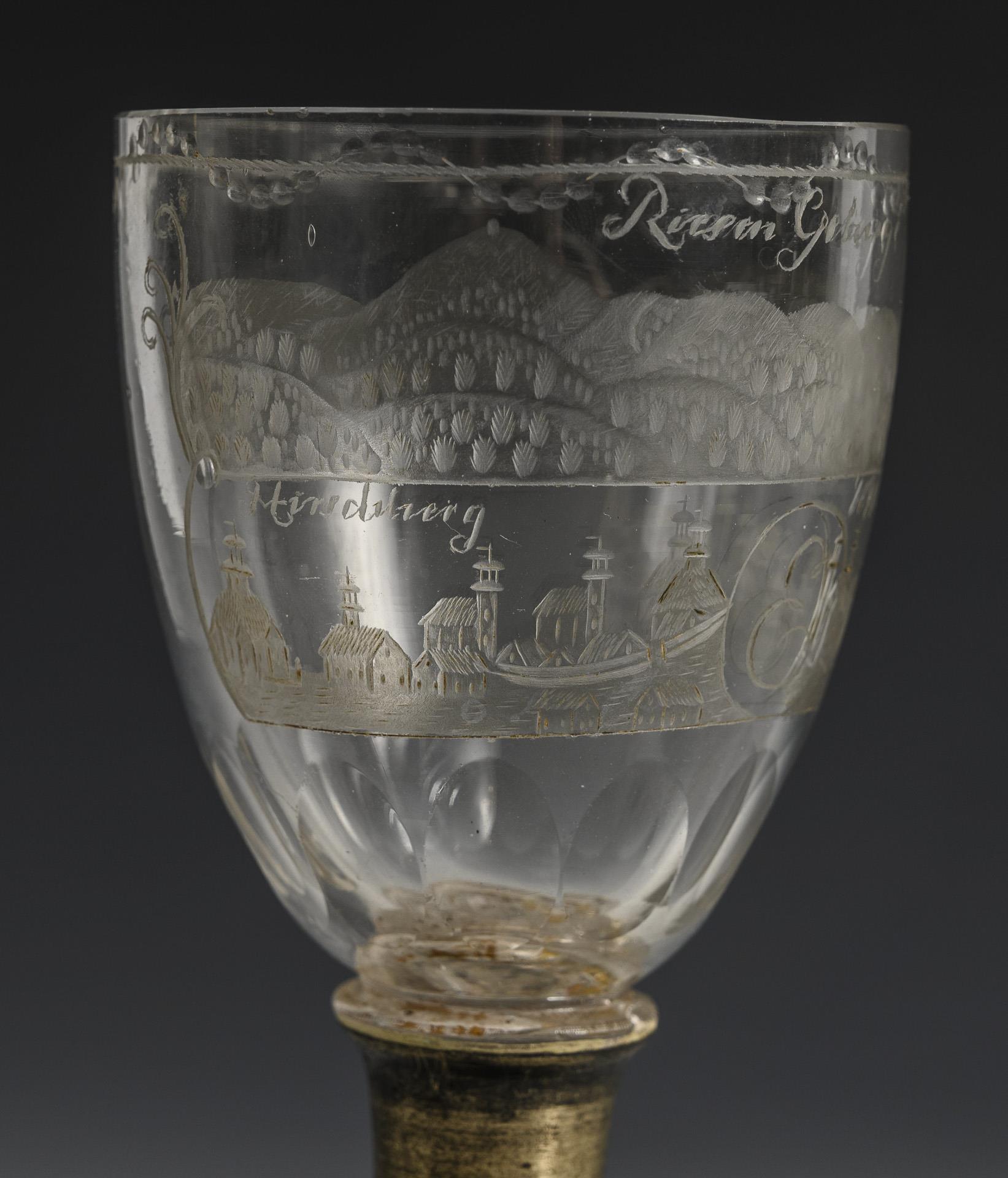 1x barocke, halbovoide Kuppa mit Olivenschliffkranz und gravierten und bezeichneten Ansichten (Riesengebirge / Hirschberg / Warmbrunn). Ergänzter Metallschaft und ergänzter, facettierter Fuß. / 1x facettierte Kuppa, wabenfacettierter Schaft, Rundfuß. Kelchglas mit Bestoßungen.