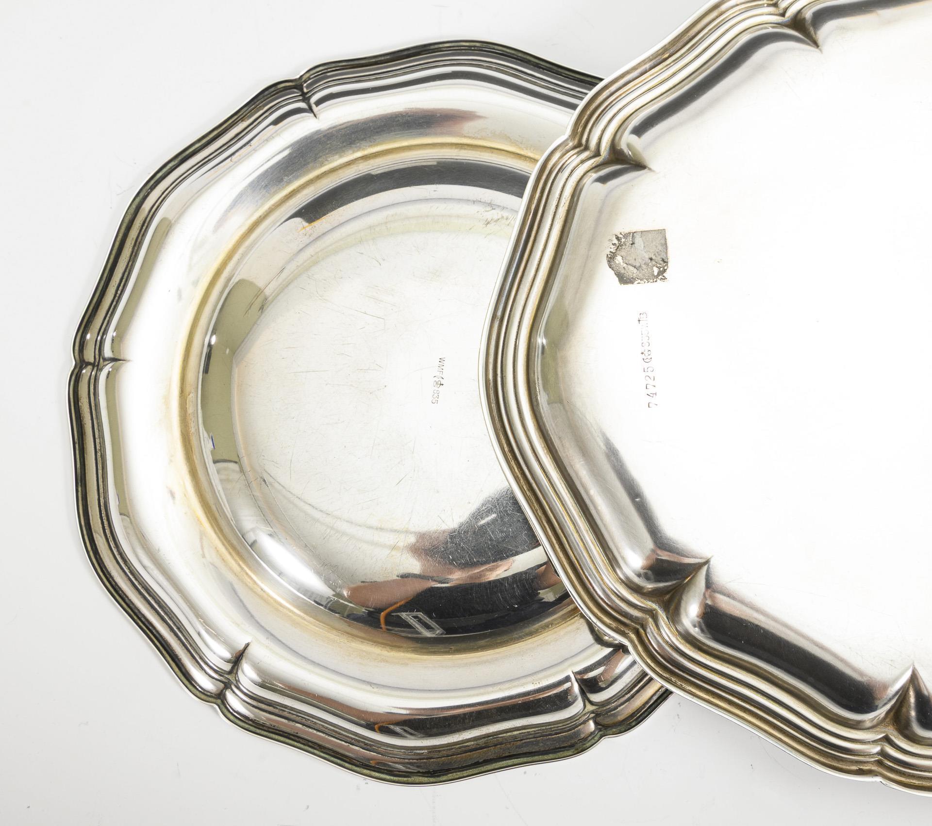 Beide mit geschweiftem Profilrand im Barock-Stil. Ovales Tablett (Wilhelm Binder), L 27,5 cm. / Kleiner runder Teller (WMF), Ø 18 cm. Minimale Gebrauchsspuren.