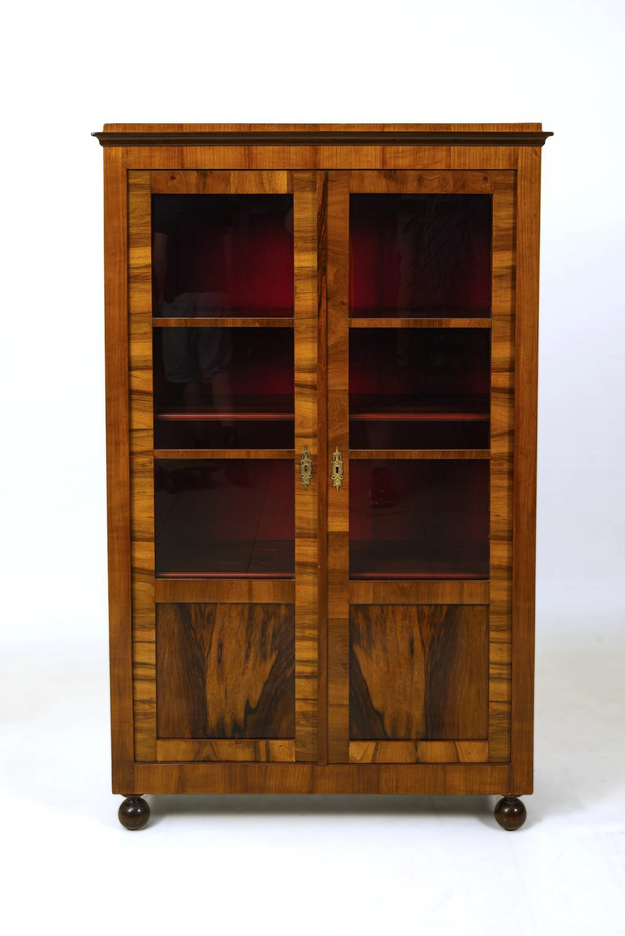 2-türiger, gesprosst verglaster Korpus mit Kranzgesims und Frontkassettierung im Sockelbereich, auf 2 Kugel- und 2 Klotzfüßen. Historisierende Messing-Schlüssellochbeschläge. Innen rot gefasst, mit 4 höhenverstellbaren Einlegeböden.